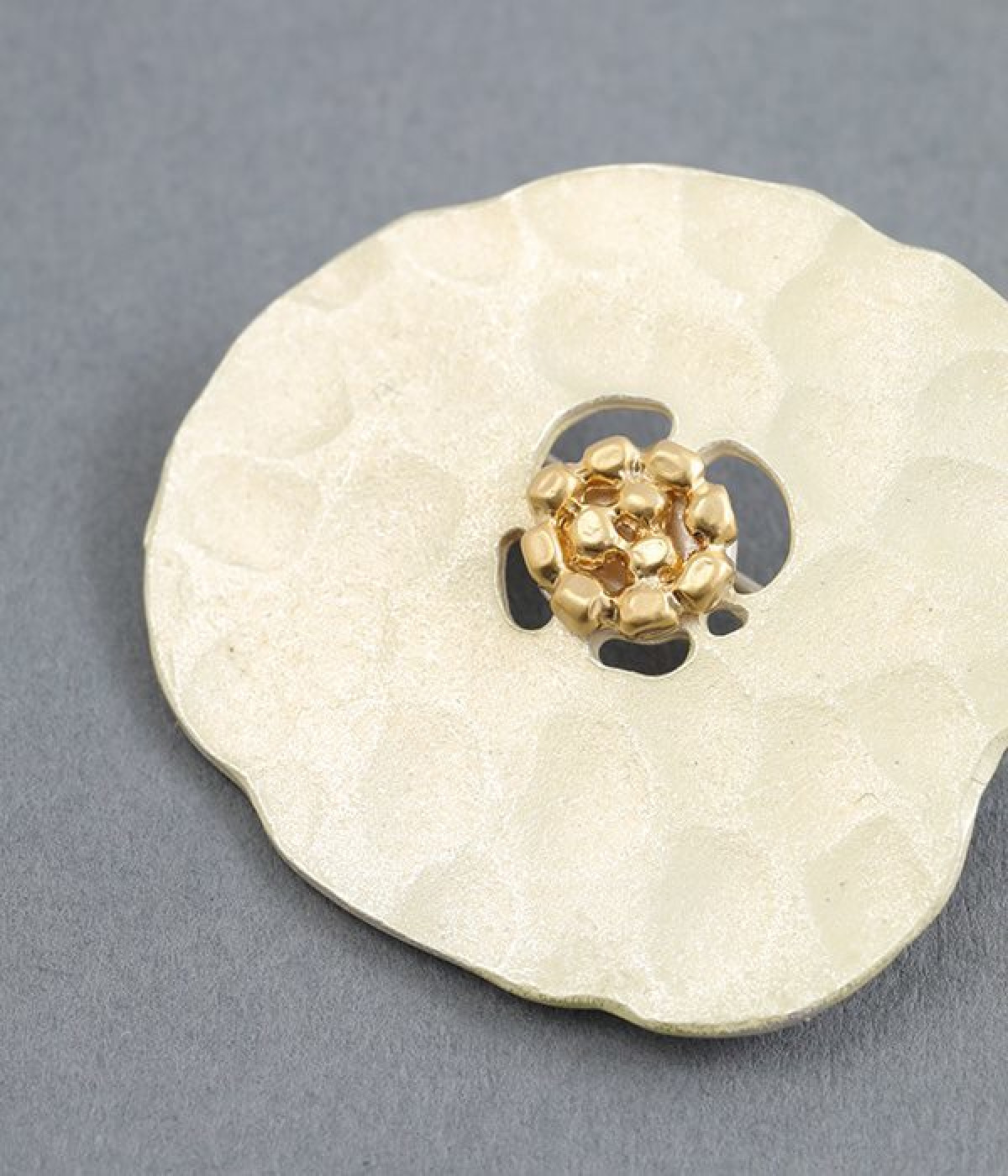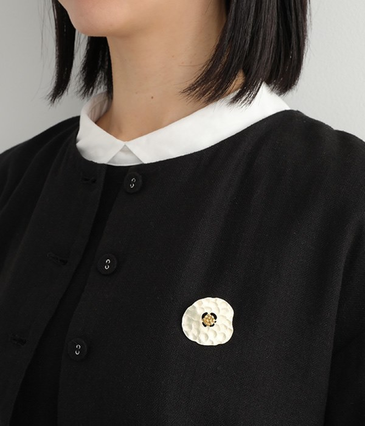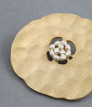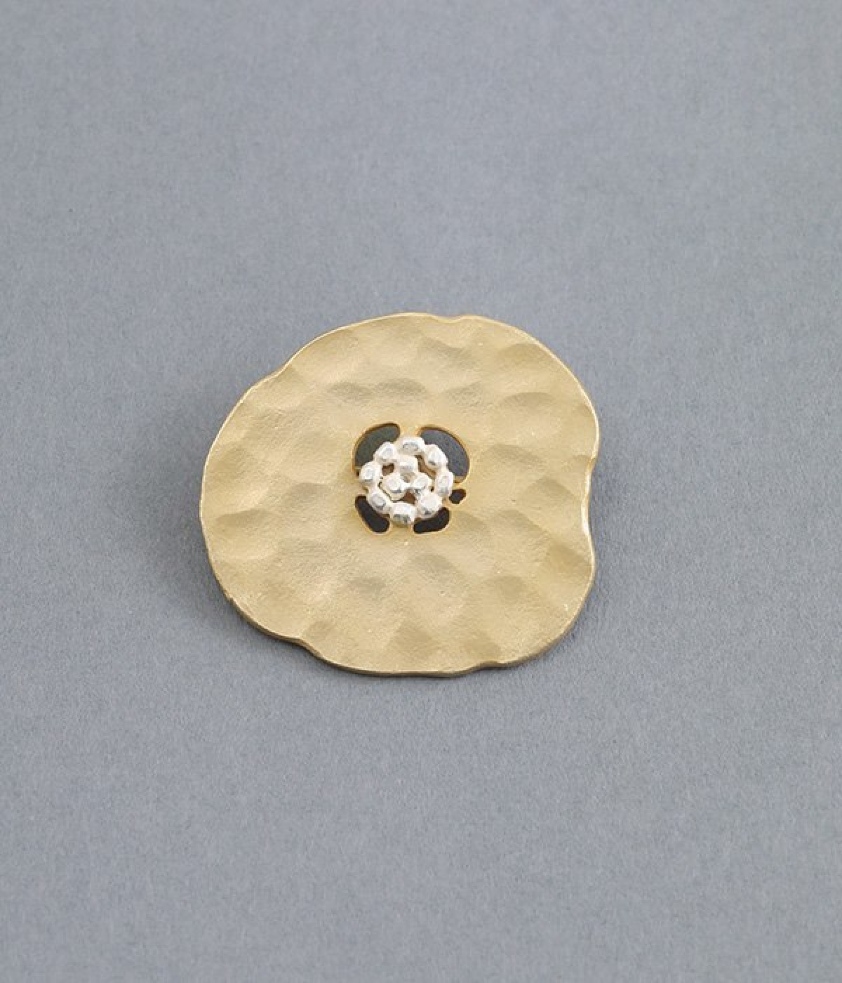 花が開いたようなシルエットと、花芯をイメージしたメタルの粒を集めたようなパーツを組み合わせた、フラワーモチーフをイメージしたブローチです。花のプレートには緩やかな槌目のテクスチャーを施し、ニュアンスたっぷりに仕上げました。中心のパーツとメタルの配色コンビが魅力で、カジュアルにもきれいめな装いにも、上品な彩りを添えてくれます。