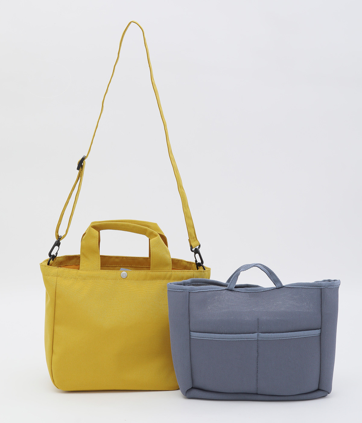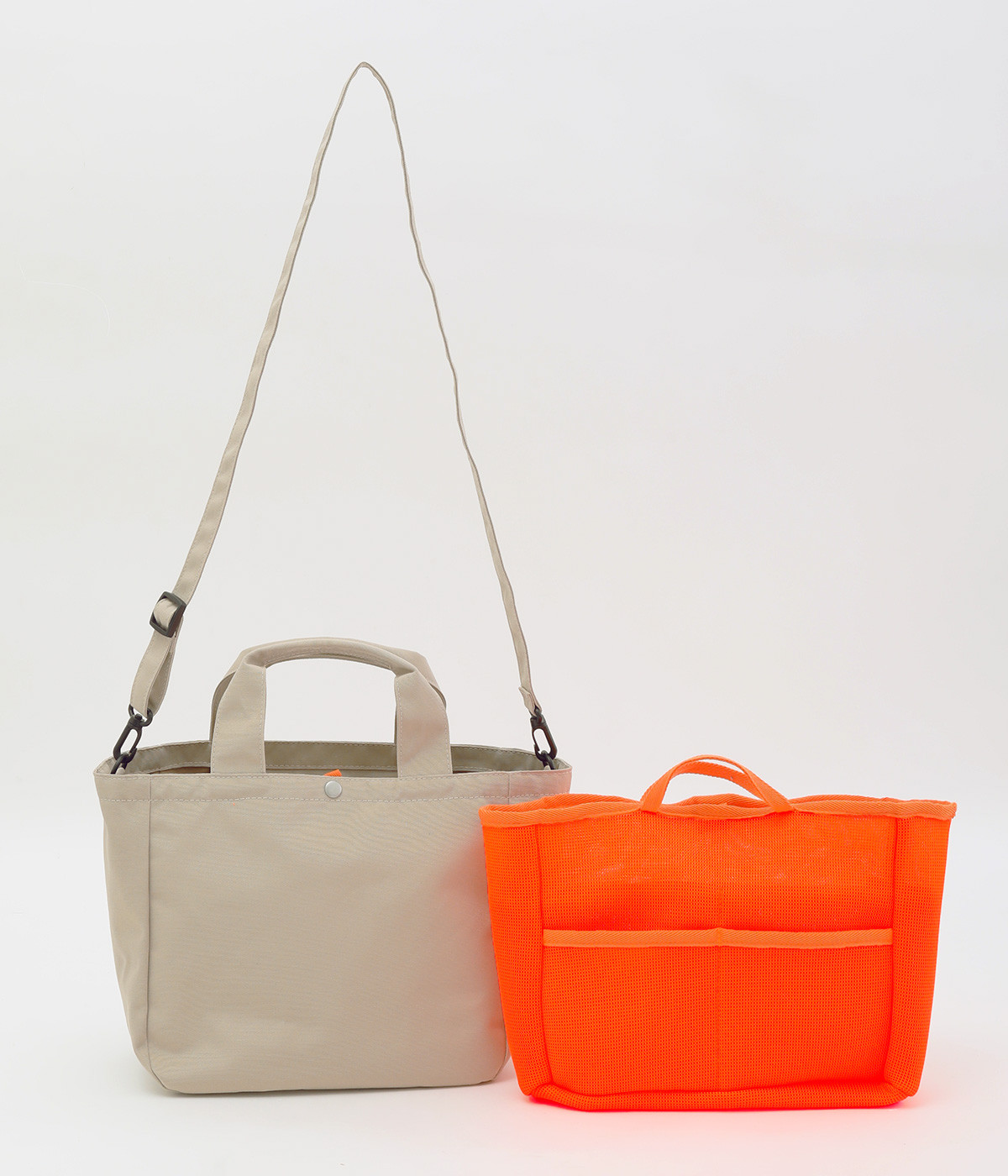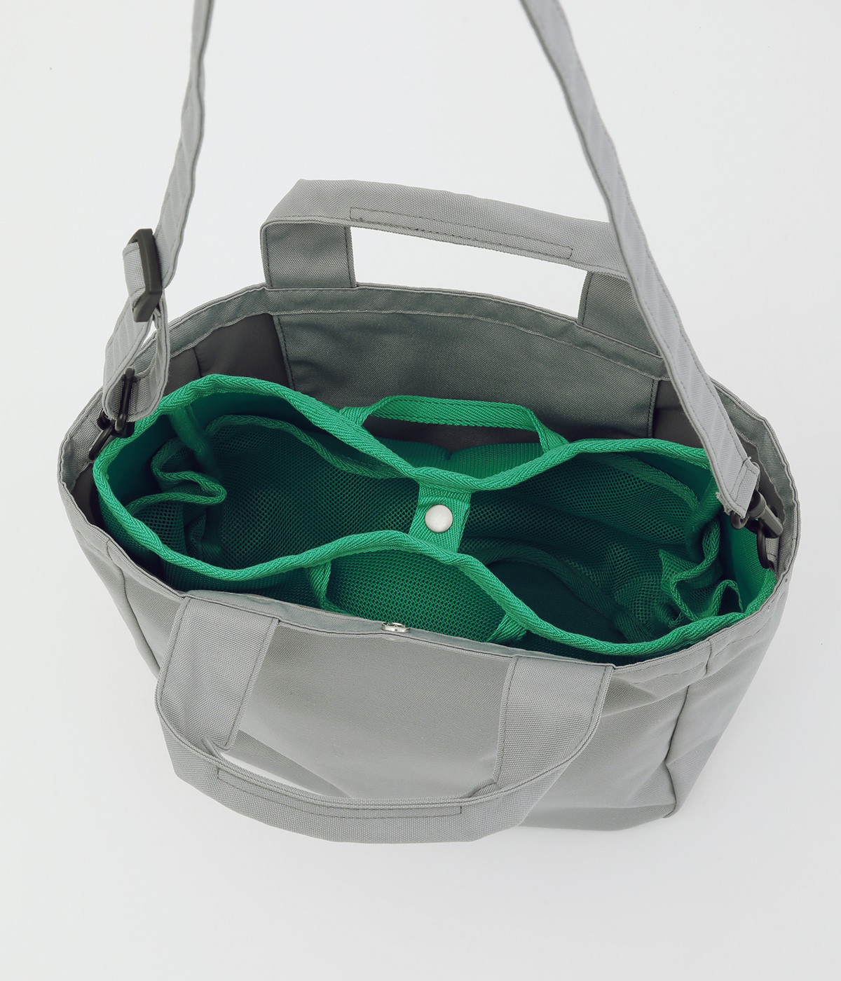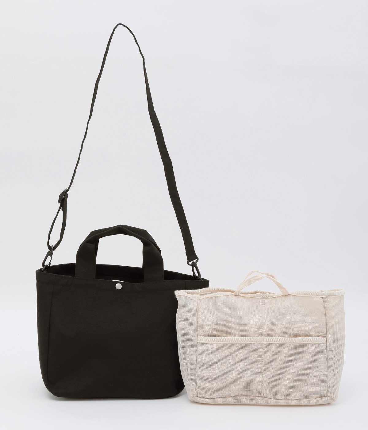 取り外し可能なメッシュのインナーバッグがついたセットアイテム。インナーバッグはペットボトルや折り畳み傘も収納でき、手持ちの他のバッグと組み合わせても便利。本体は中を隠せるフラップつきで、ショルダーにも手提げにもなる2way仕様。