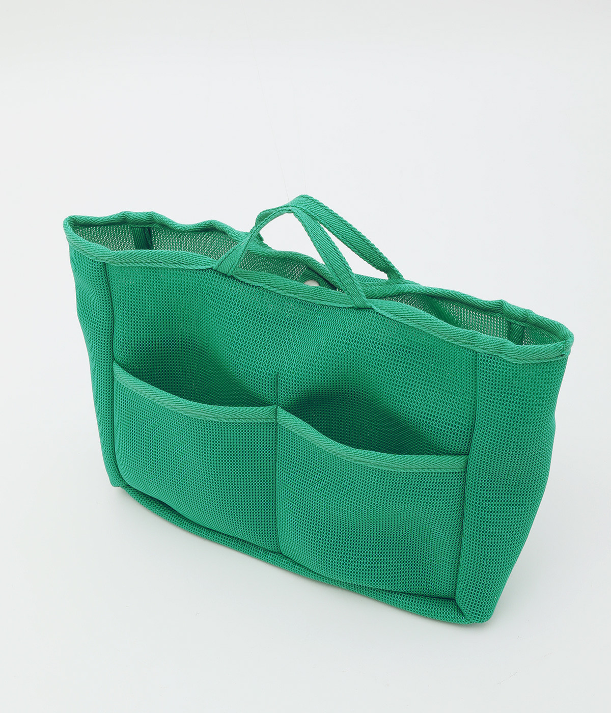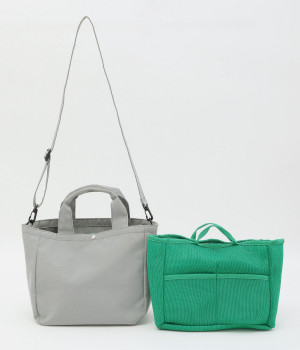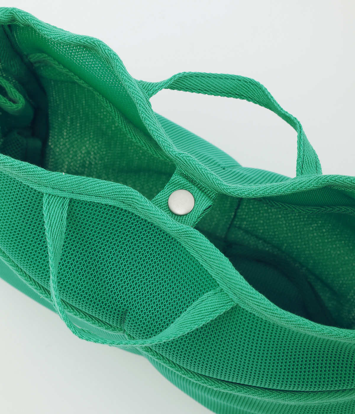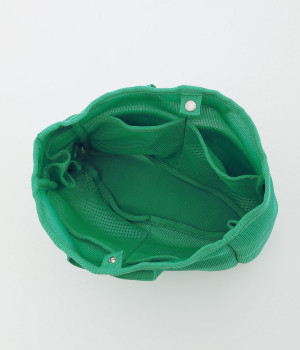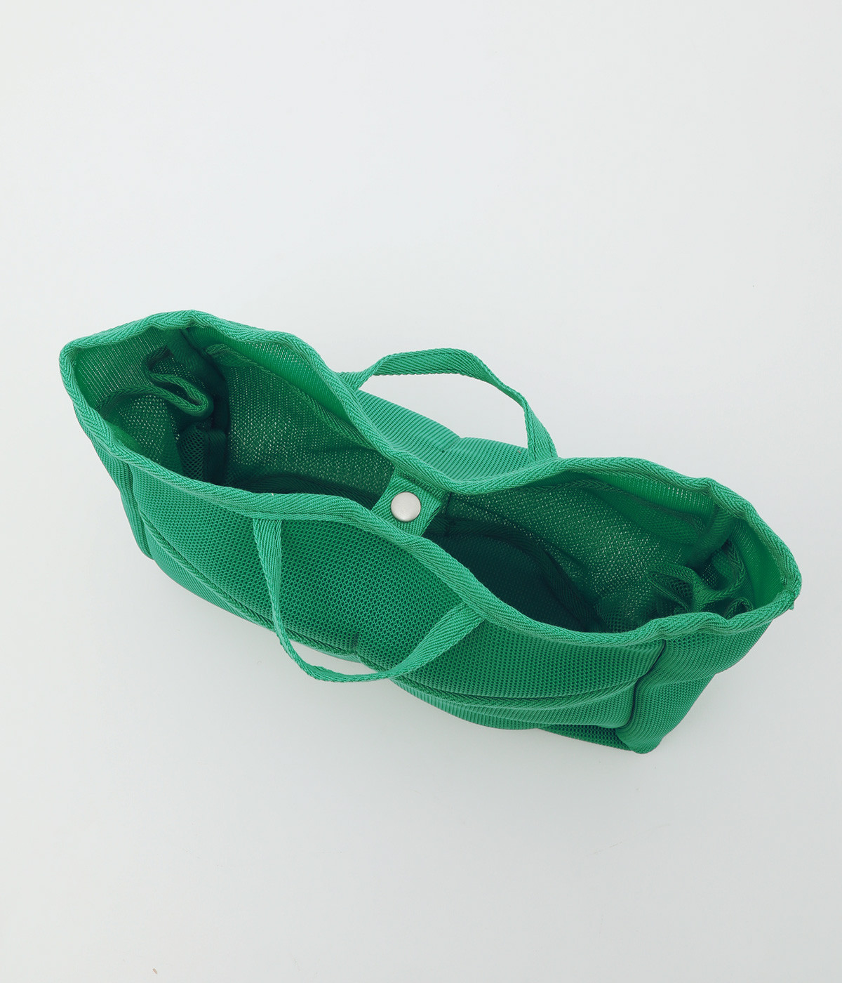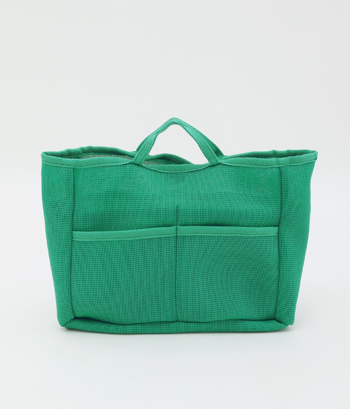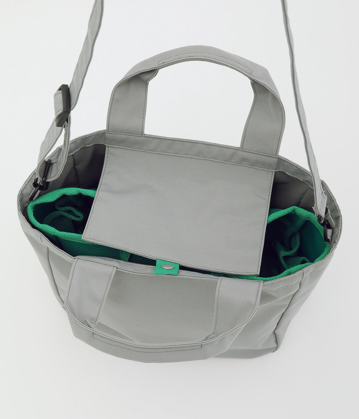 取り外し可能なメッシュのインナーバッグがついたセットアイテム。インナーバッグはペットボトルや折り畳み傘も収納でき、手持ちの他のバッグと組み合わせても便利。本体は中を隠せるフラップつきで、ショルダーにも手提げにもなる2way仕様。