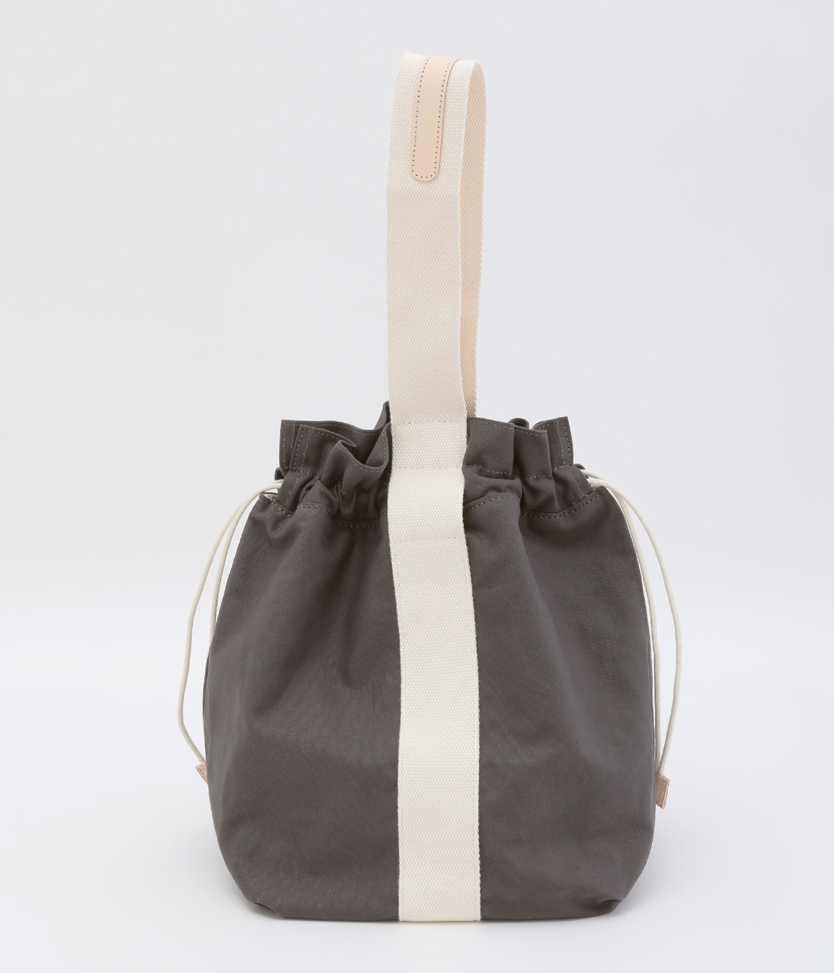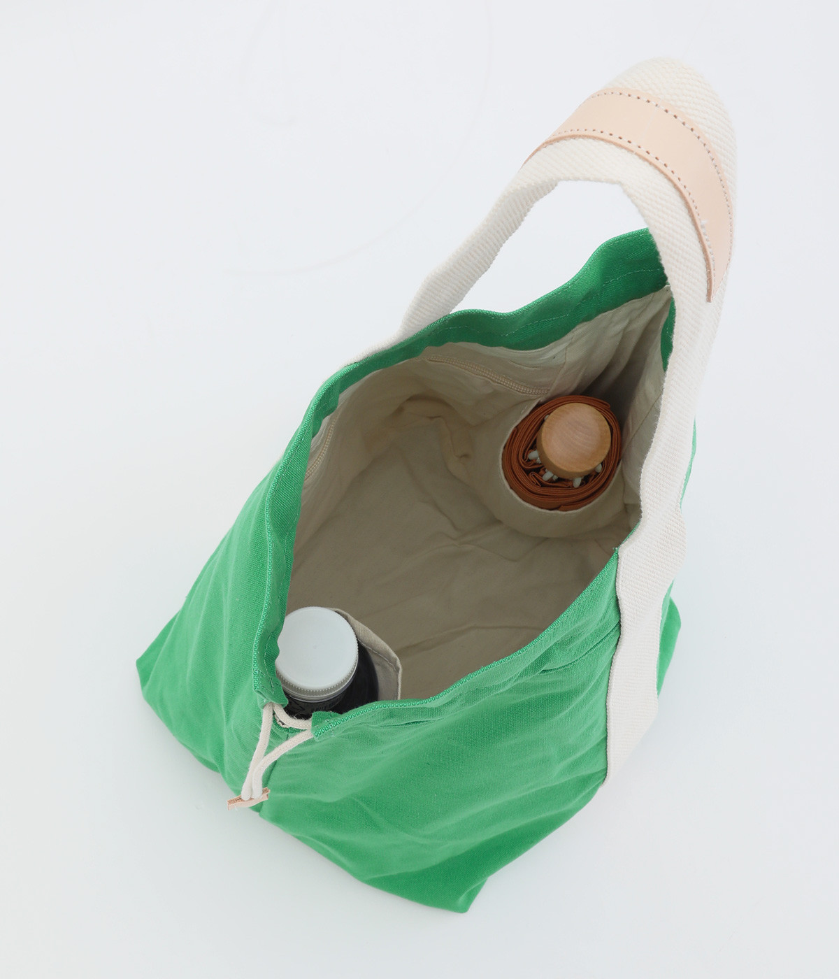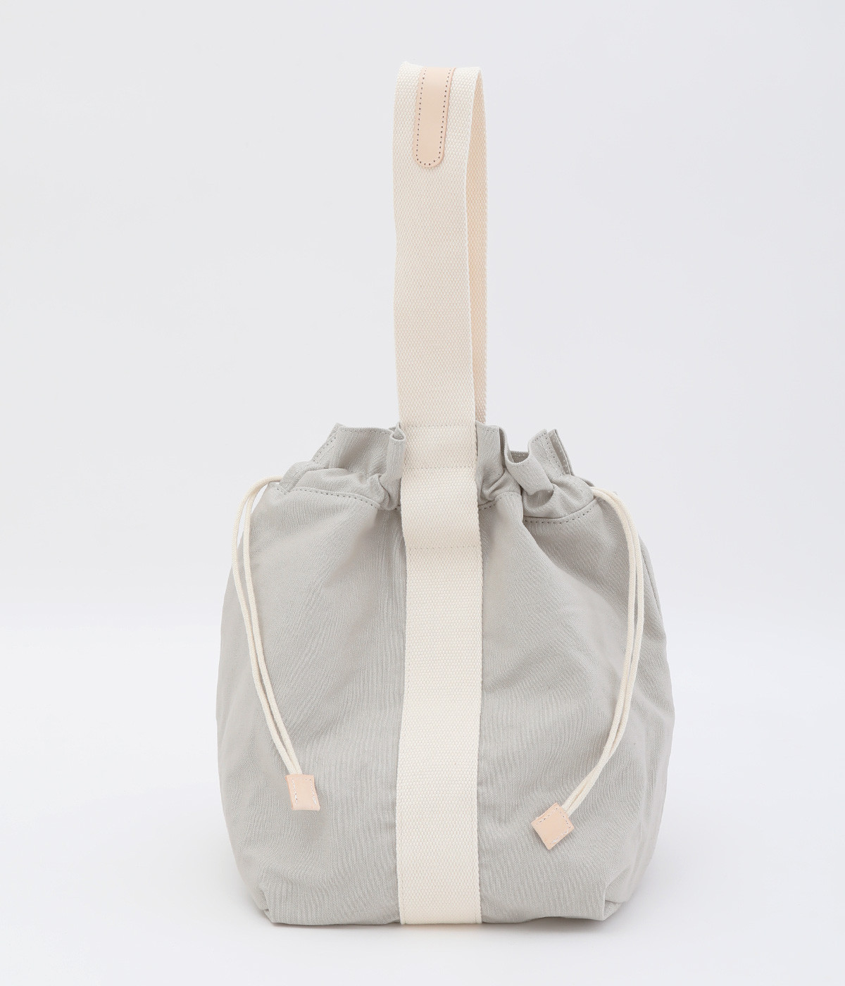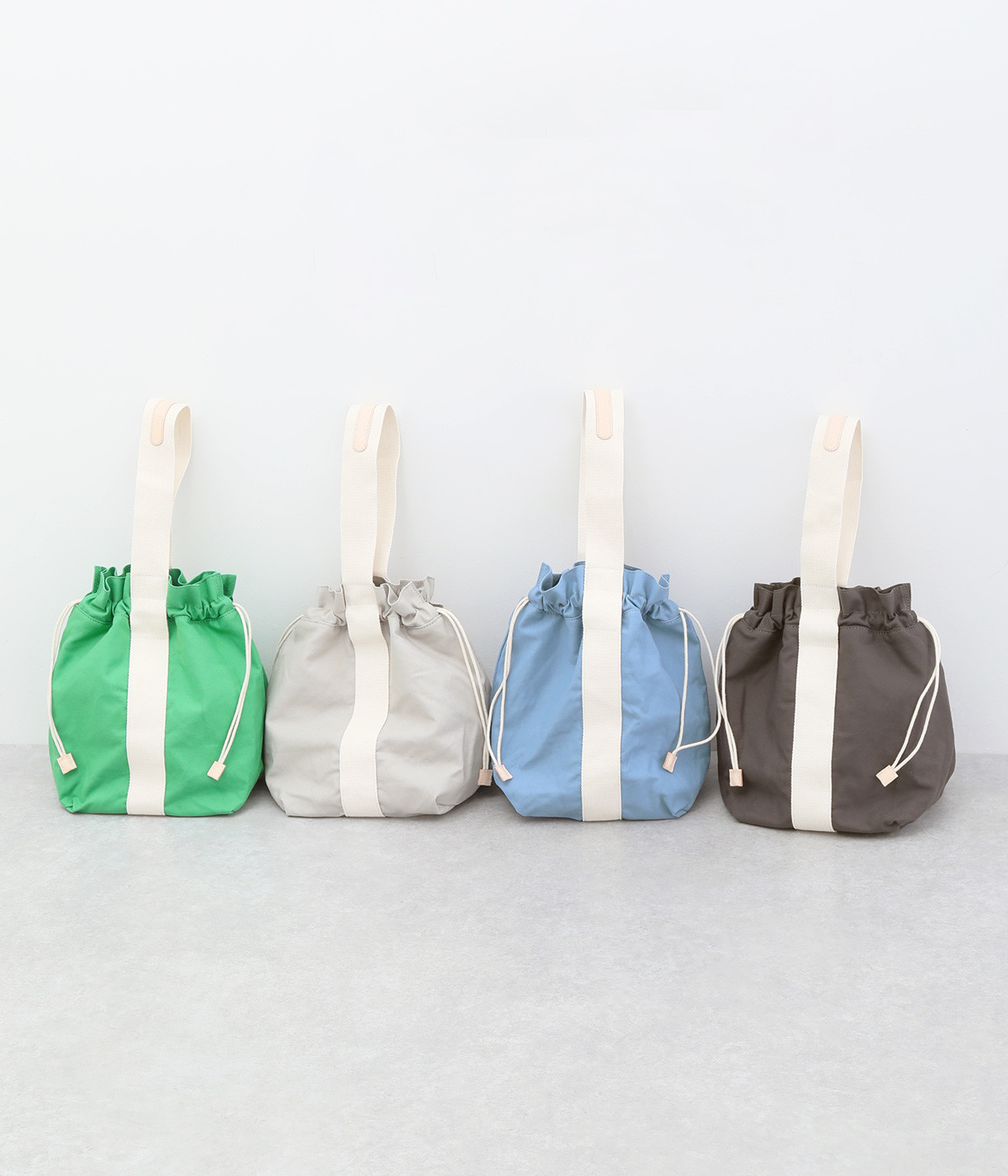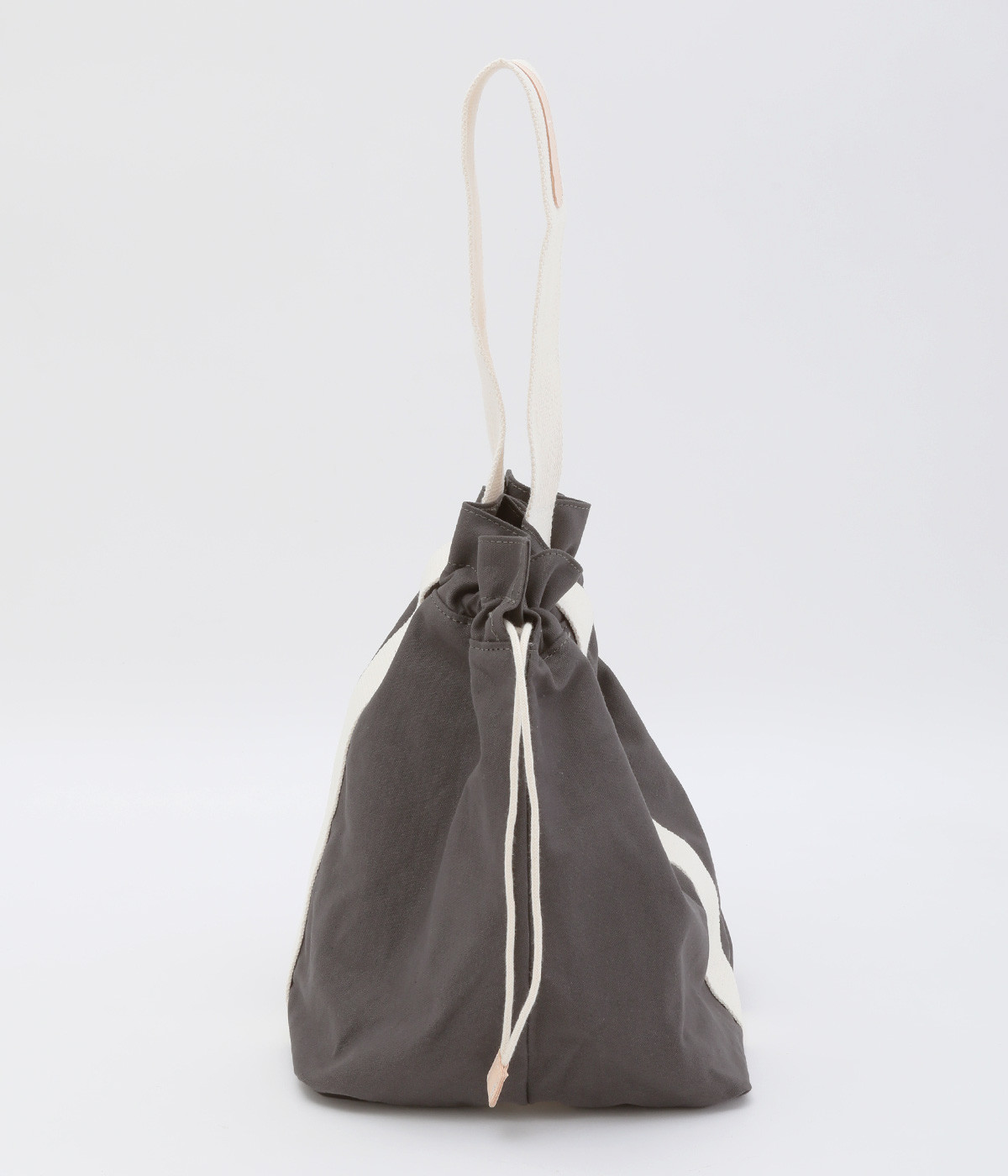 本体は薄手でやわらかな風合いのコットンキャンバスを使用。巾着紐先端とハンドルにヌメ色のレザーをつけて大人仕様にアップデート。綿の裏地つきで強度も高めています。