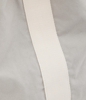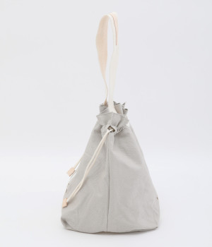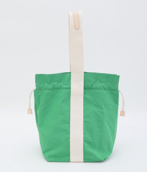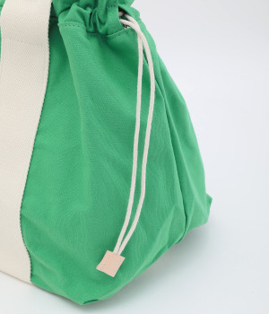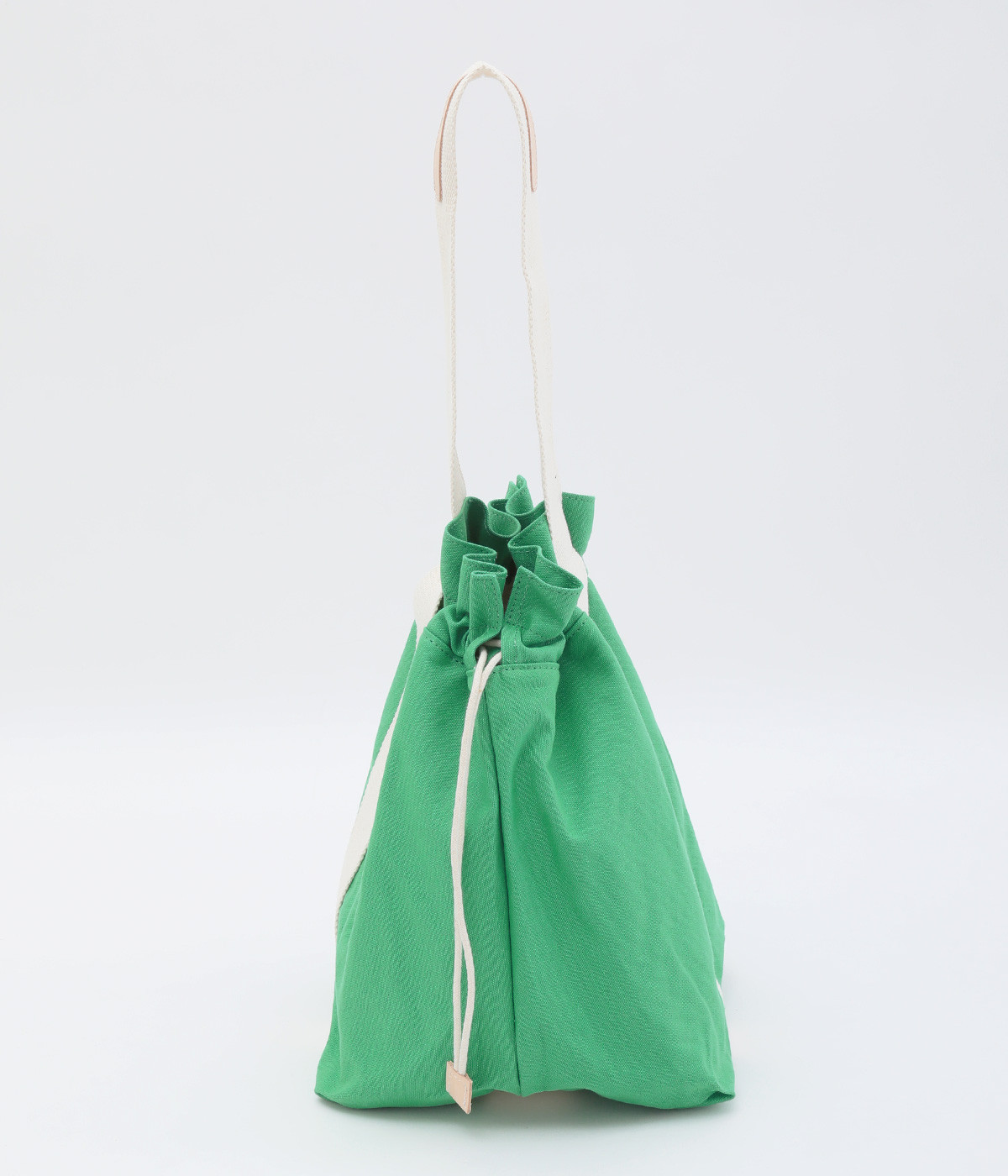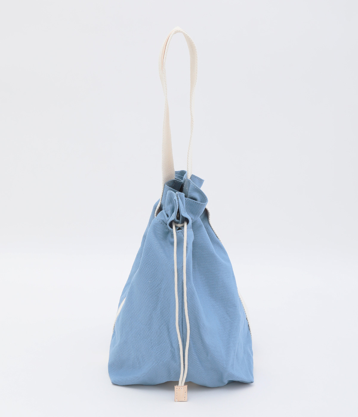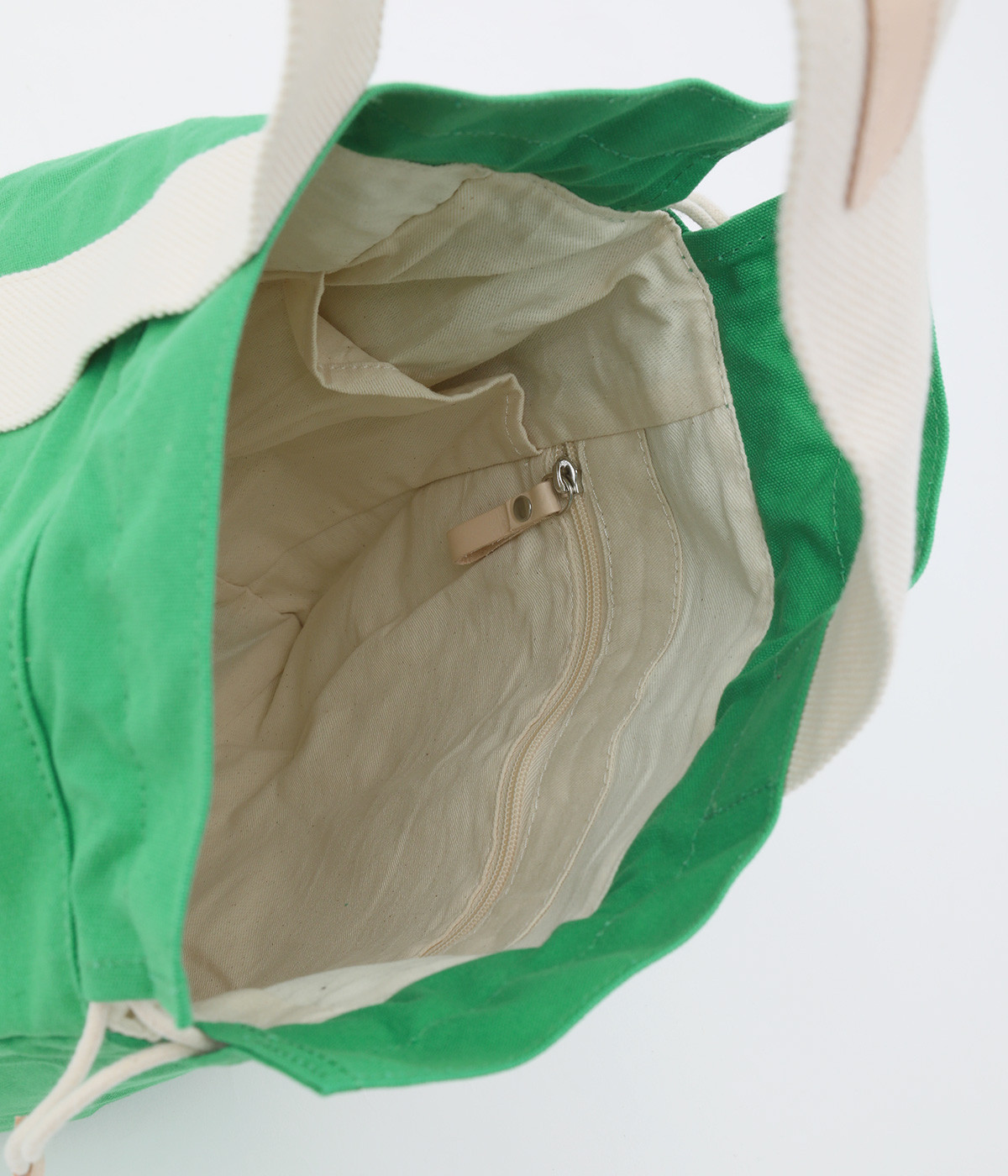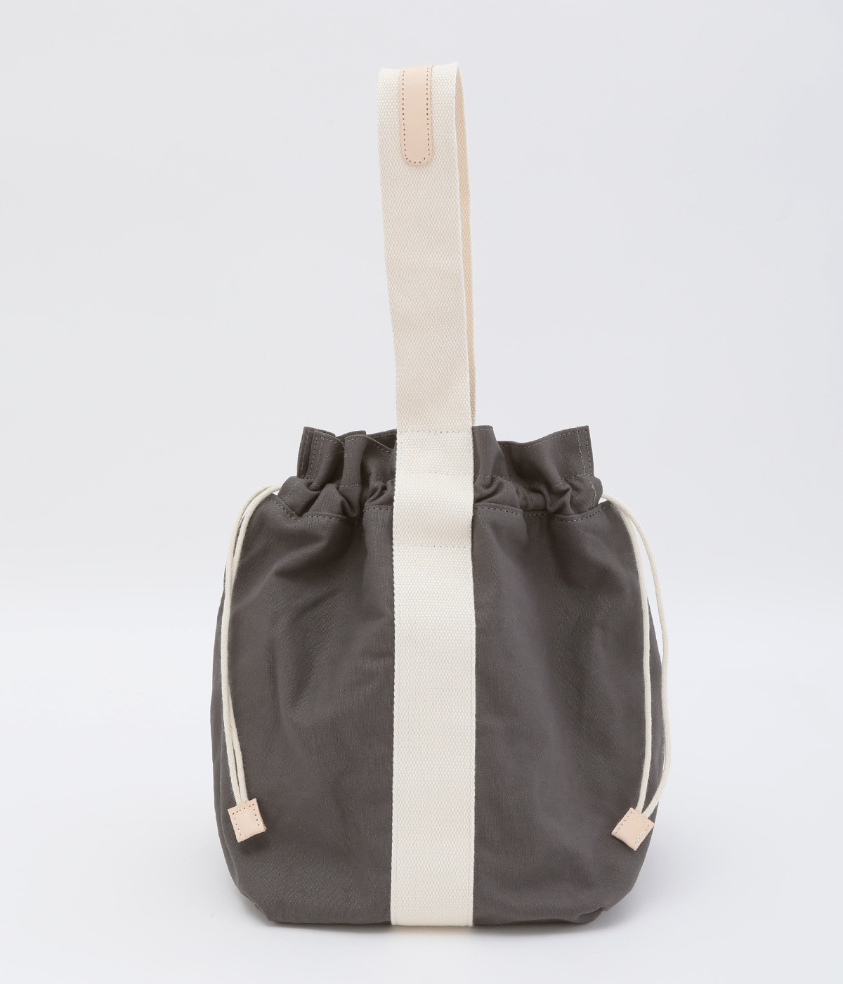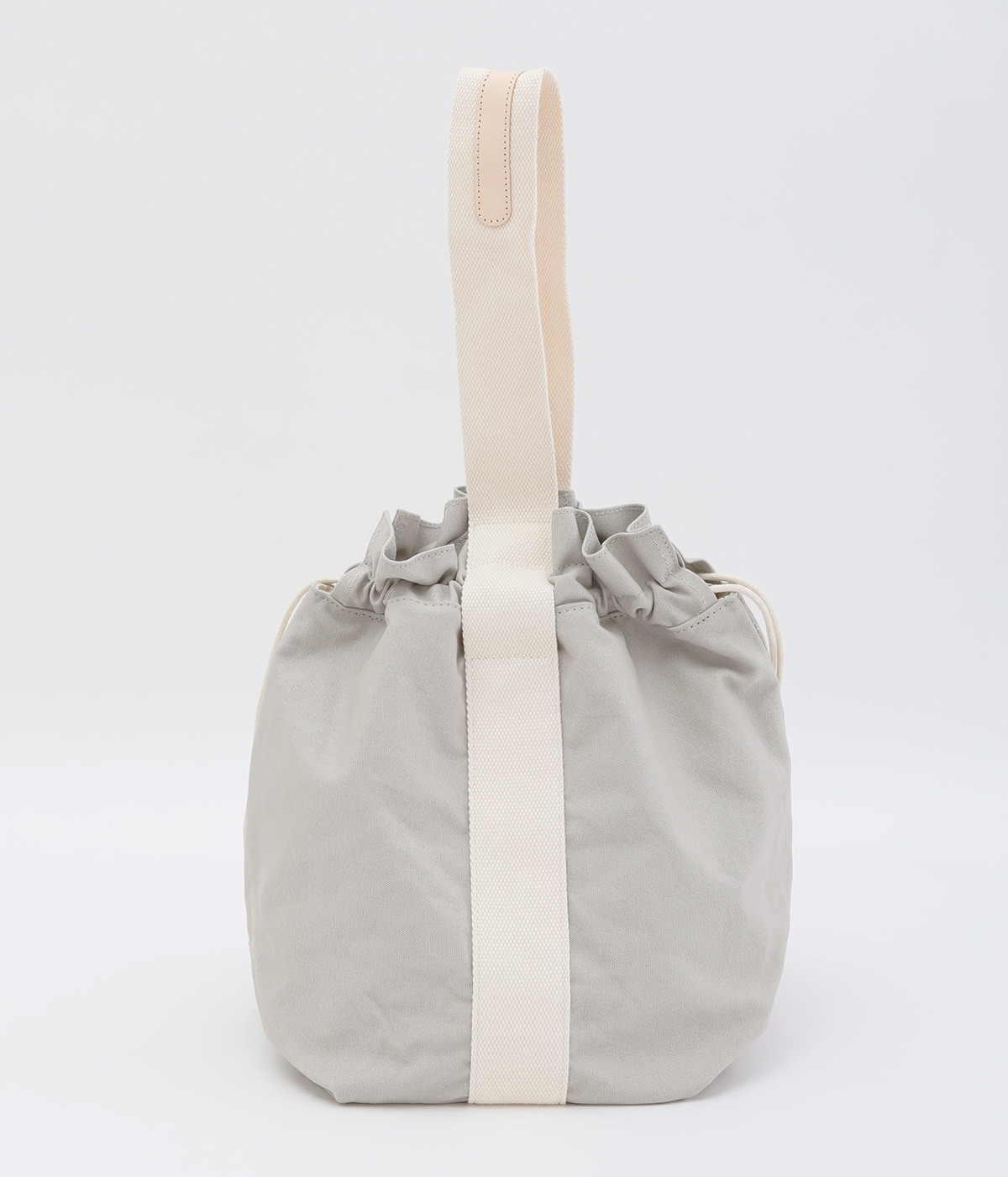 本体は薄手でやわらかな風合いのコットンキャンバスを使用。巾着紐先端とハンドルにヌメ色のレザーをつけて大人仕様にアップデート。綿の裏地つきで強度も高めています。