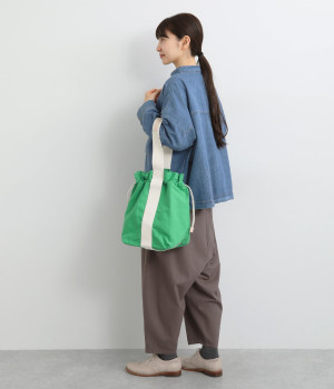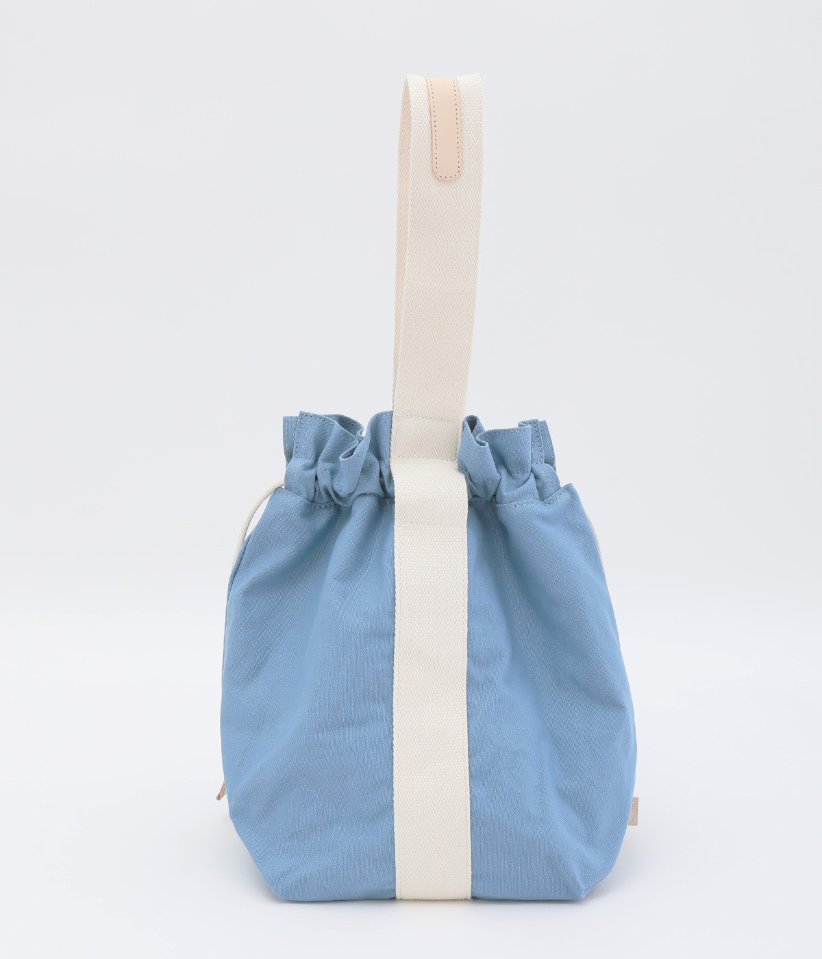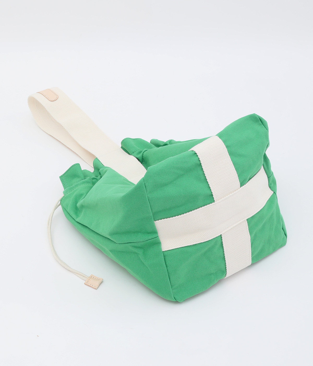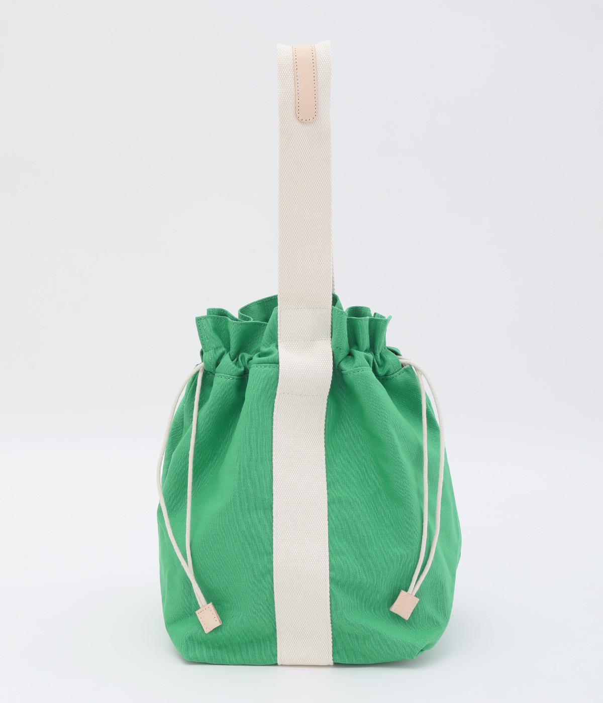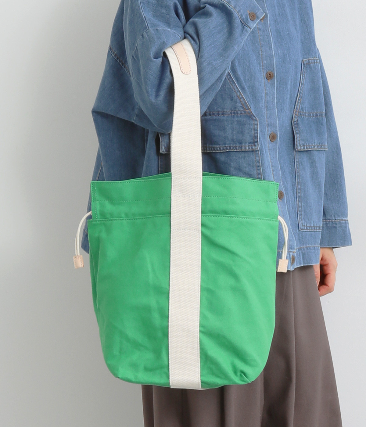 発色の良いキャンバスにホワイトカラーの幅広テープが目を惹くワンハンドルトート。本体は巾着タイプで、紐をしぼると表情にも変化が。ハンドルは肩掛け可能な長め設定で、荷物も取り出しやすく肩の負担を軽減してくれる効果もあります。