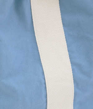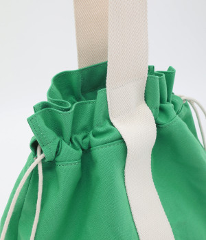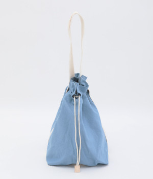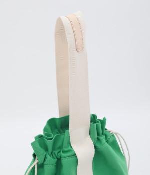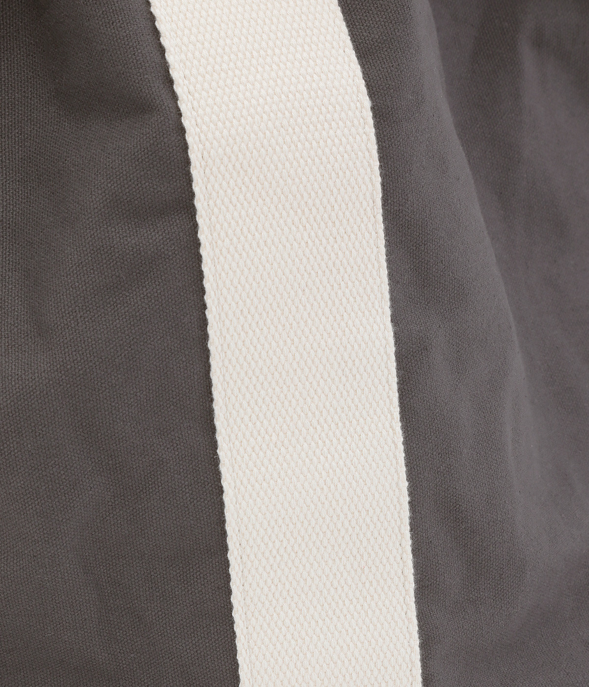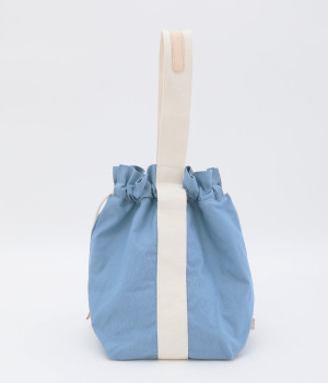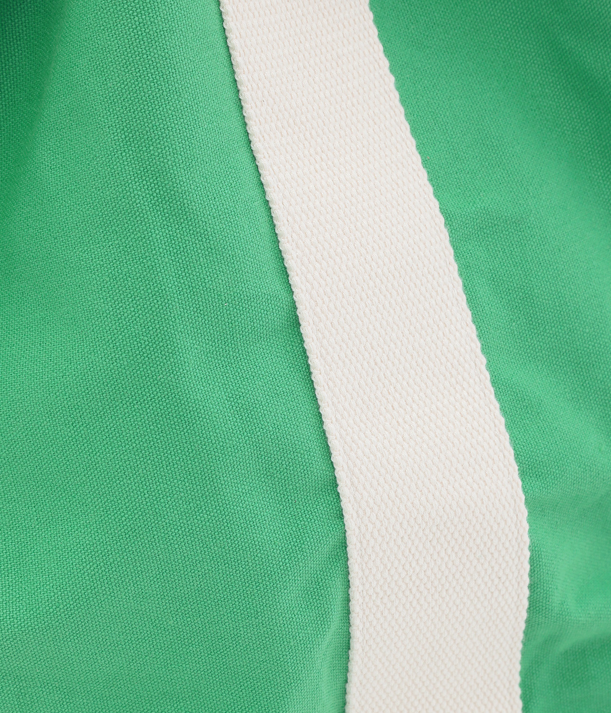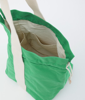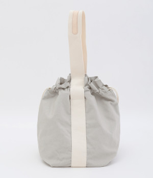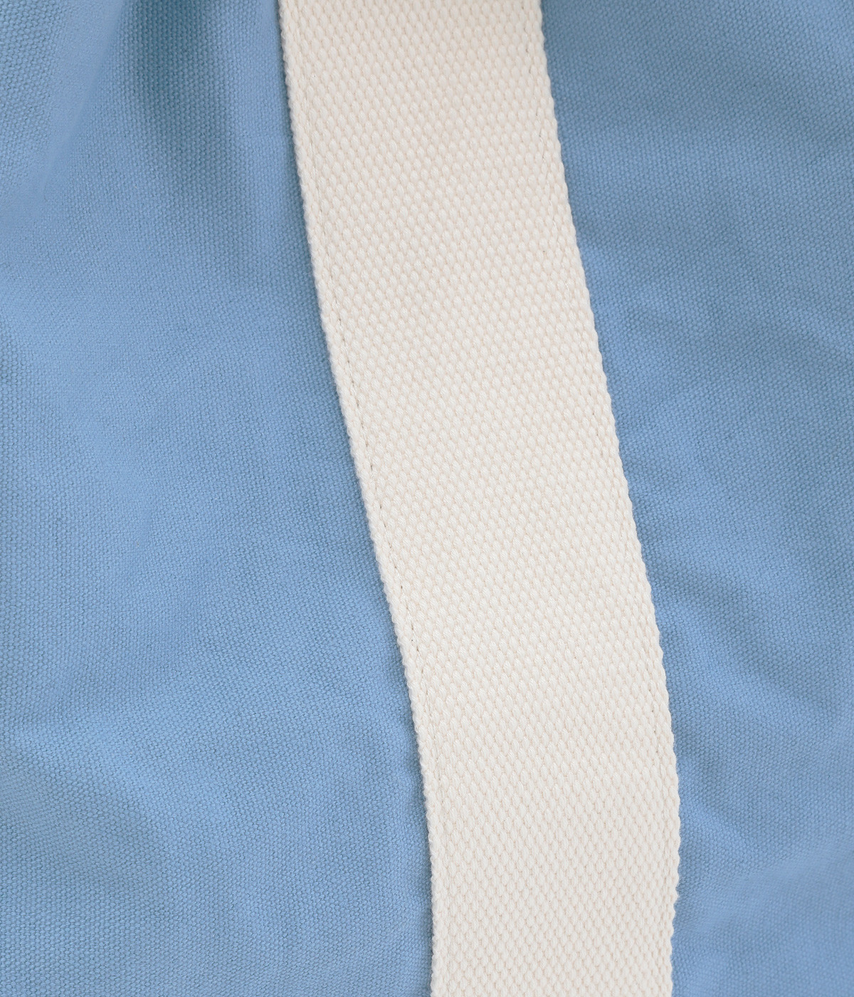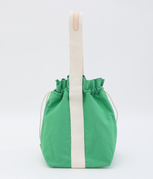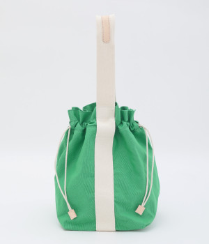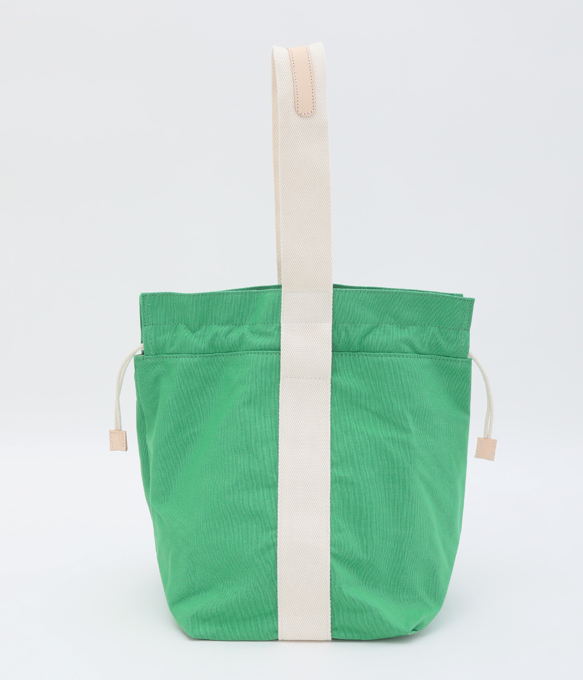 発色の良いキャンバスにホワイトカラーの幅広テープが目を惹くワンハンドルトート。本体は巾着タイプで、紐をしぼると表情にも変化が。ハンドルは肩掛け可能な長め設定で、荷物も取り出しやすく肩の負担を軽減してくれる効果もあります。