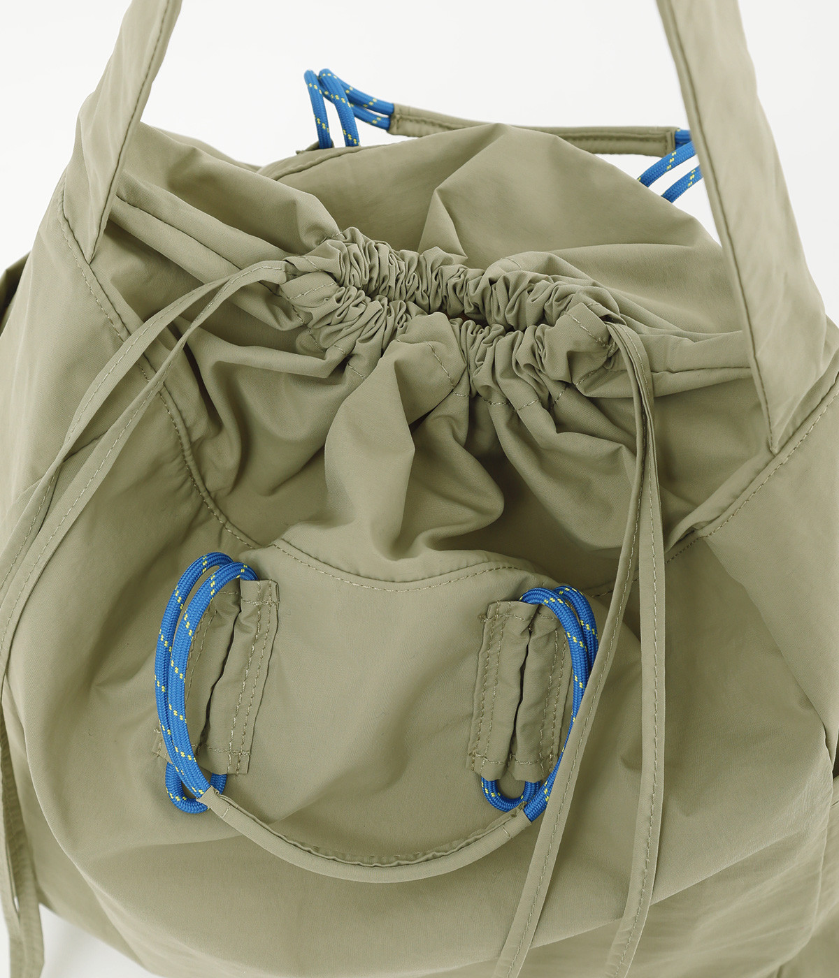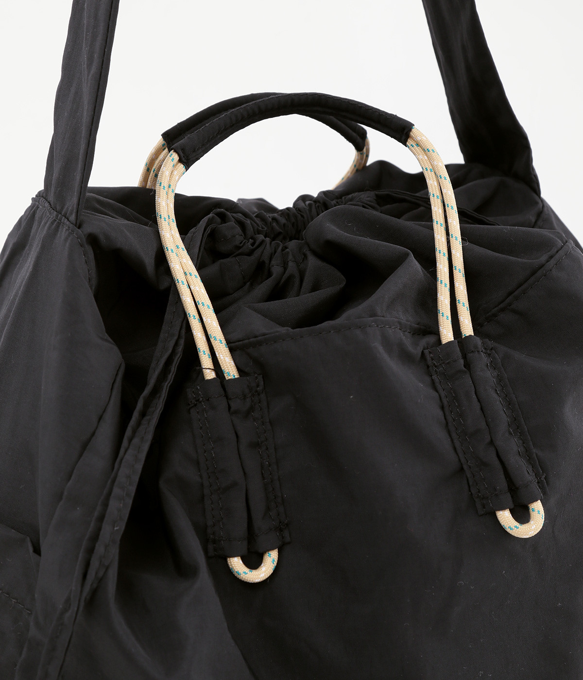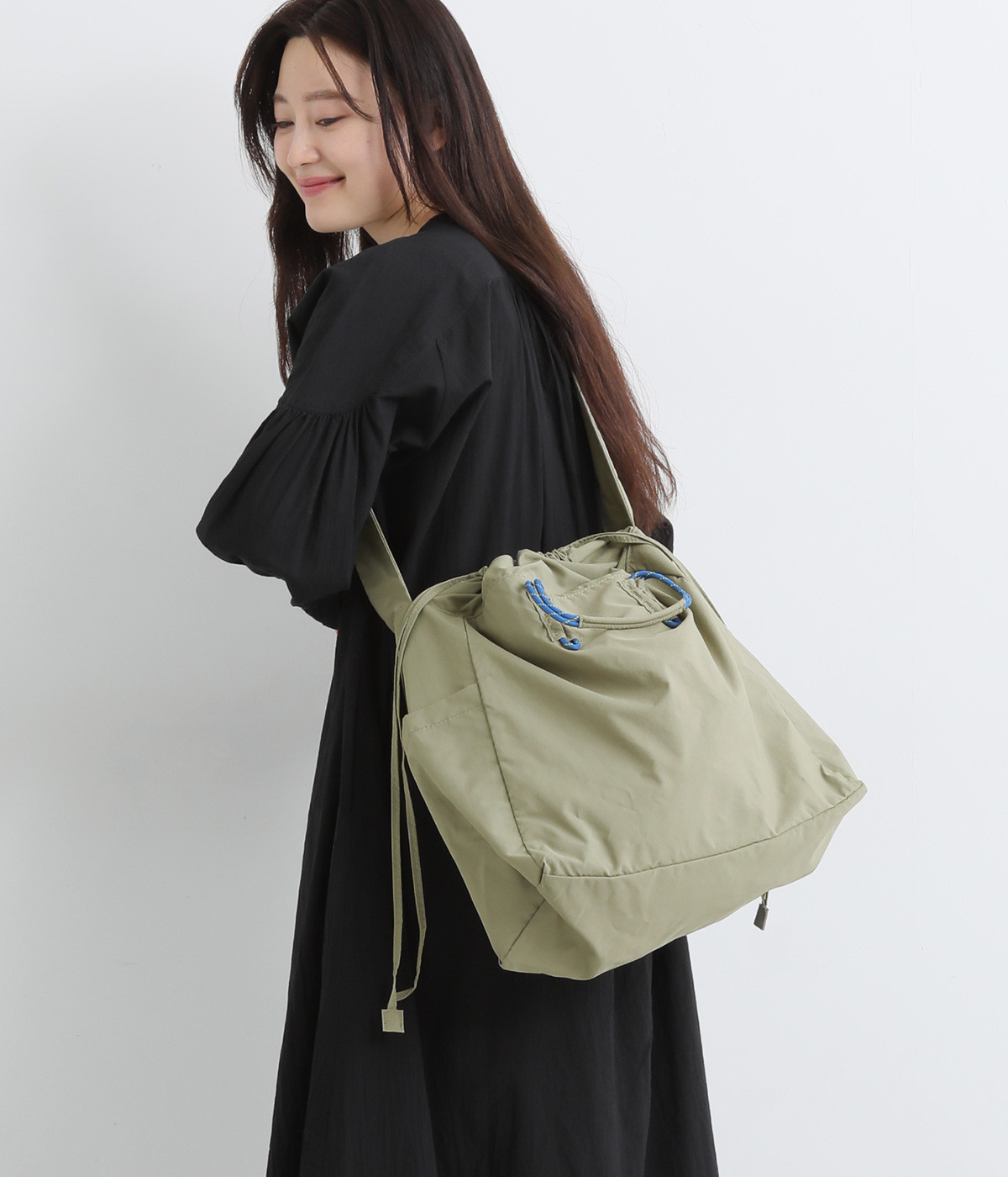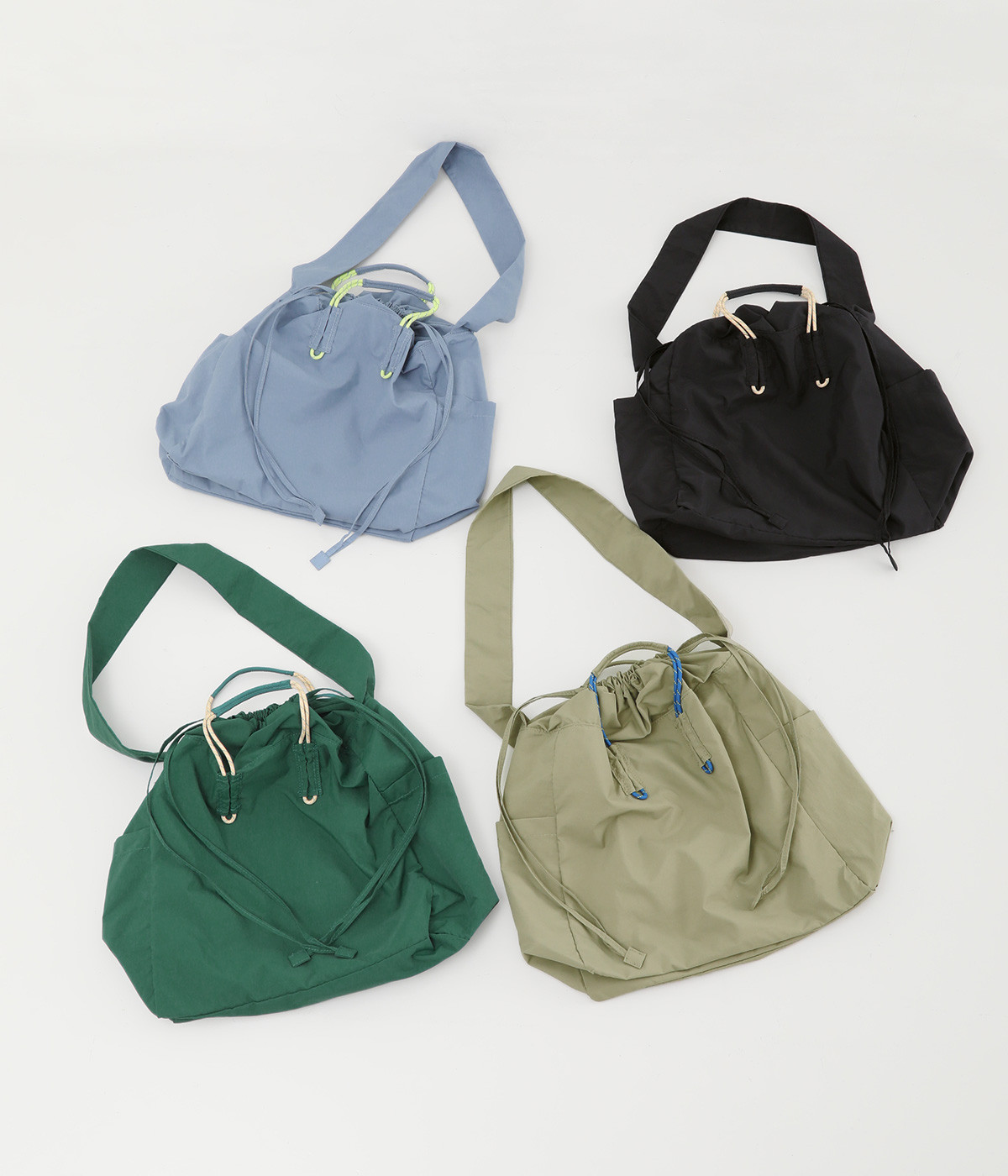 ポケットに本体を収納できるパッカブル仕様のショルダーバッグです。手さげとしても使えて、カラフルな持ち手のコードがアクセントに。きゅっと絞れる巾着タイプで、中の荷物が見えないのもポイント。ポケット付きで機能性にも優れています。