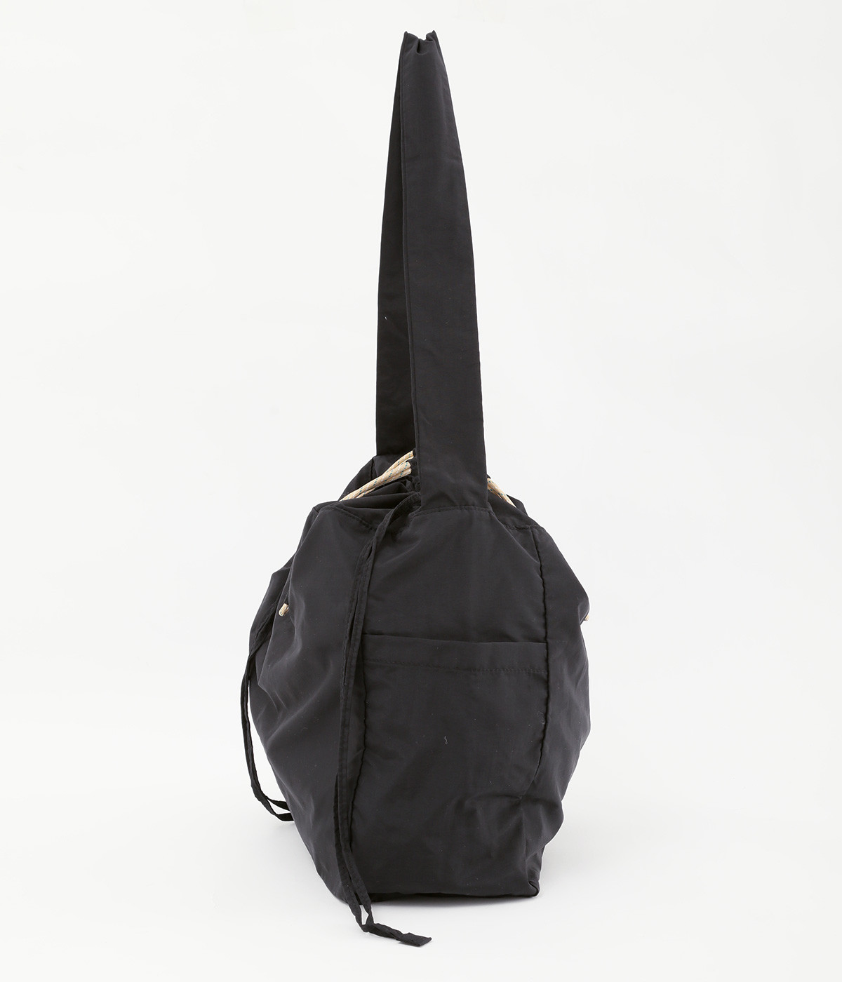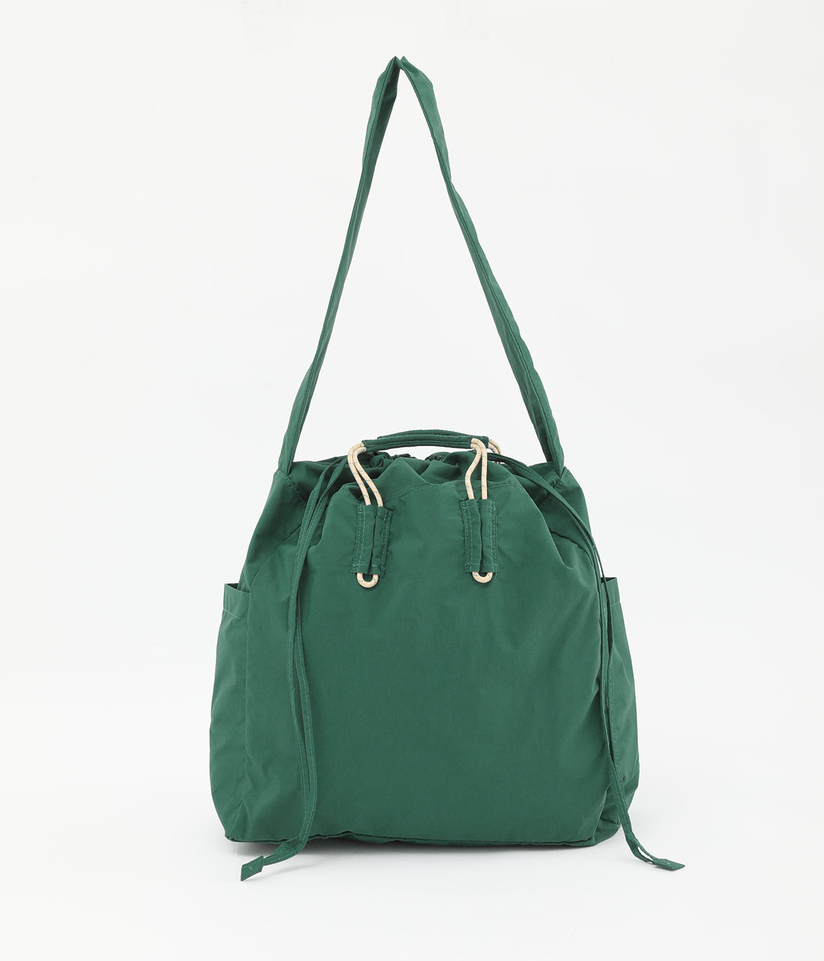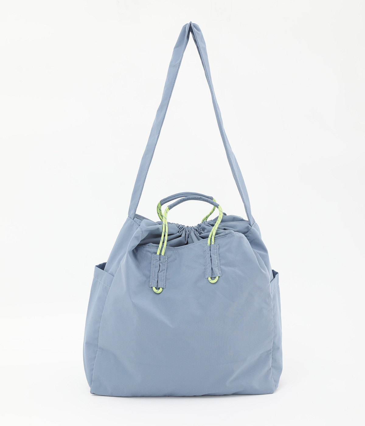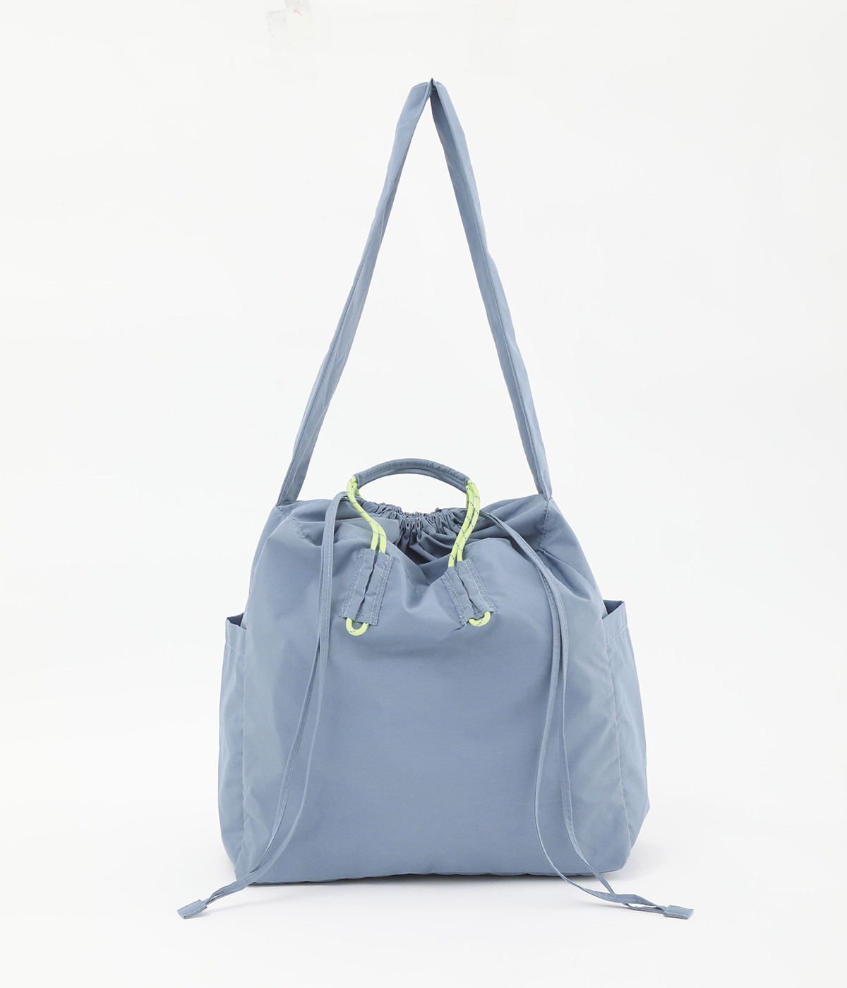 ポケットに本体を収納できるパッカブル仕様のショルダーバッグです。手さげとしても使えて、カラフルな持ち手のコードがアクセントに。きゅっと絞れる巾着タイプで、中の荷物が見えないのもポイント。ポケット付きで機能性にも優れています。