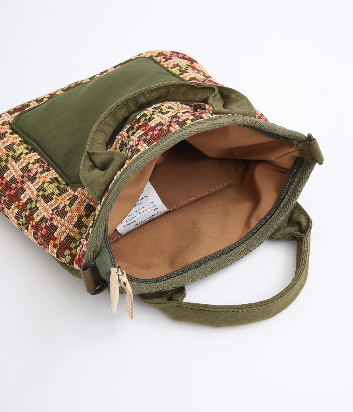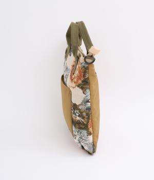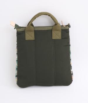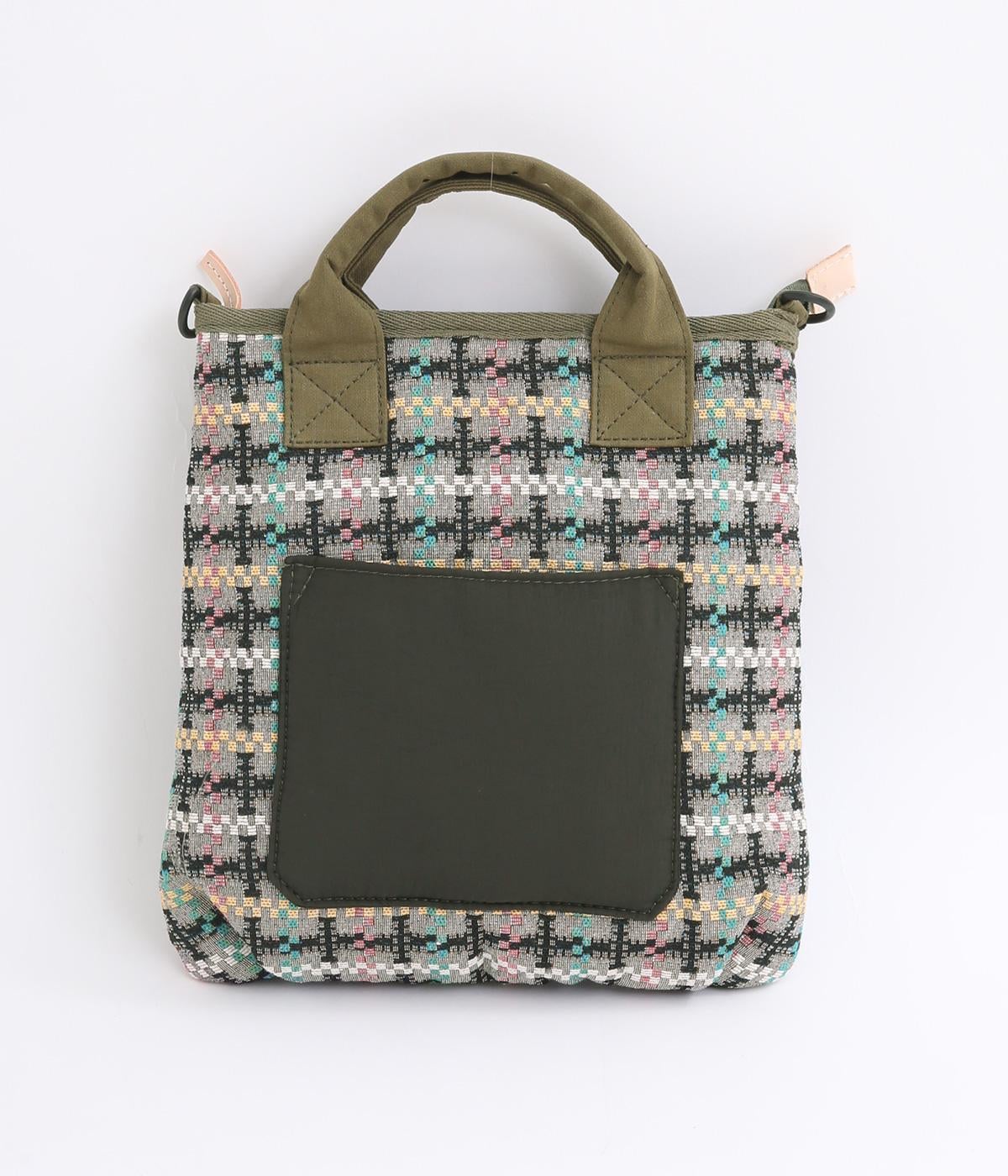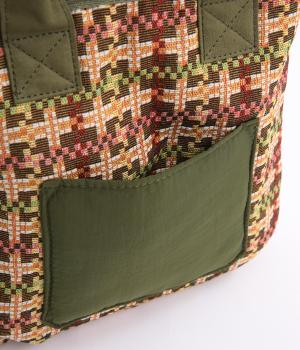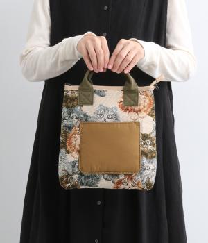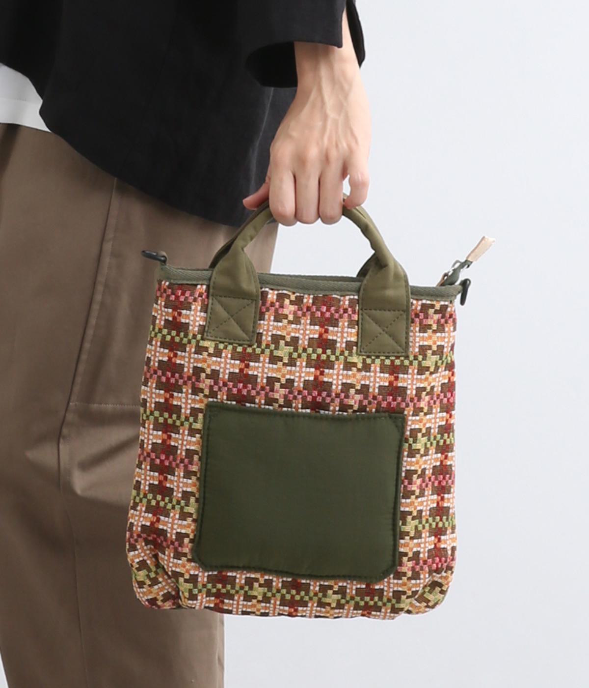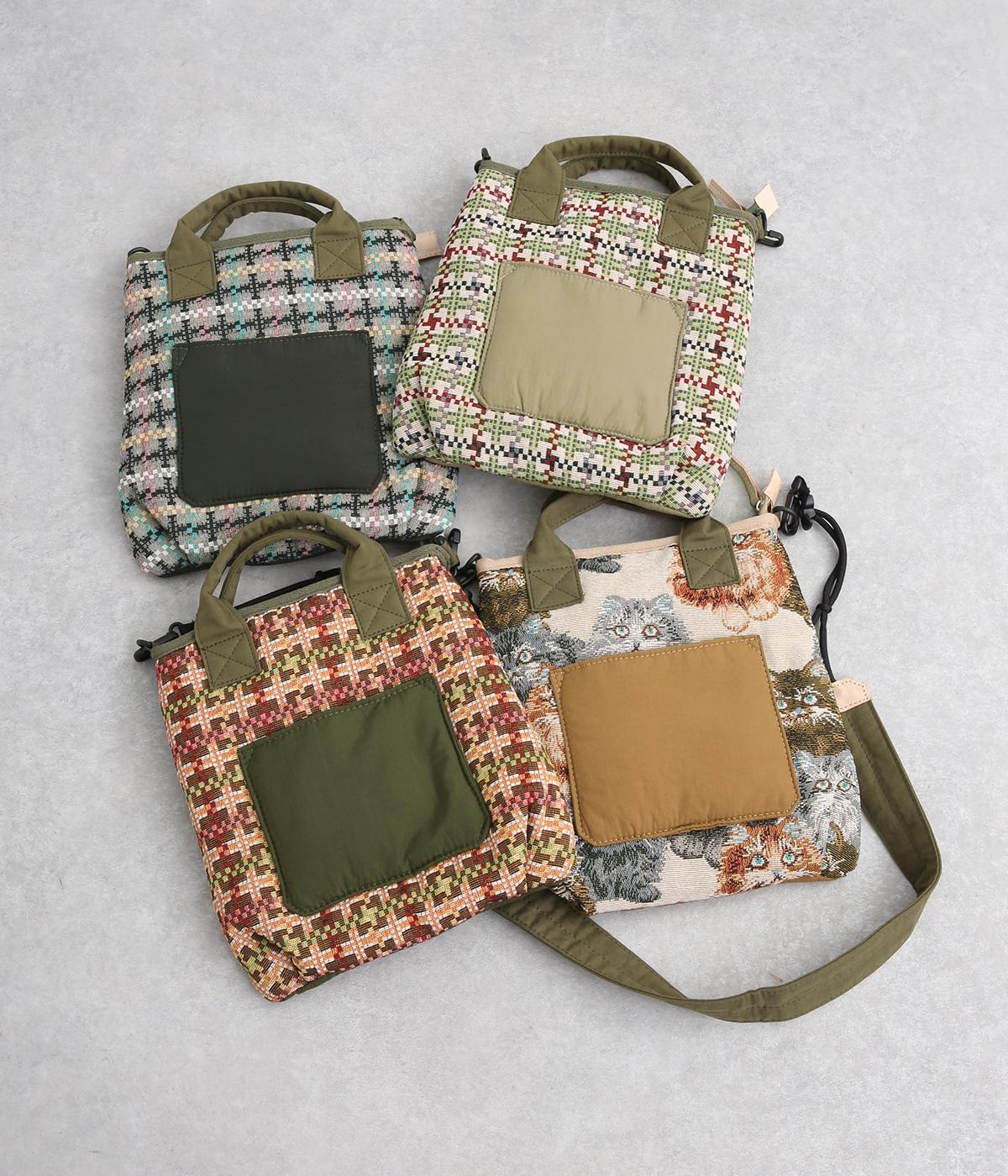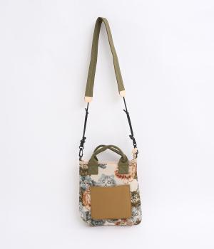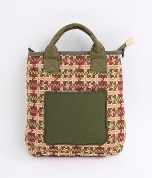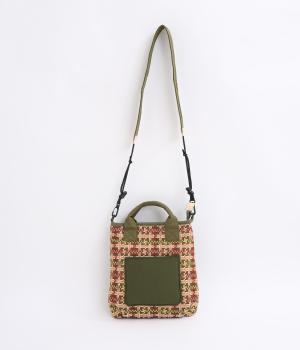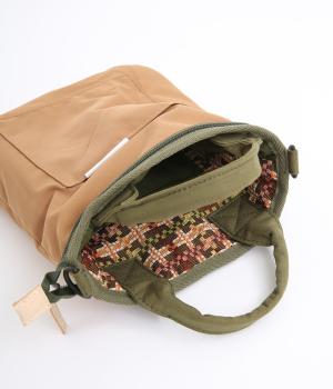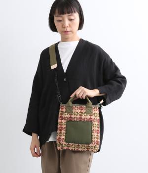 クラフト感のあるジャカード生地とタフな印象のポリエステル、それぞれ特性の異なった異素材を組み合わせました。チャームなどポイントにレザーを配して大人顔に。