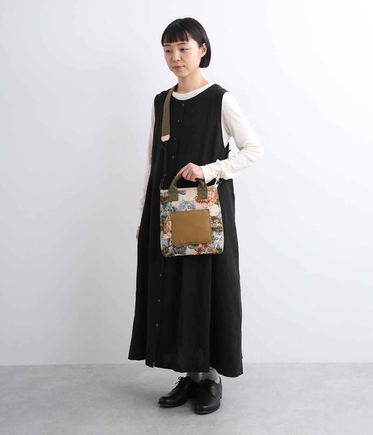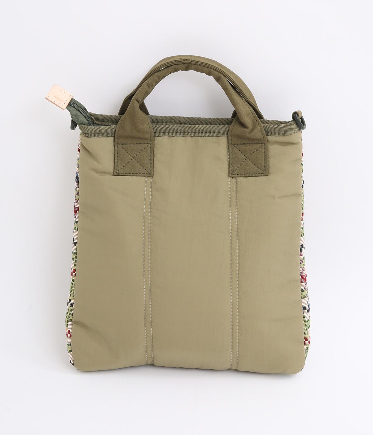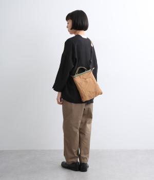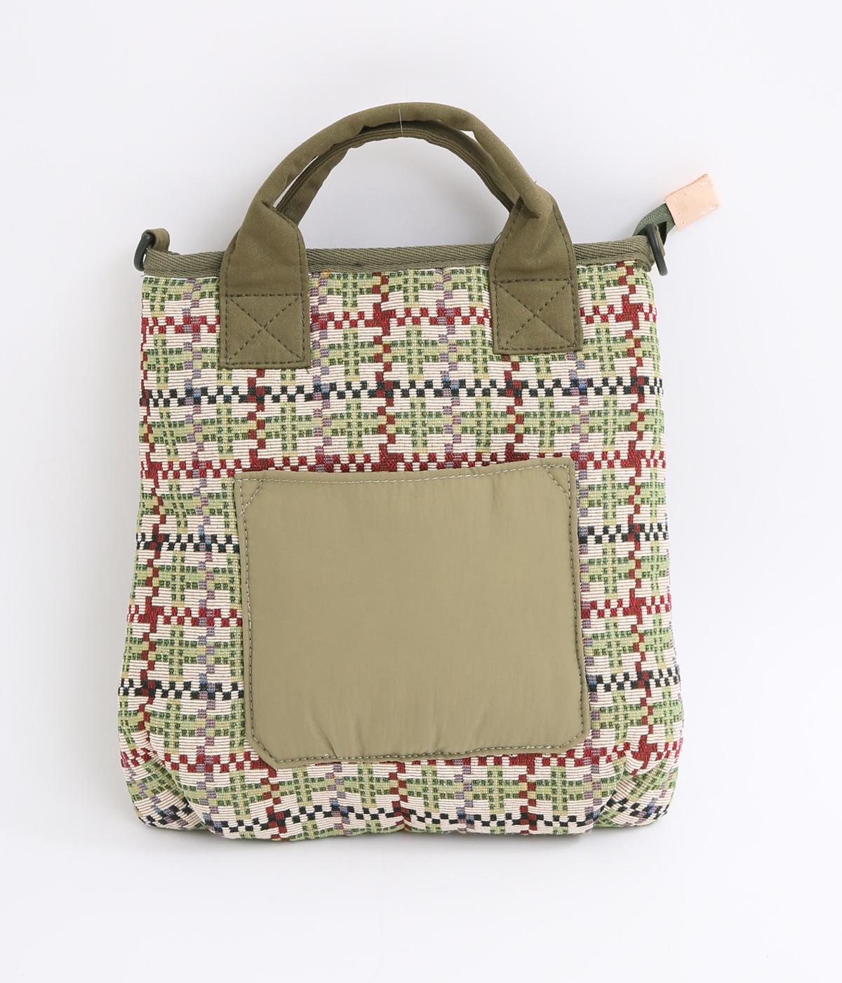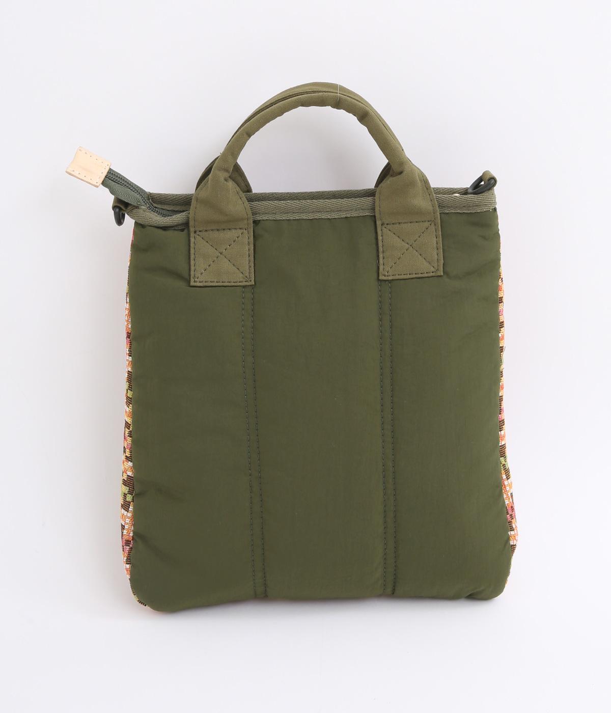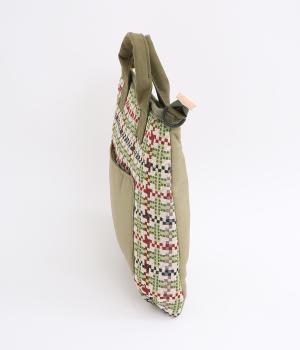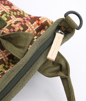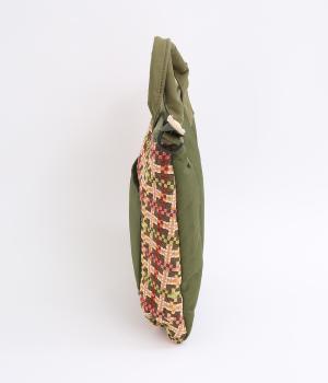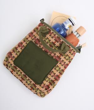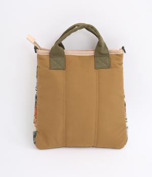クラフト感のあるジャカード生地とタフな印象のポリエステル、それぞれ特性の異なった異素材を組み合わせました。チャームなどポイントにレザーを配して大人顔に。