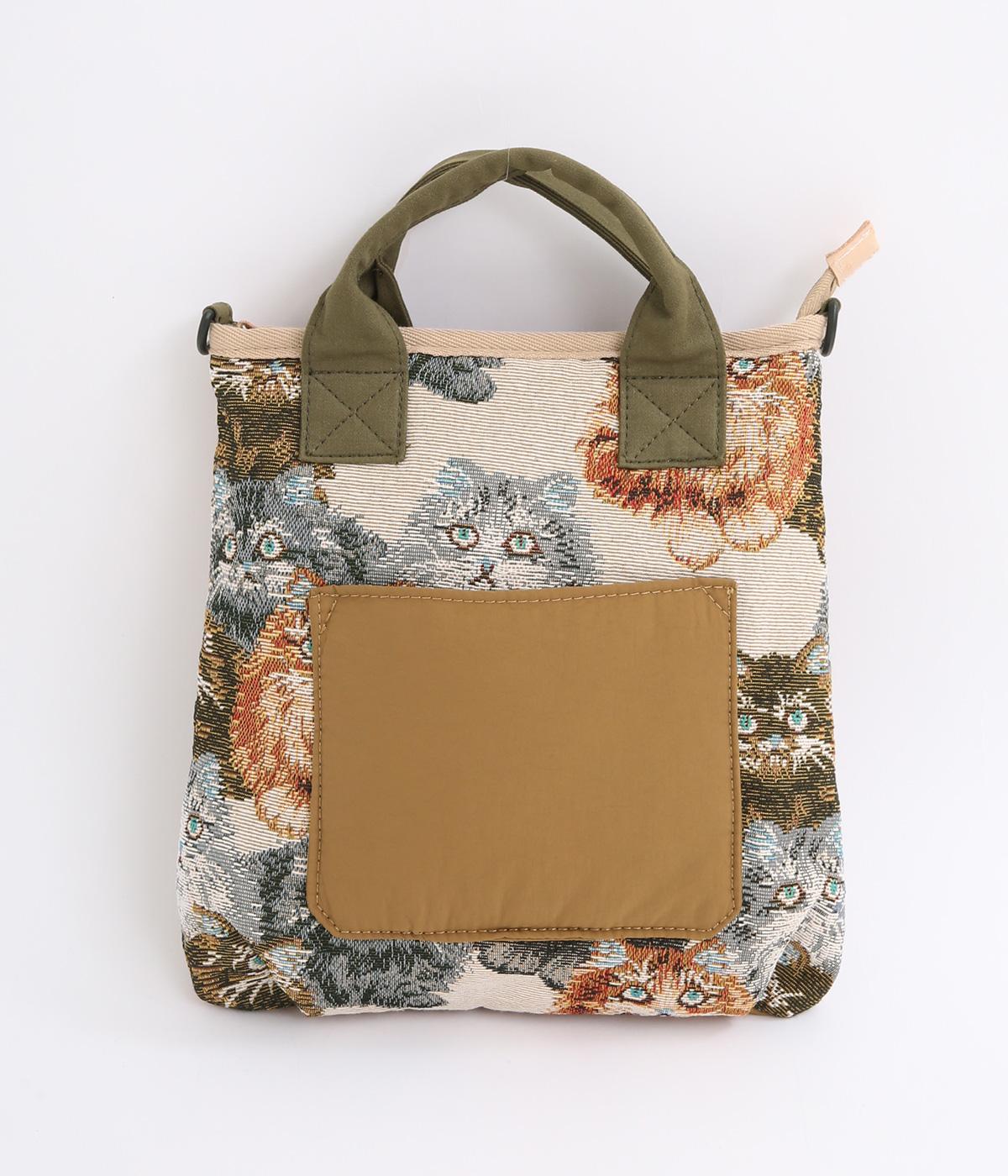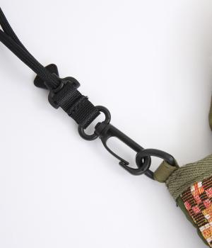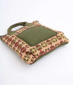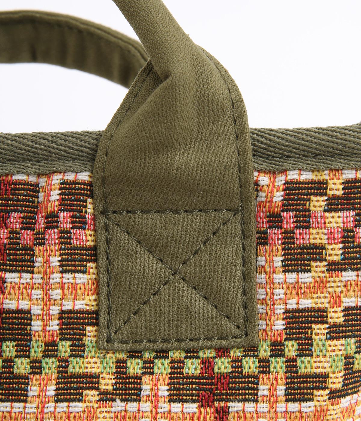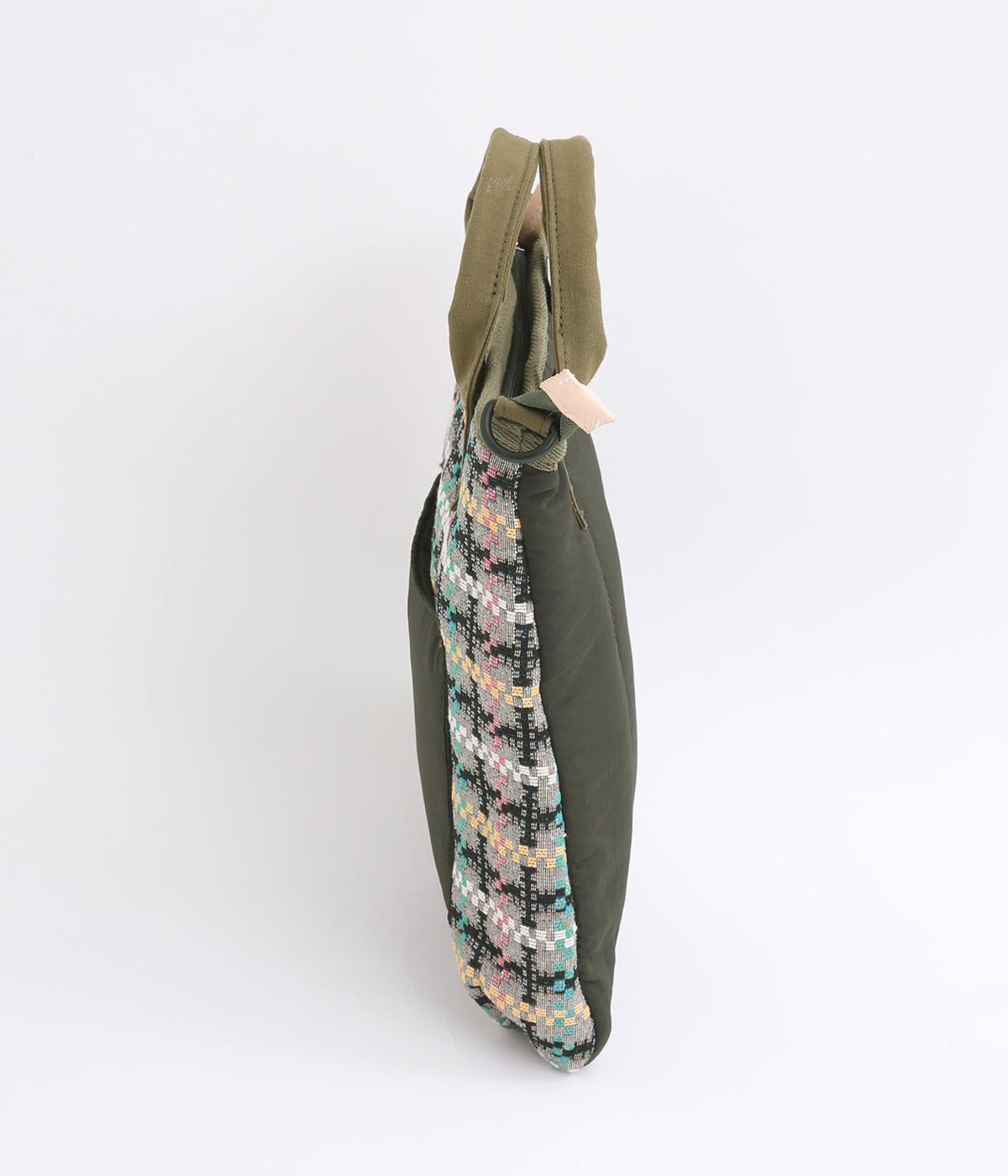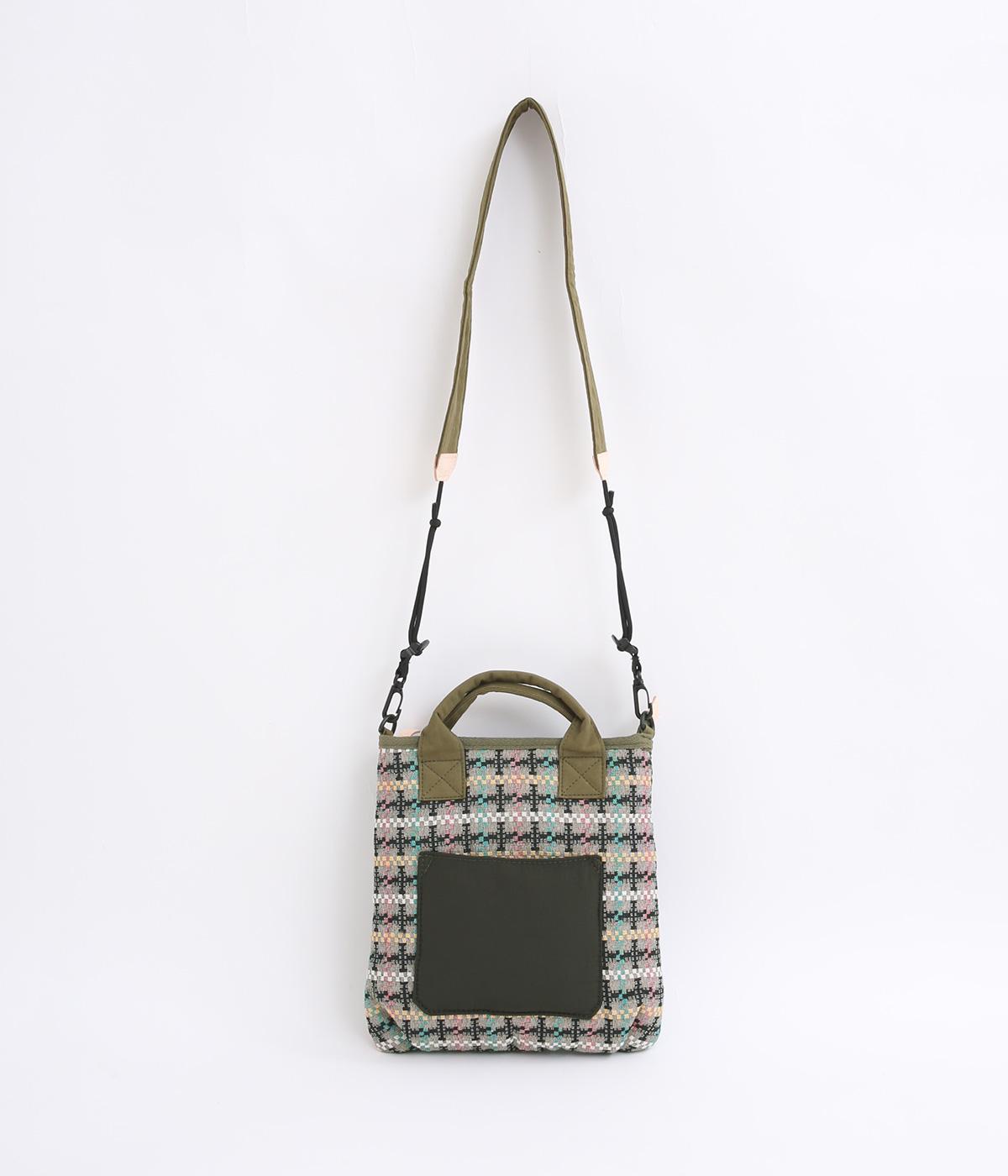 クラフト感のあるジャカード生地とタフな印象のポリエステル、それぞれ特性の異なった異素材を組み合わせました。チャームなどポイントにレザーを配して大人顔に。