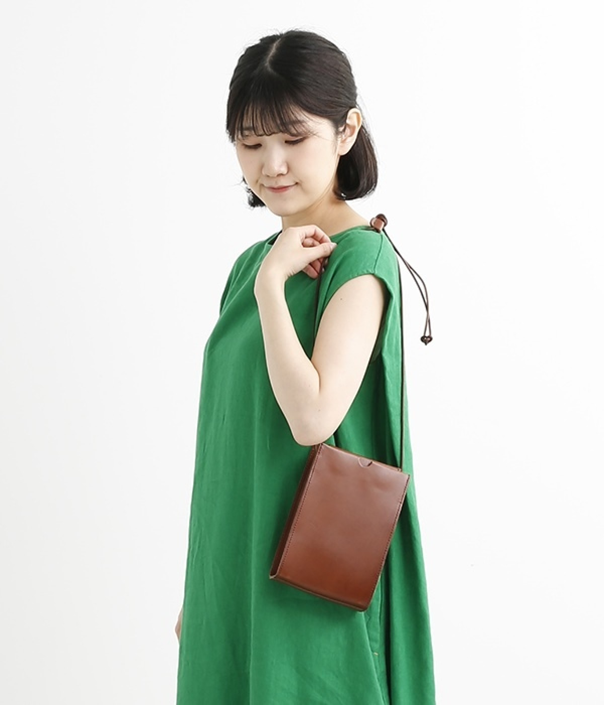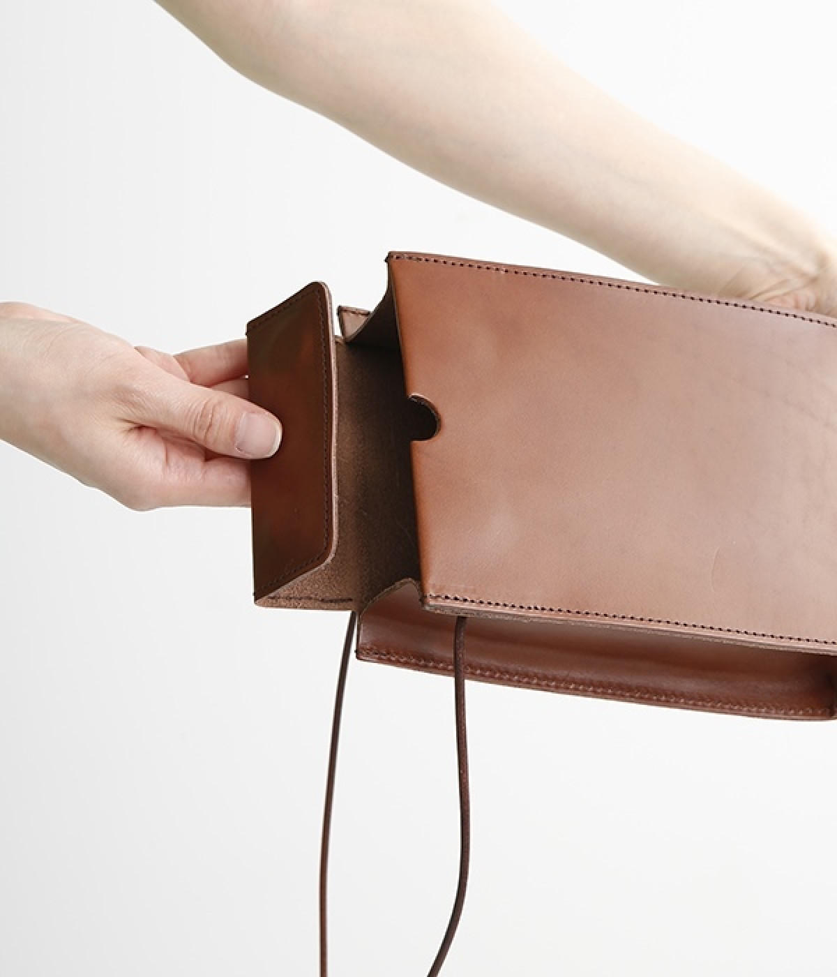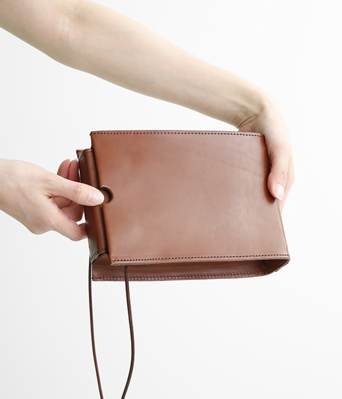 トランプケースをイメージした口元のデザインがポイントのショルダーバッグです。サイド、底ともにマチがあるので小さめながらも主要荷物は収納でき、ちょっとしたお出かけや荷物が多い日のサブバッグとしても重宝します。マットでハリのあるのレザーの風合いが上品で、デイリー使いからフォーマルシーンまで幅広く対応できます。口元は隠しマグネットボタン仕様で開閉もスムーズ。ショルダーベルトは紐を結んで調整できるので自分に合ったサイズにできるのもうれしいポイントです。