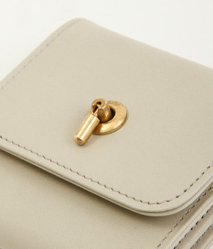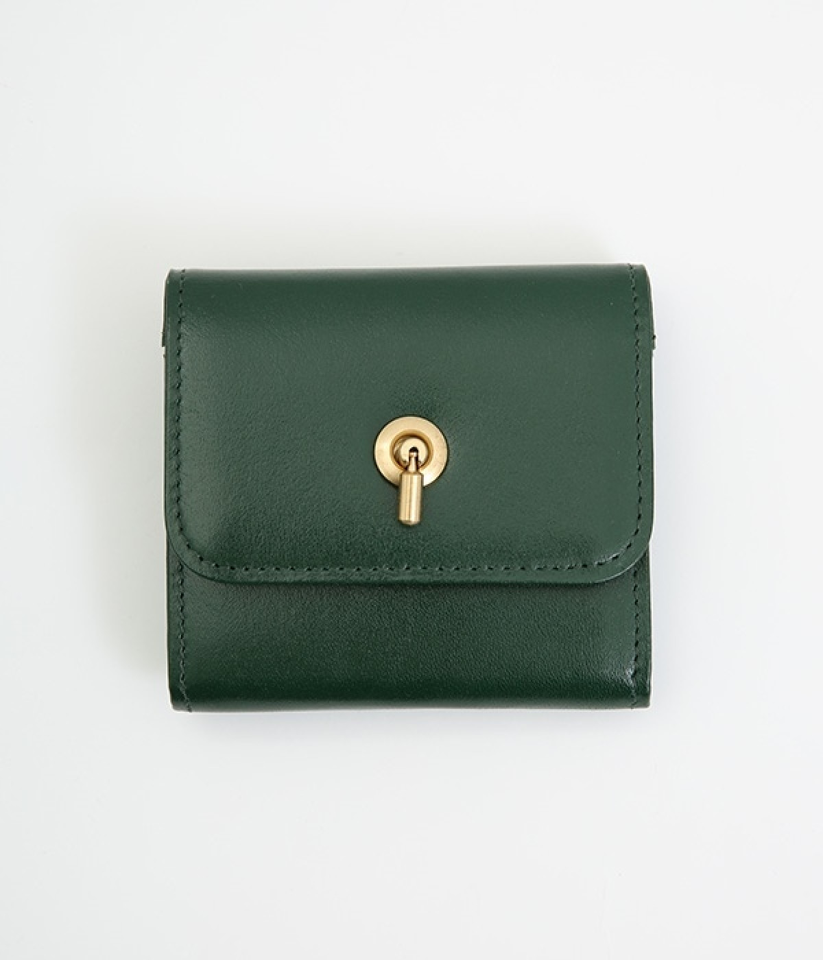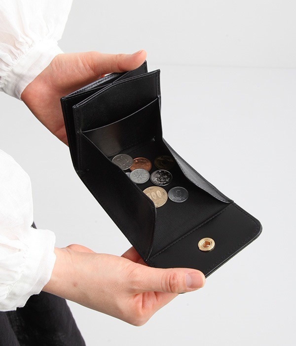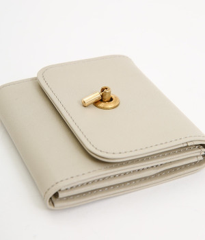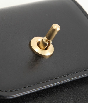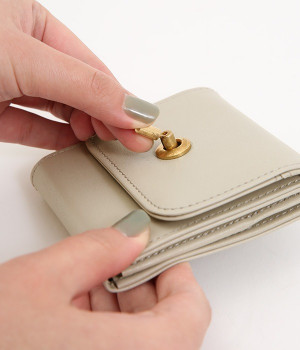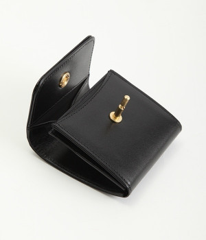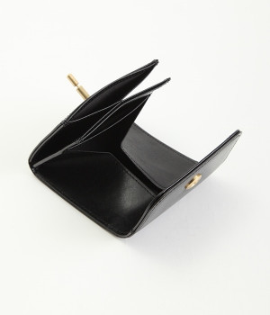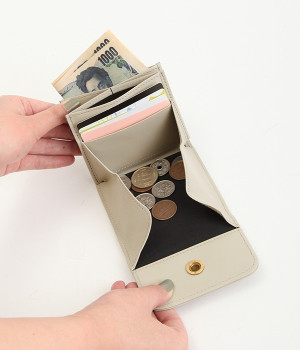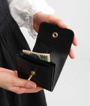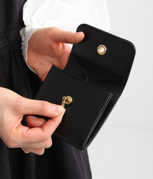 スイッチのような金具が特徴的な容量たっぷりのミニ財布です。スイッチを切り替えるようにパチンと起こして開閉させる金具がポイントで、小銭入れは広く取り出しやすい仕様に。内装のデザイン上、ポケットにカードやお札を入れて、膨らみを作ることでコインのボックススペースを固定する作りになっています。コイン用のボックススペースはコインのみを入れて使用すると雫れ落ちる可能性があるので、他のポケットにカード5枚以上入れて使用するのがおすすめです。