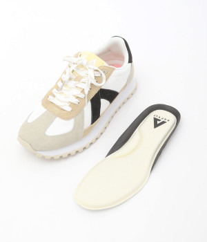 アッパーはナイロンとマイクロファイバーでスポーティに仕上げ、部分的にレザーを用いた大人仕様な一足。低反発枕の上に足を置いているかのような、やわらかいインソールが足を包み込みます。