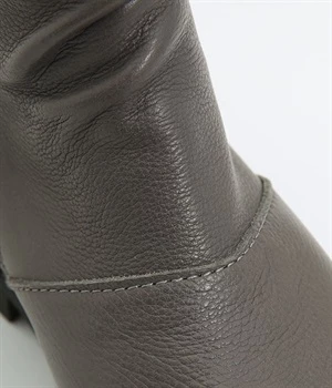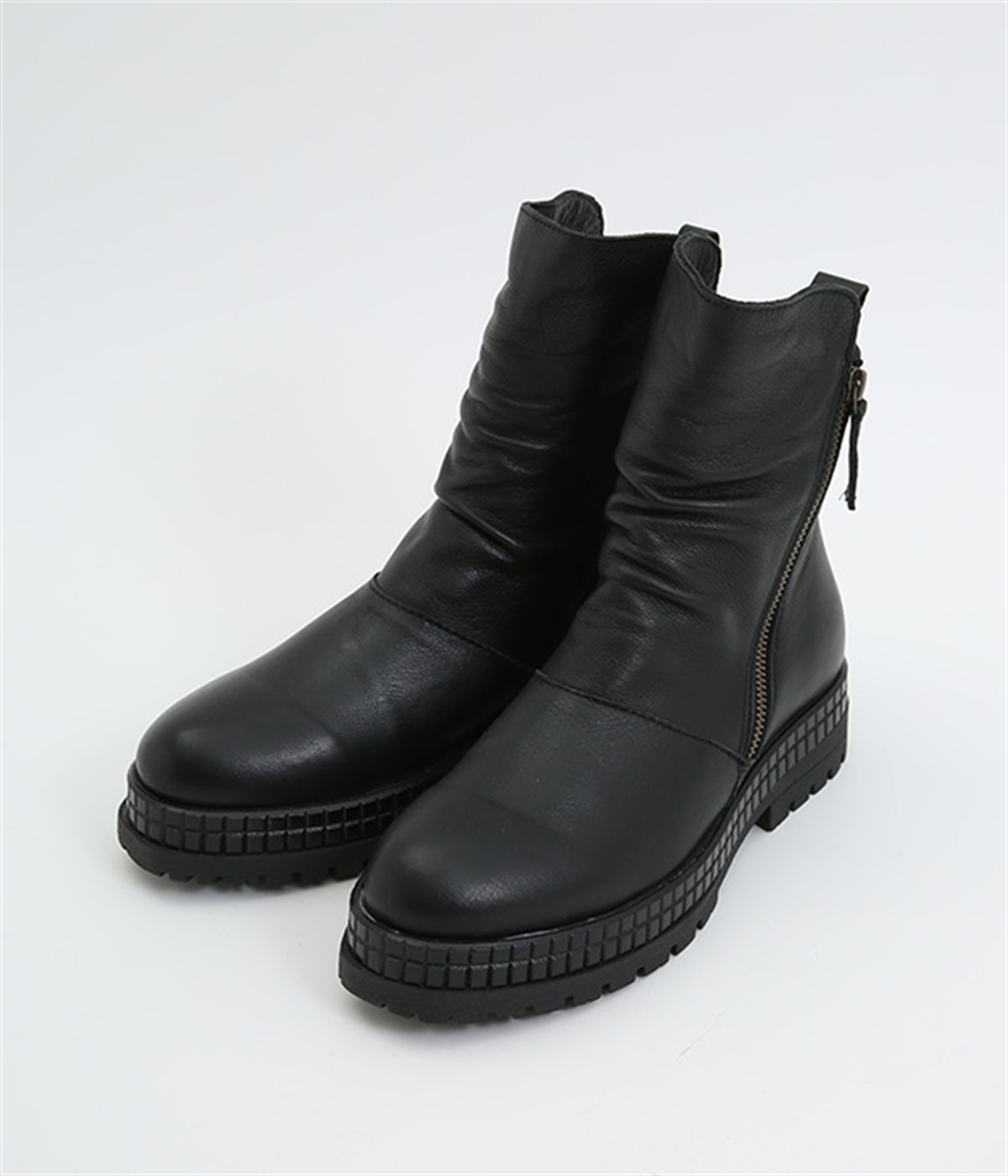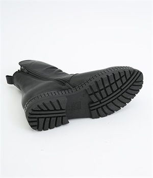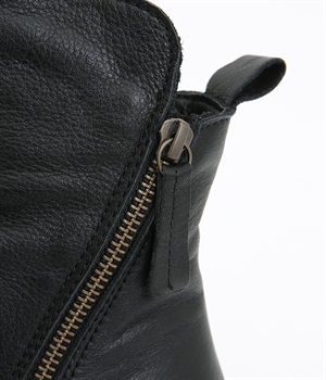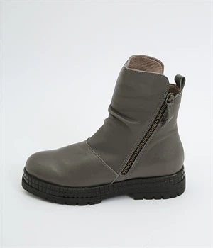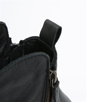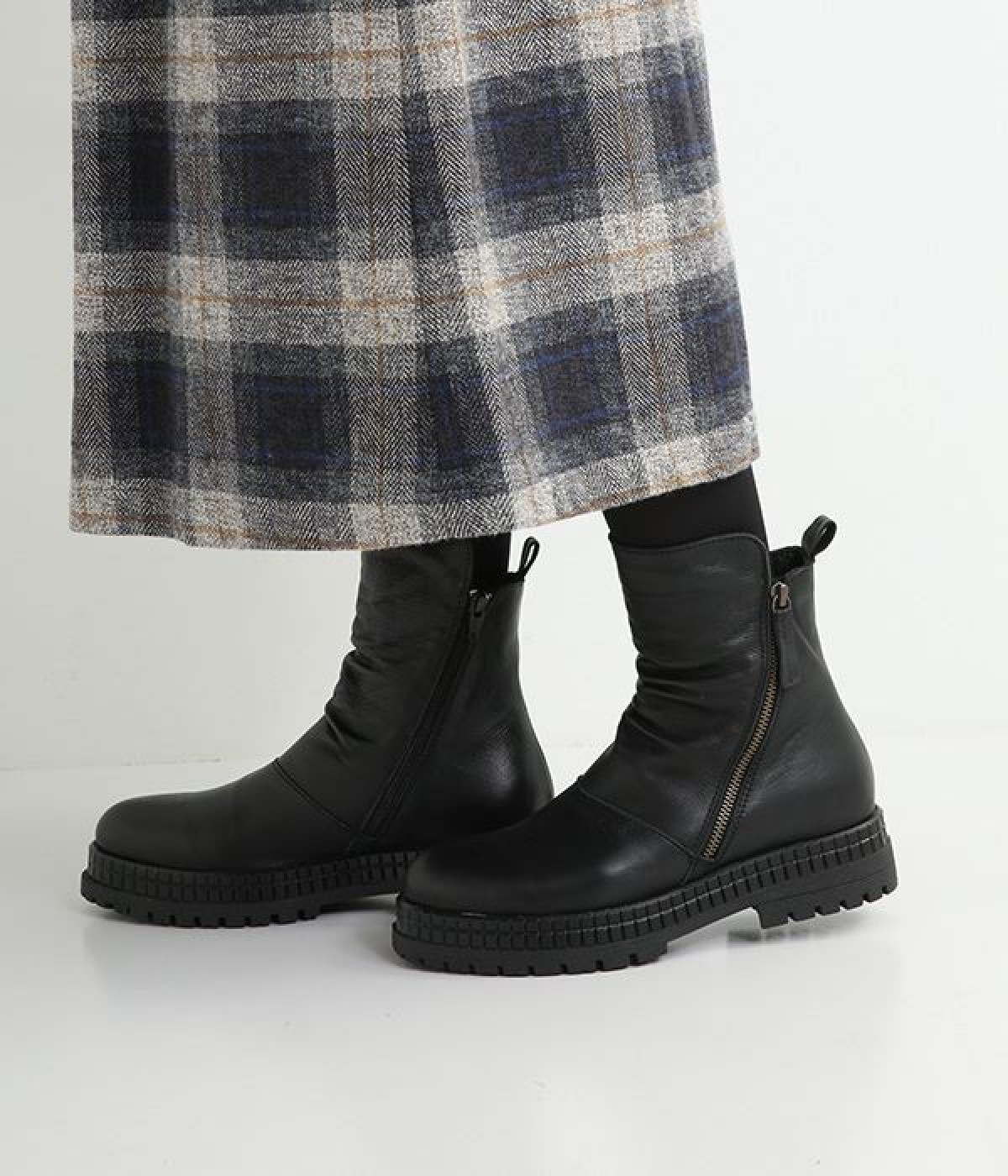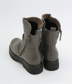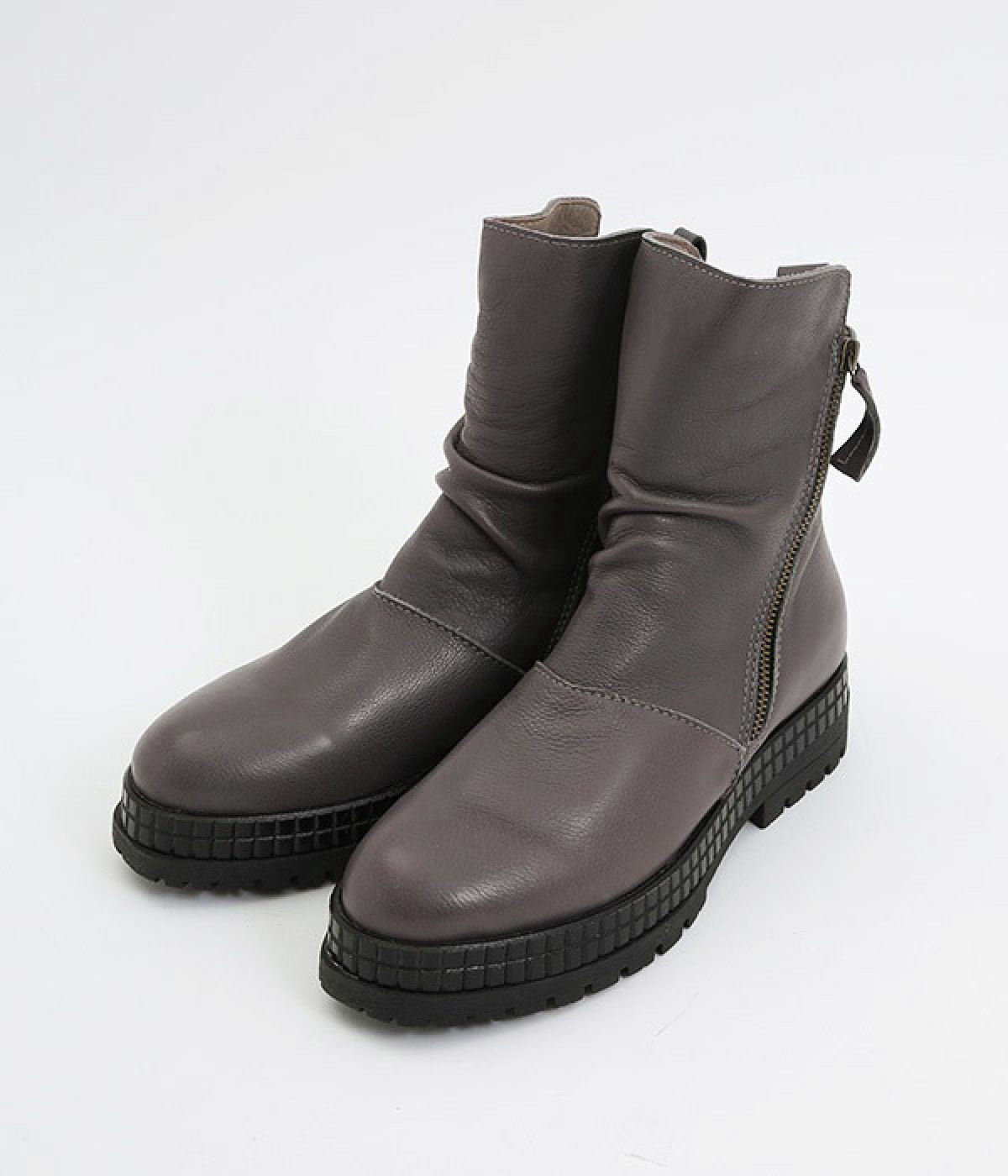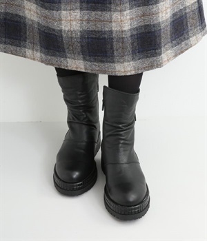 やわらかく品のいい、カウレザー仕立てのミドル丈ブーツです。シャフト部分に斜めに入った飾りジッパーはさりげないアクセント。甲部分から足首にかけてドレープをあしらい、モードな印象に仕上げました。内側ジップ開閉で脱ぎはきも快適。今年らしいやや厚底のゴムソール◎。カジュアルからきれいめまで合わせやすいアイテムです。