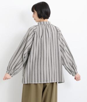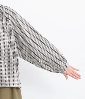透け感のある柄が、ニュアンスのある表情をつくります。ラグランスリーブが肩まわりをすっきりと見せ、女性らしさを添えています。前後差をつけた裾がふんわりとしたラインを描き、カジュアルにもきれいめにもマッチします。