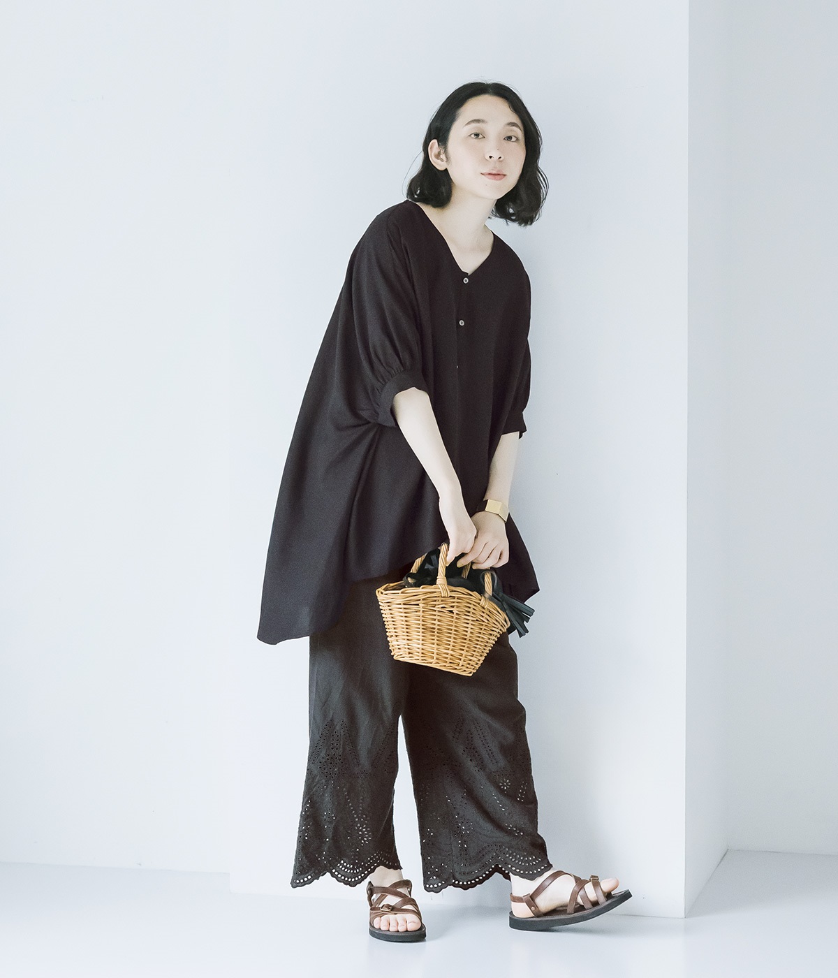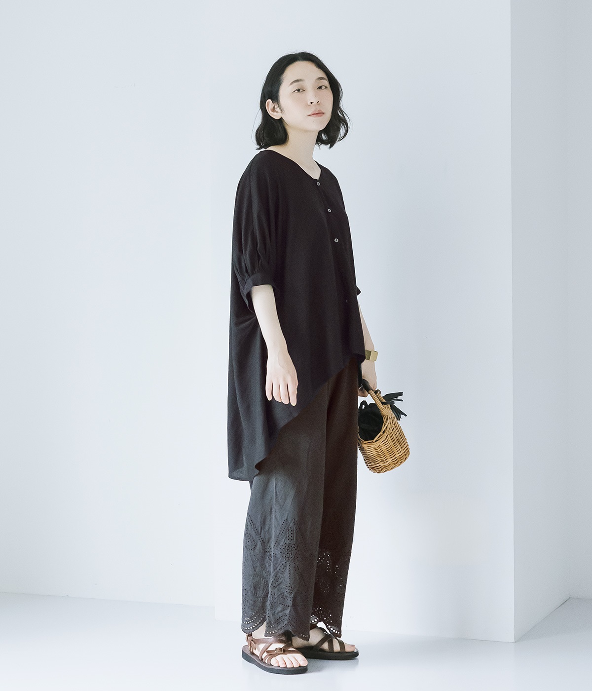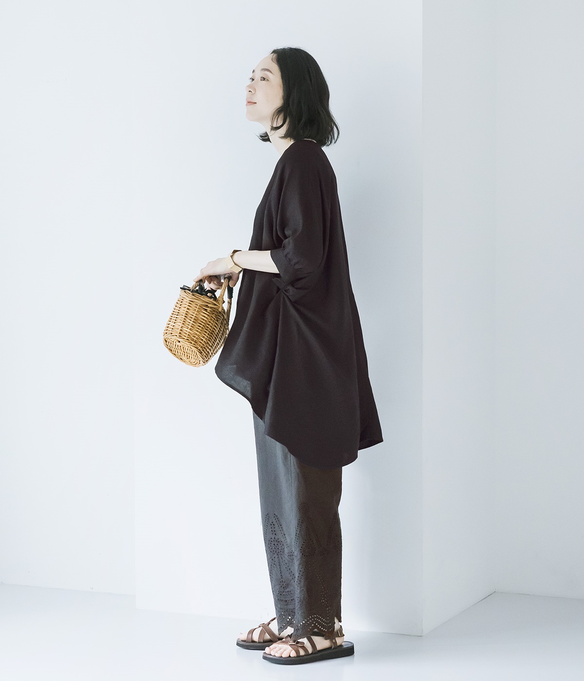 異なるトーンのブラックを重ねた、奥行きのある装い。小物にブラウンを差し込むことで、重たくなりすぎず軽やかにまとまります。