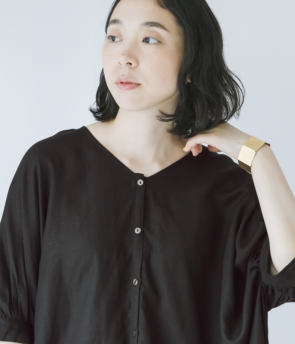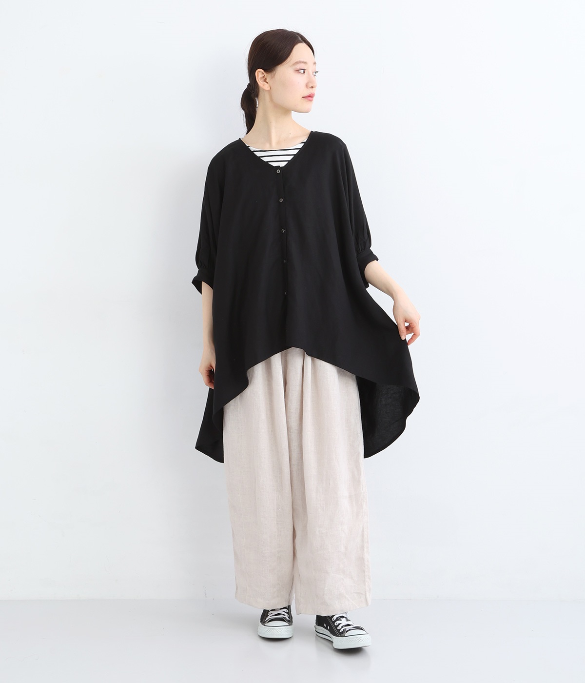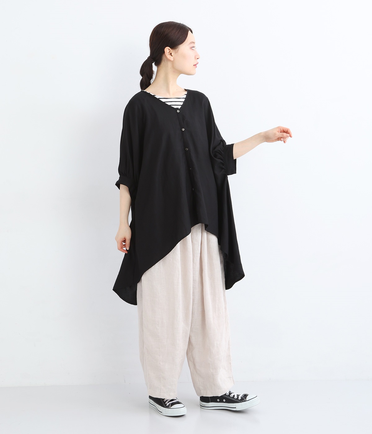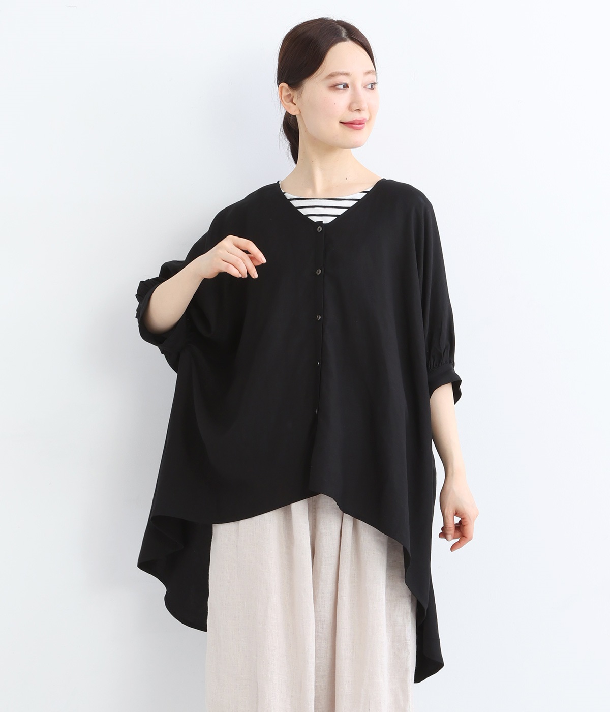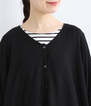 肘まで隠れる袖丈と、ゆるやかなドルマンスリーブで、安心感のある着心地に。フロントにあしらったホワイトのボタンが、さりげないアクセントとして効いています。