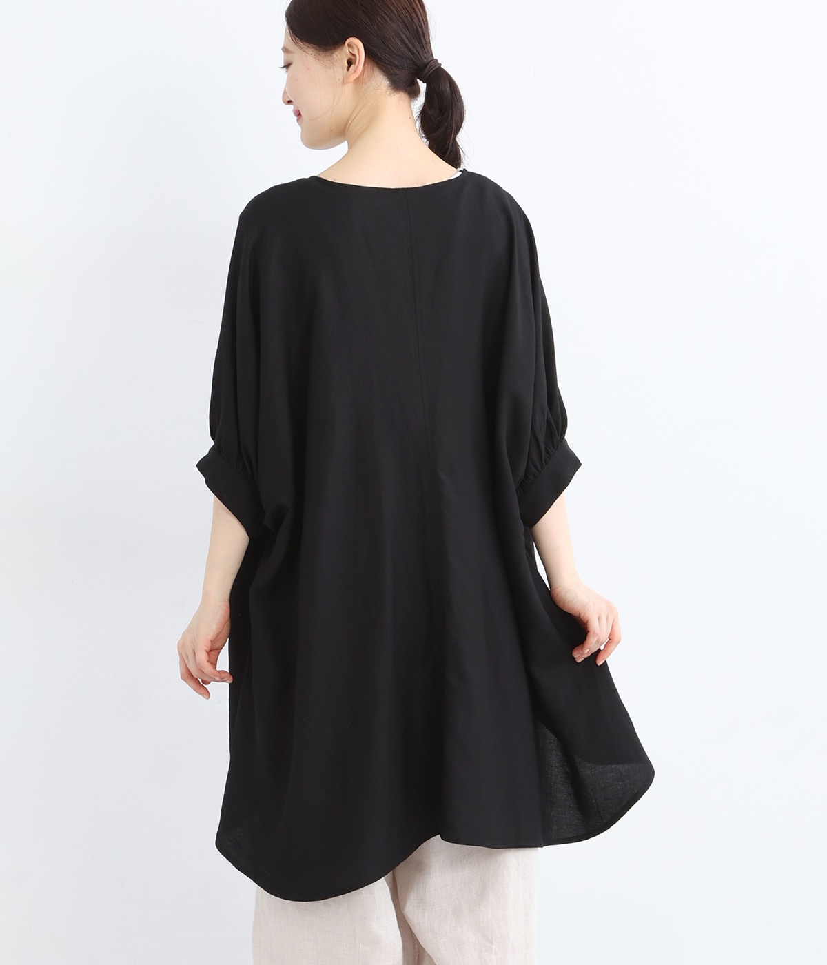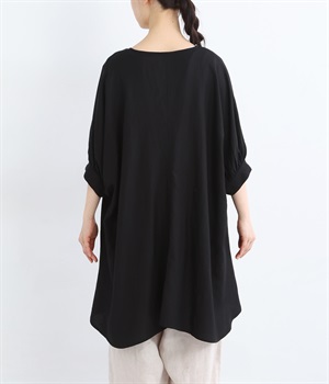 後ろはまるでチュニックのようなデザインで、前とは違った印象を楽しめます。太もも周りまでふんわり包み込み、気になる部分もやさしくカバー。