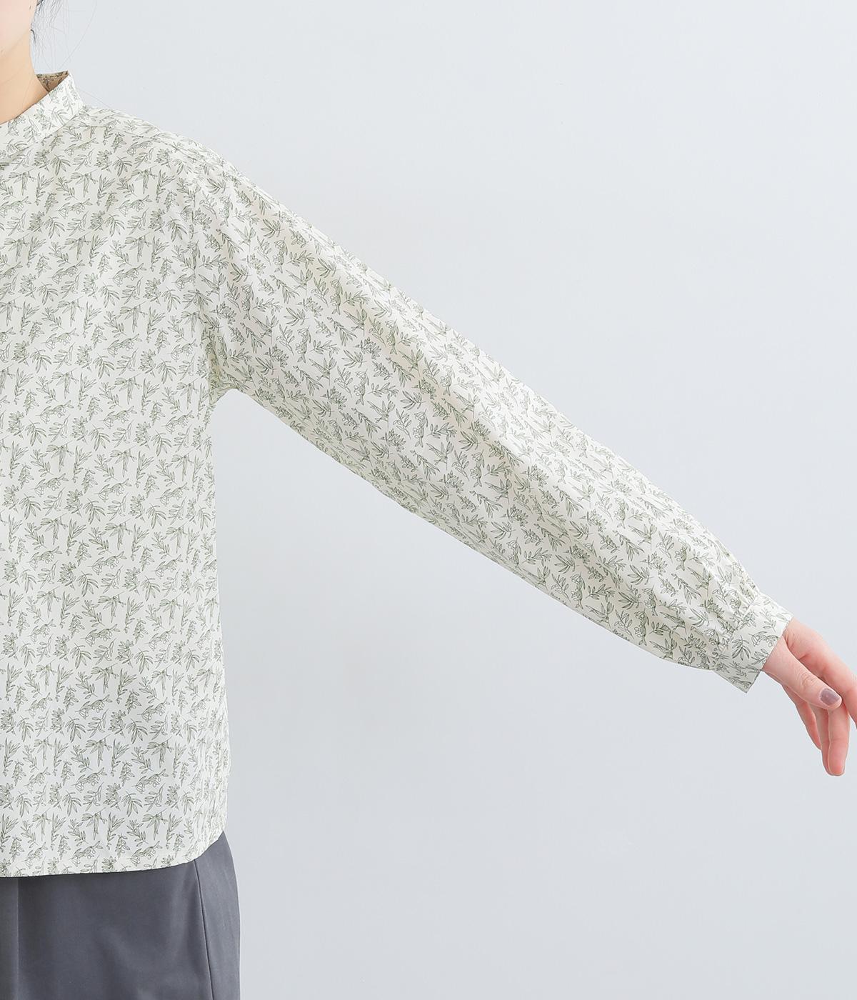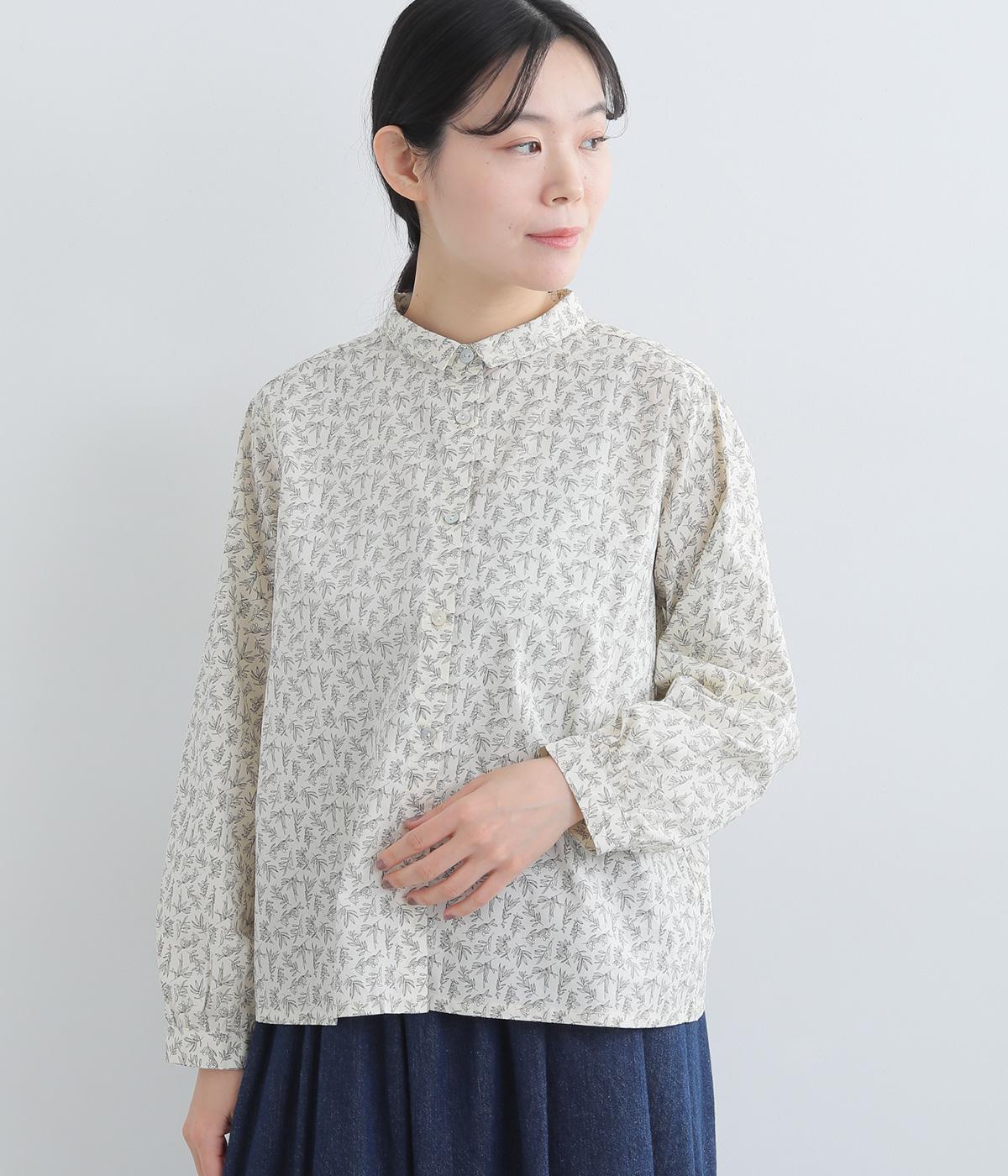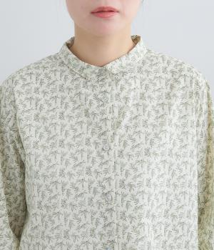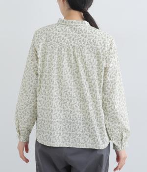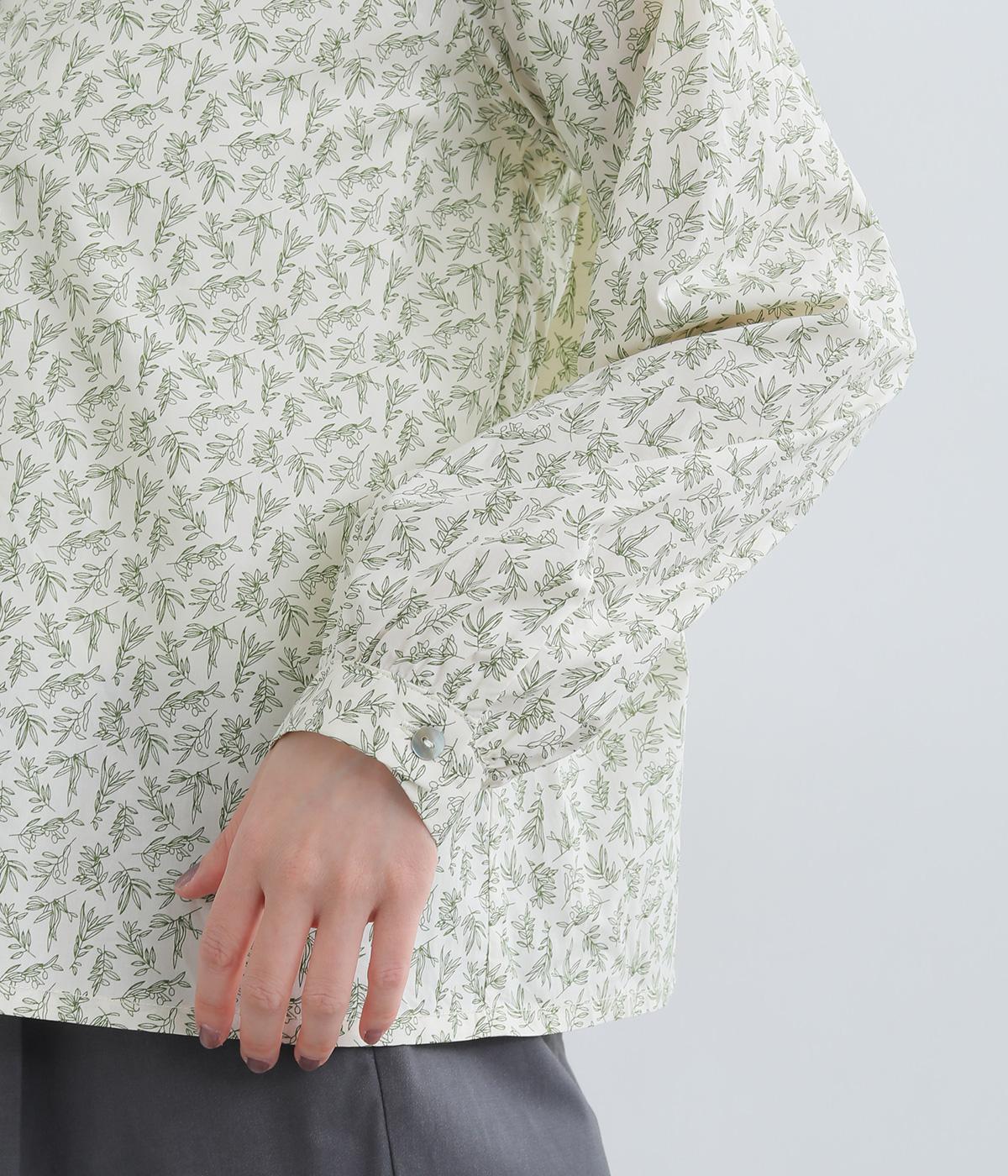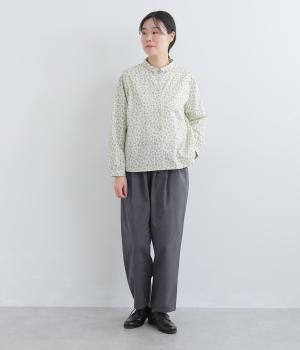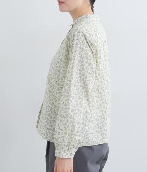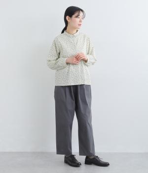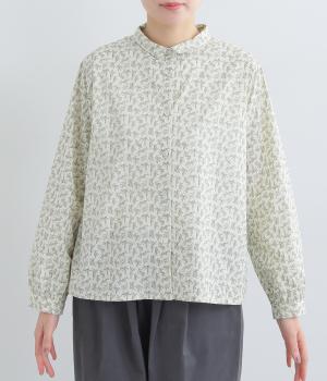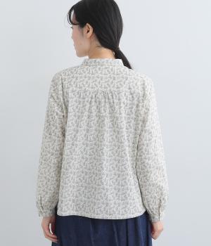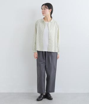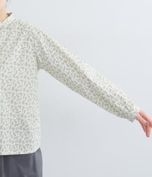 全体に細かなリーフ柄をあしらったブラウス。小さめの襟が上品さを添えます。やや短めの丈で、ボトムスに裾をインしてもバランスよく着こなせるデザインです。