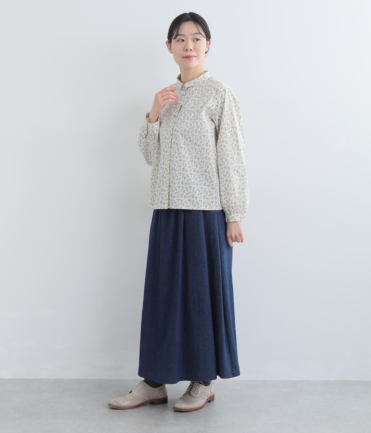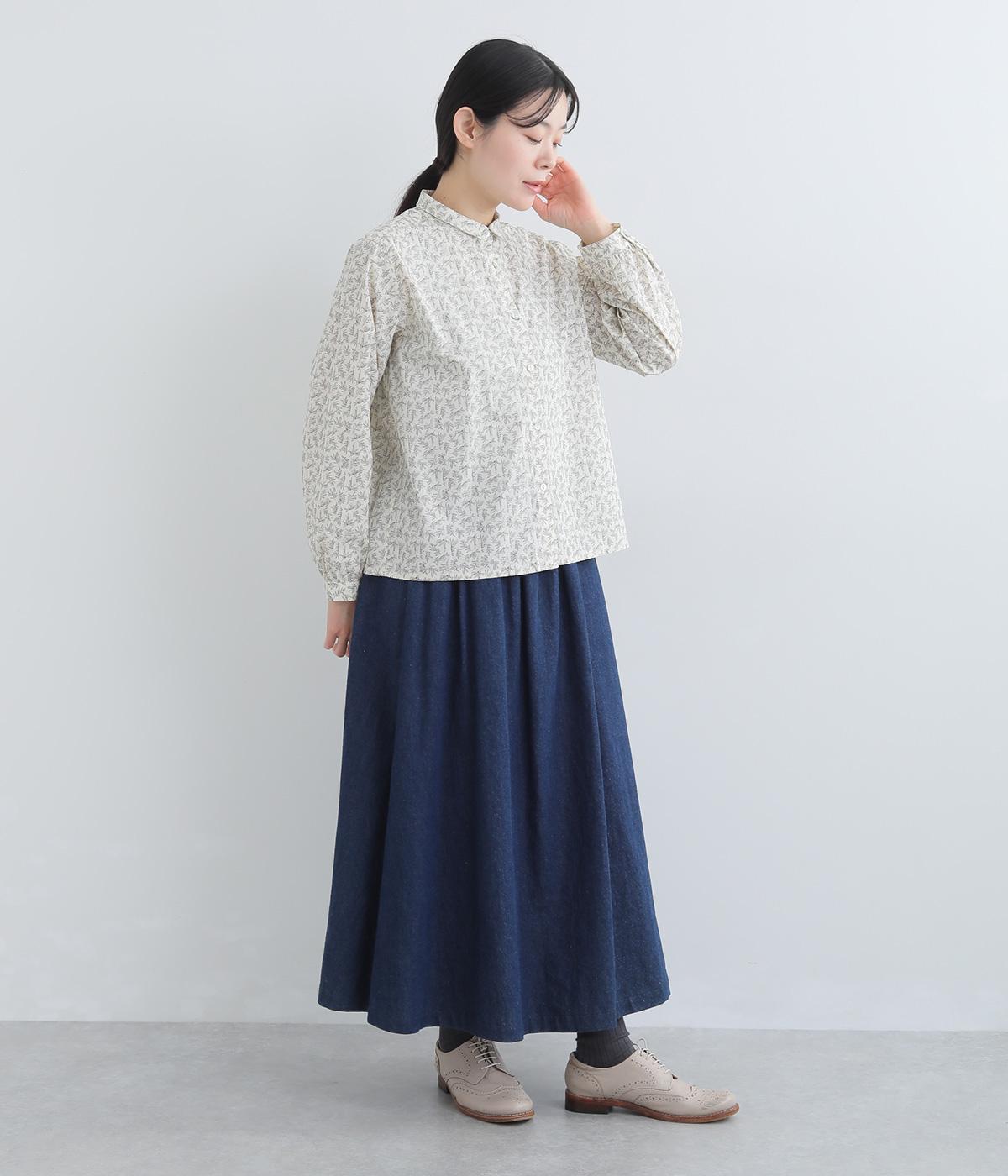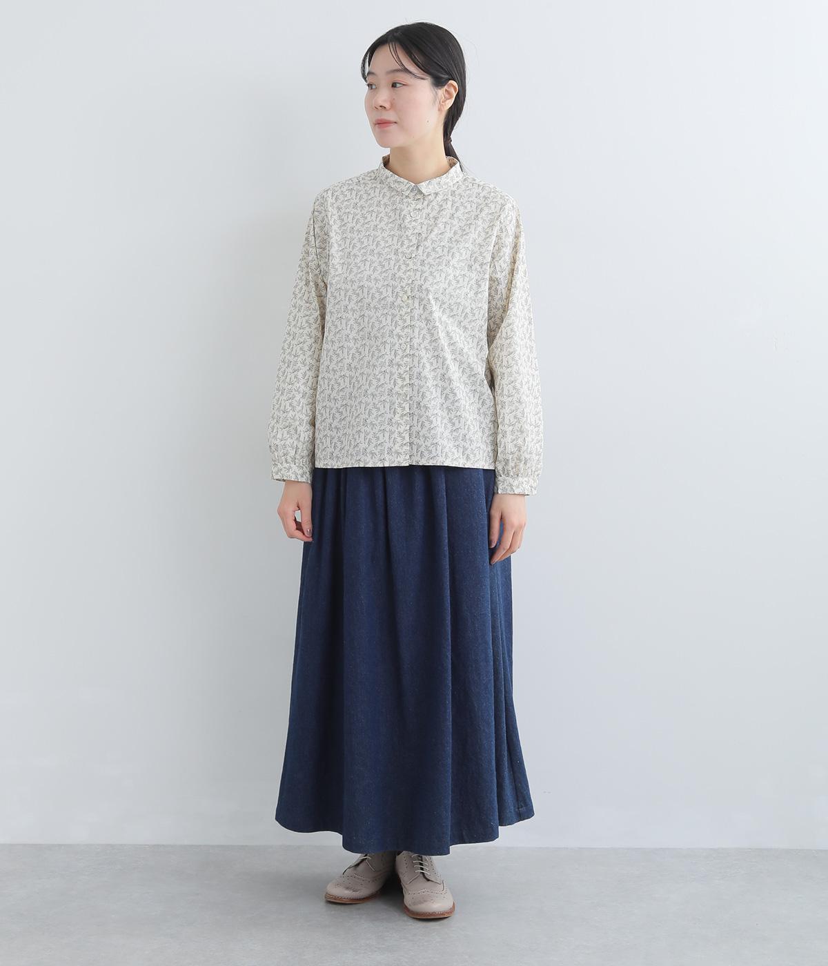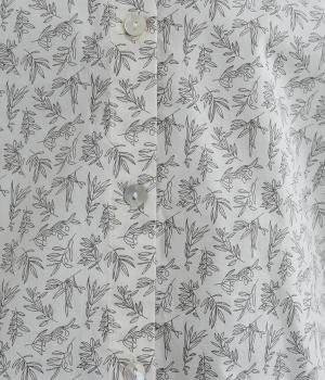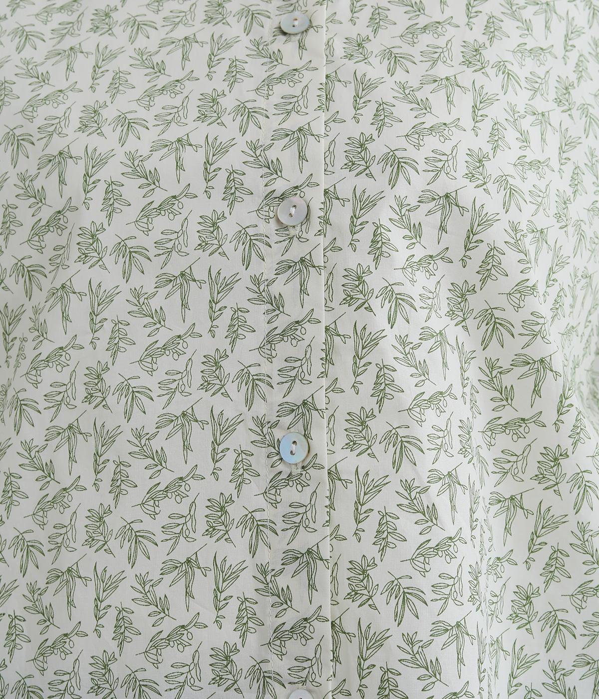 全体に細かなリーフ柄をあしらったブラウス。小さめの襟が上品さを添えます。やや短めの丈で、ボトムスに裾をインしてもバランスよく着こなせるデザインです。