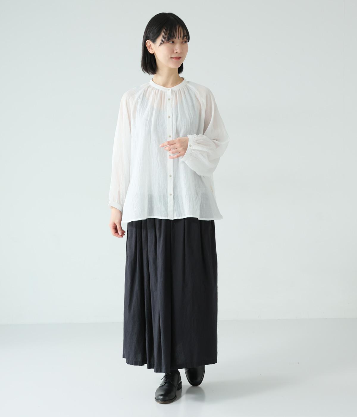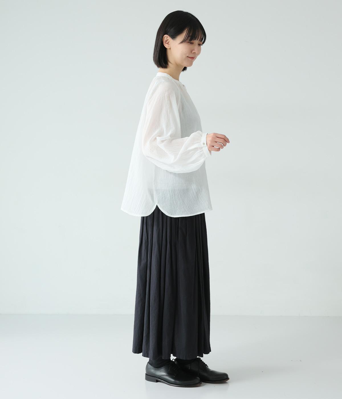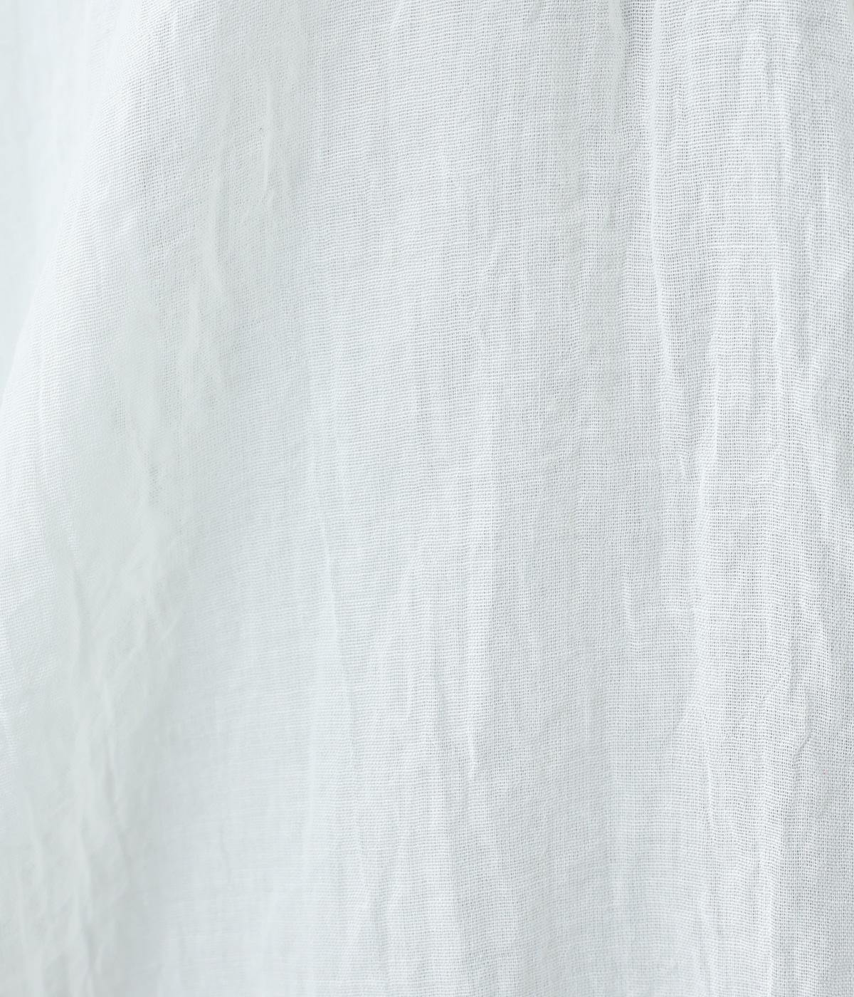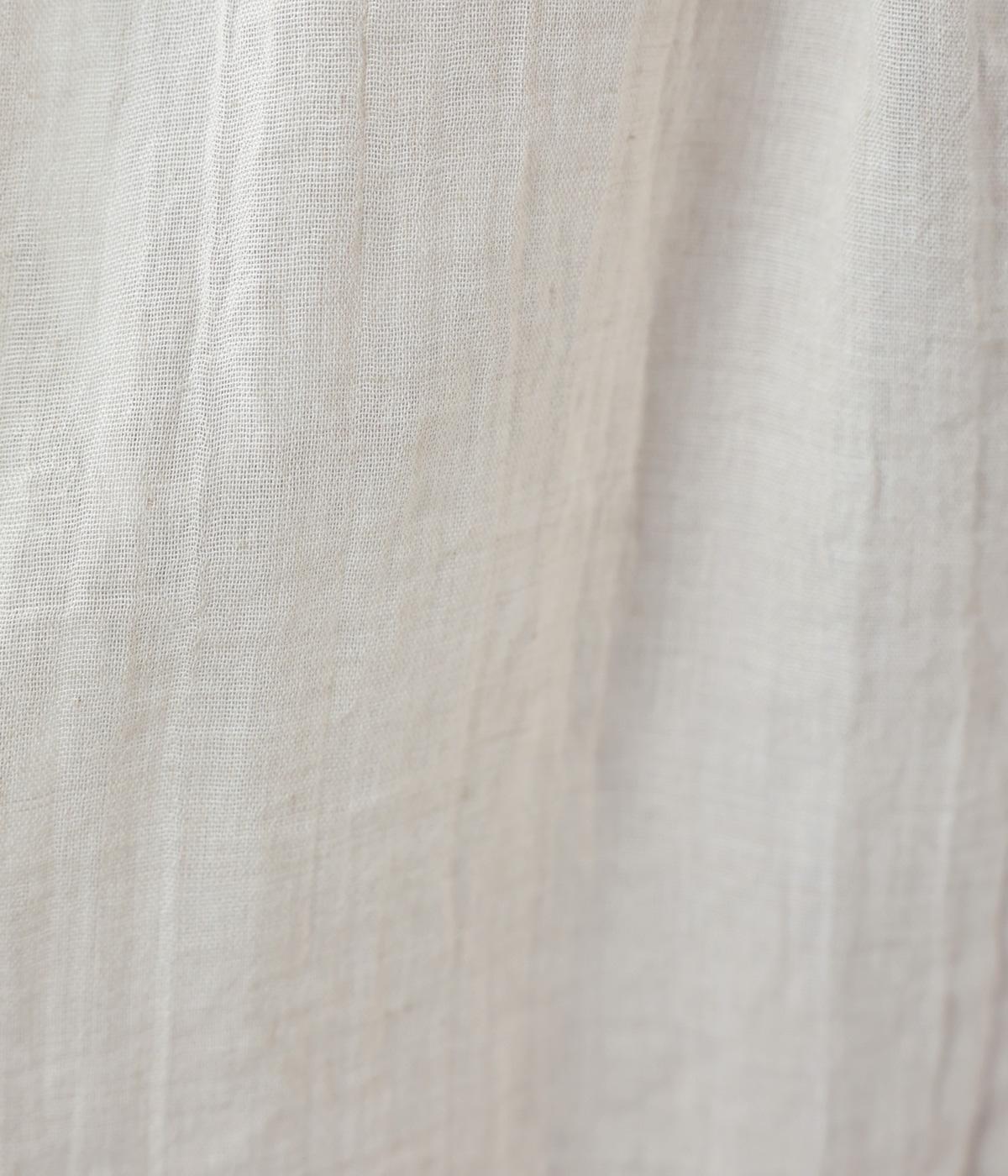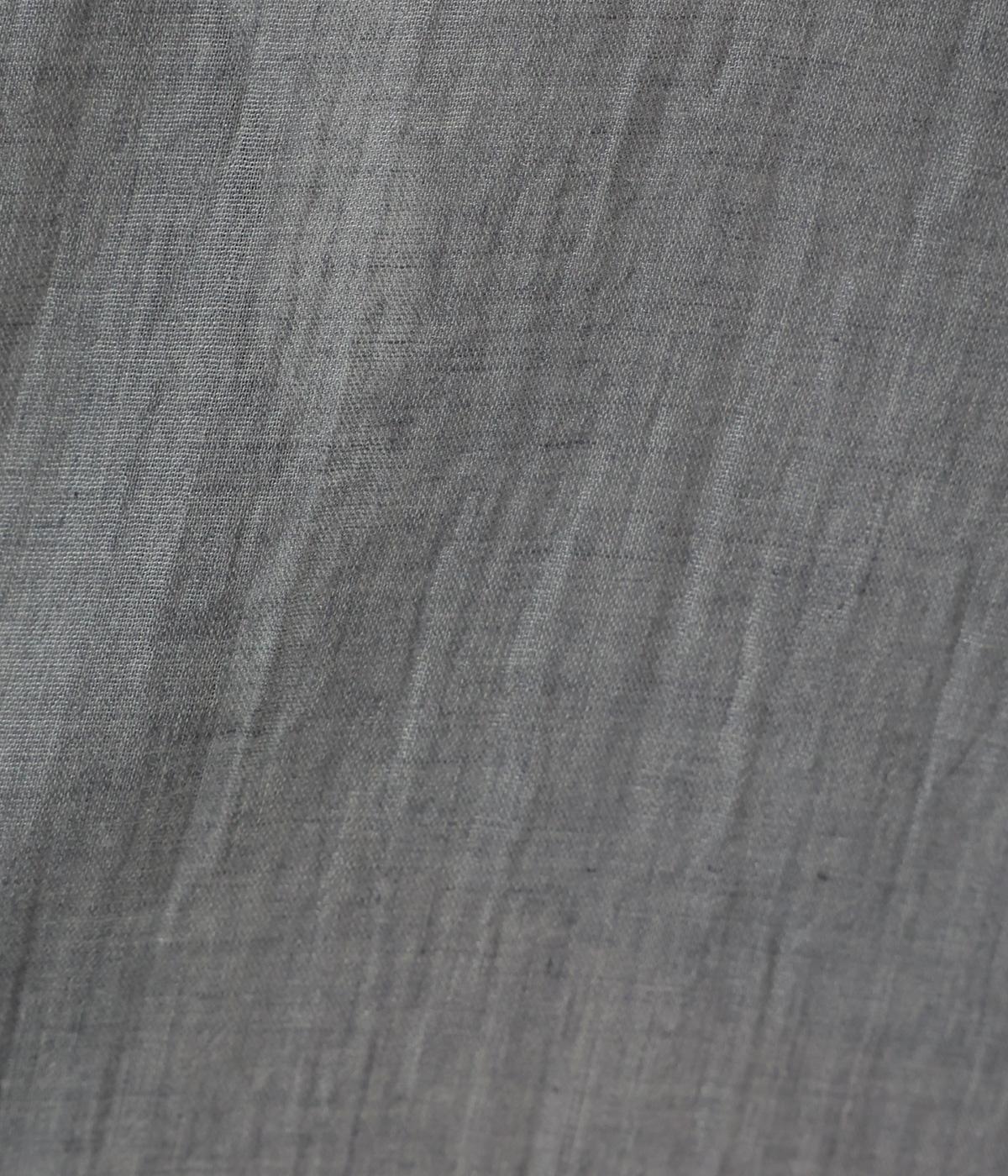 ナチュラルなシワ感のある素朴な雰囲気の混紡生地です。透け感のある軽やかさで落ち感があり、繊細なドレープをつくります。ふんわりと、空気を纏うような着心地です。