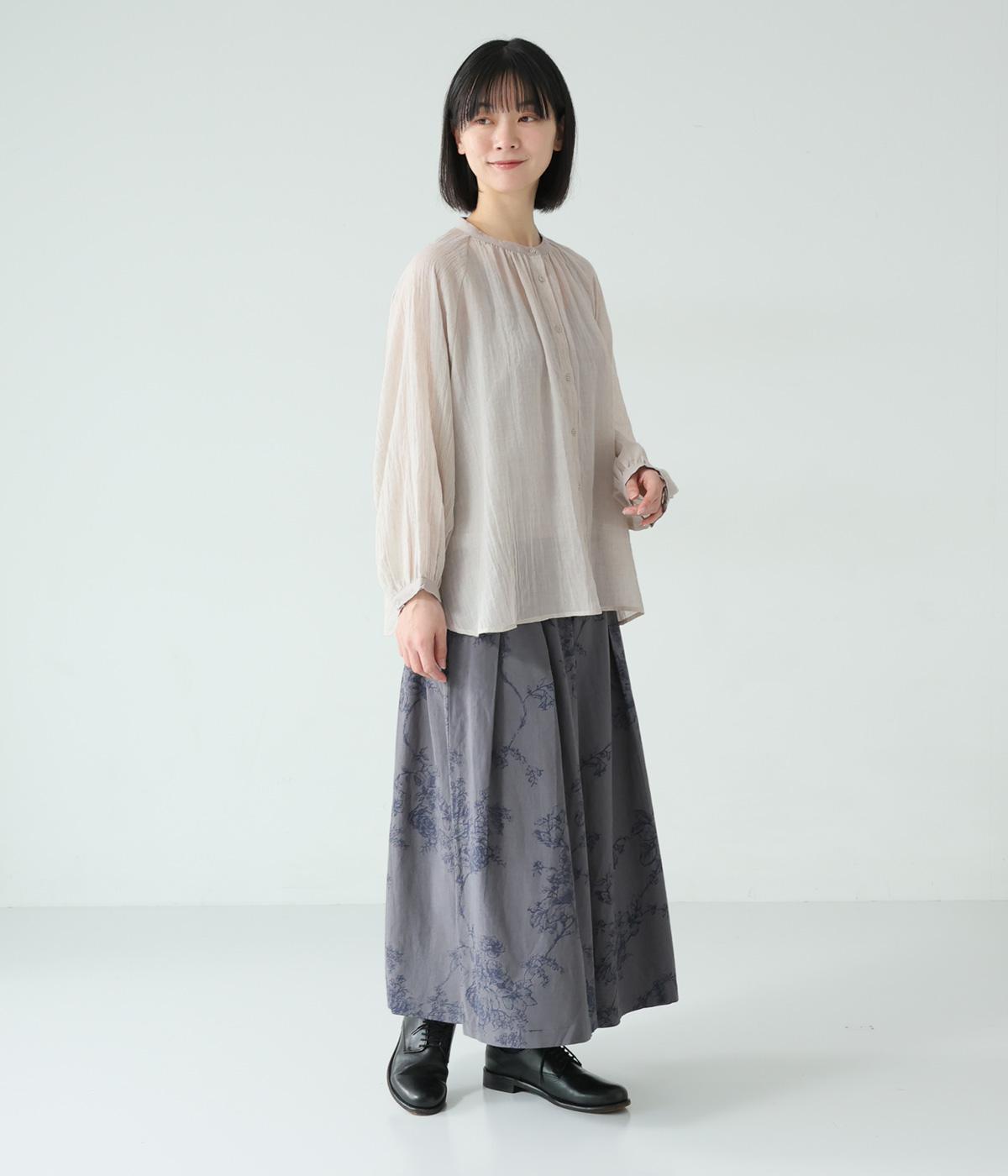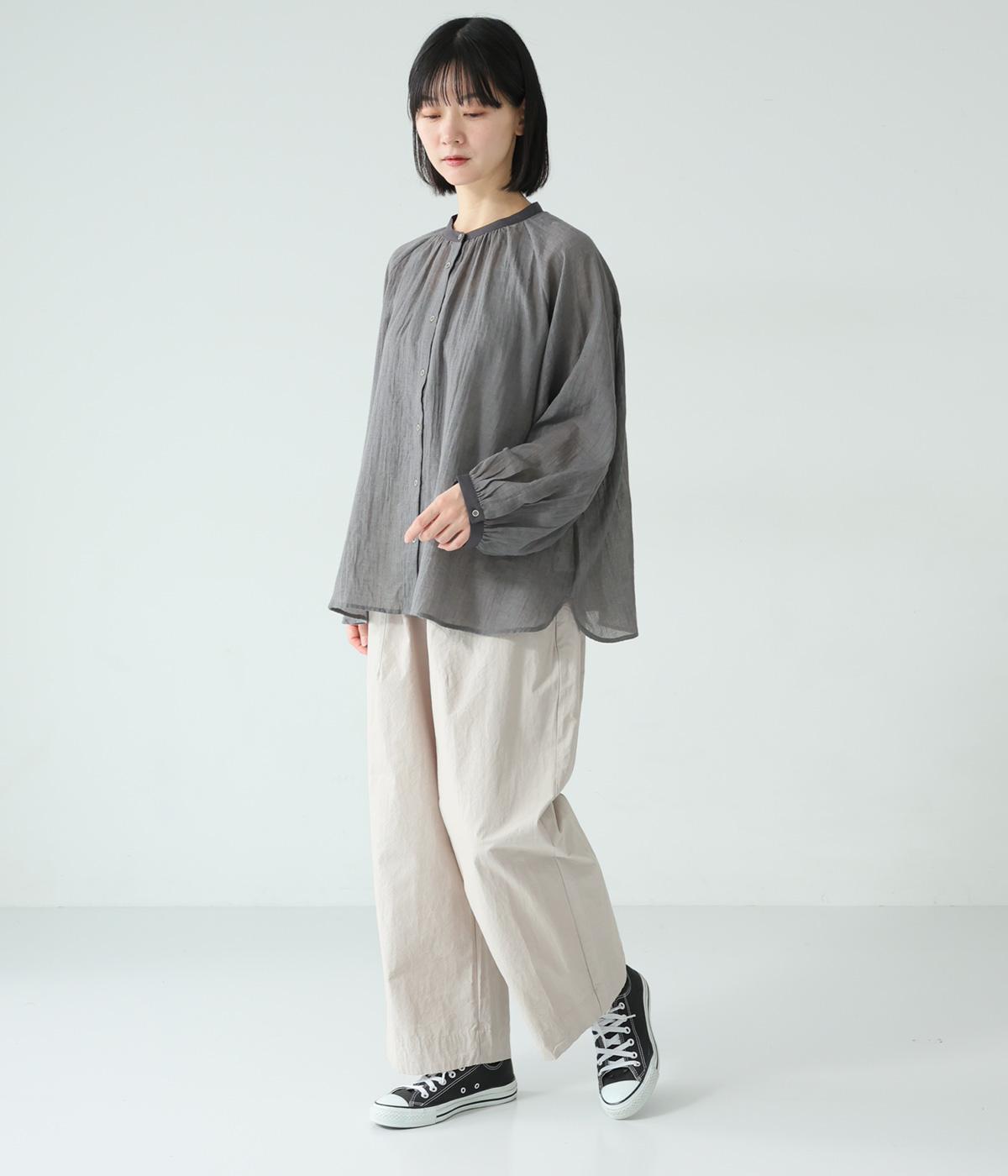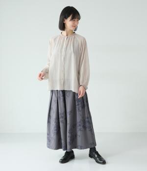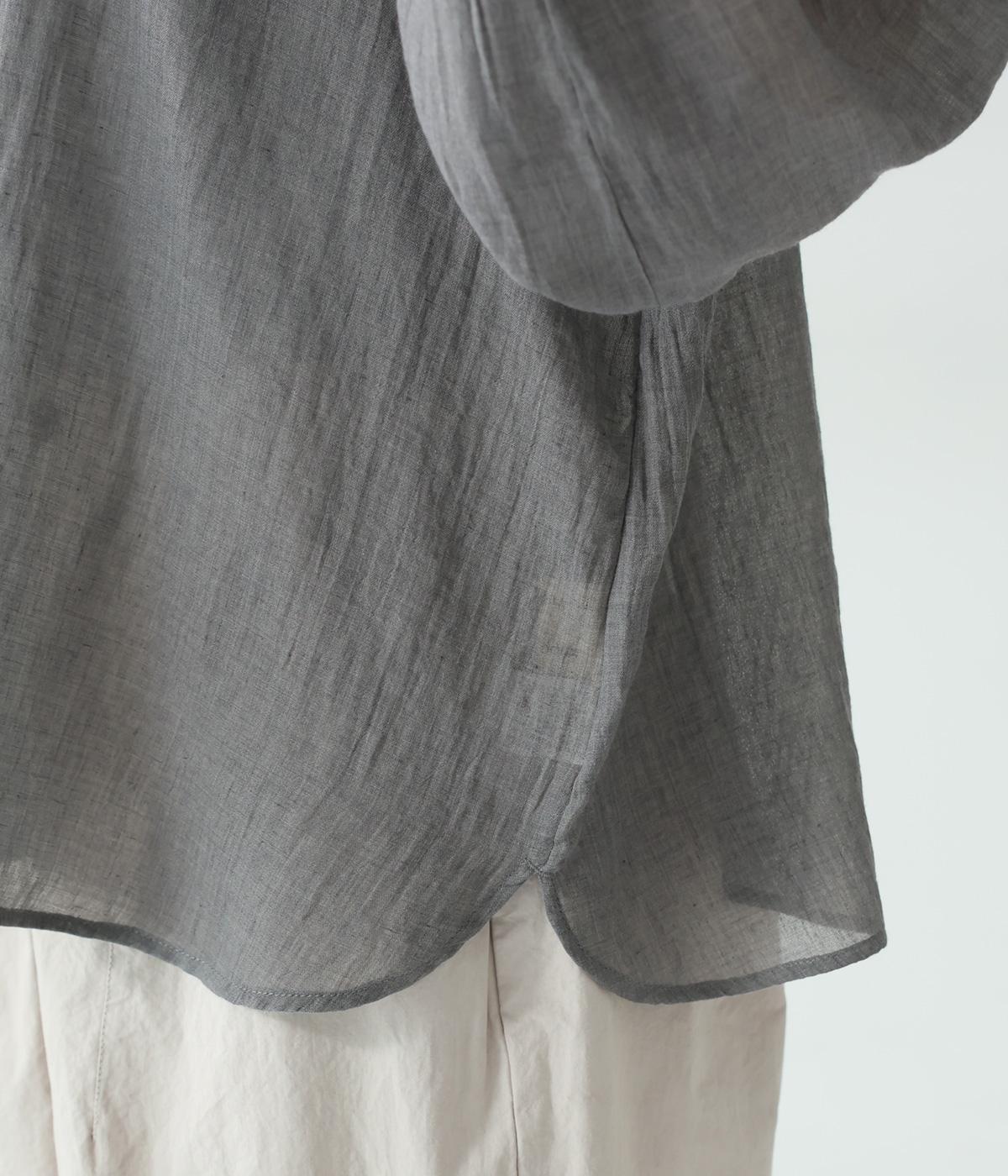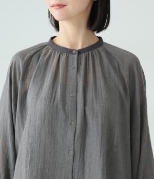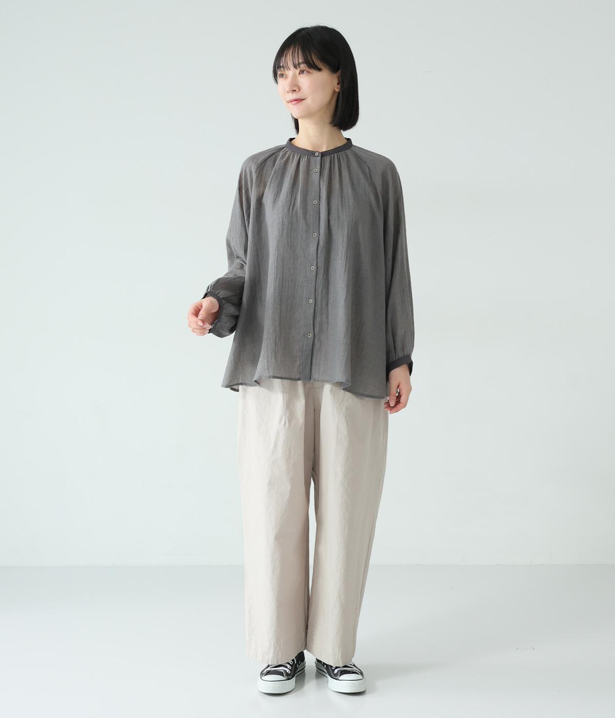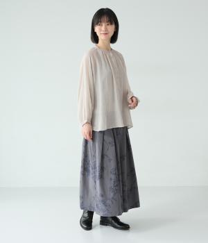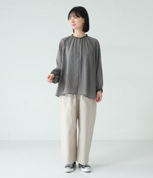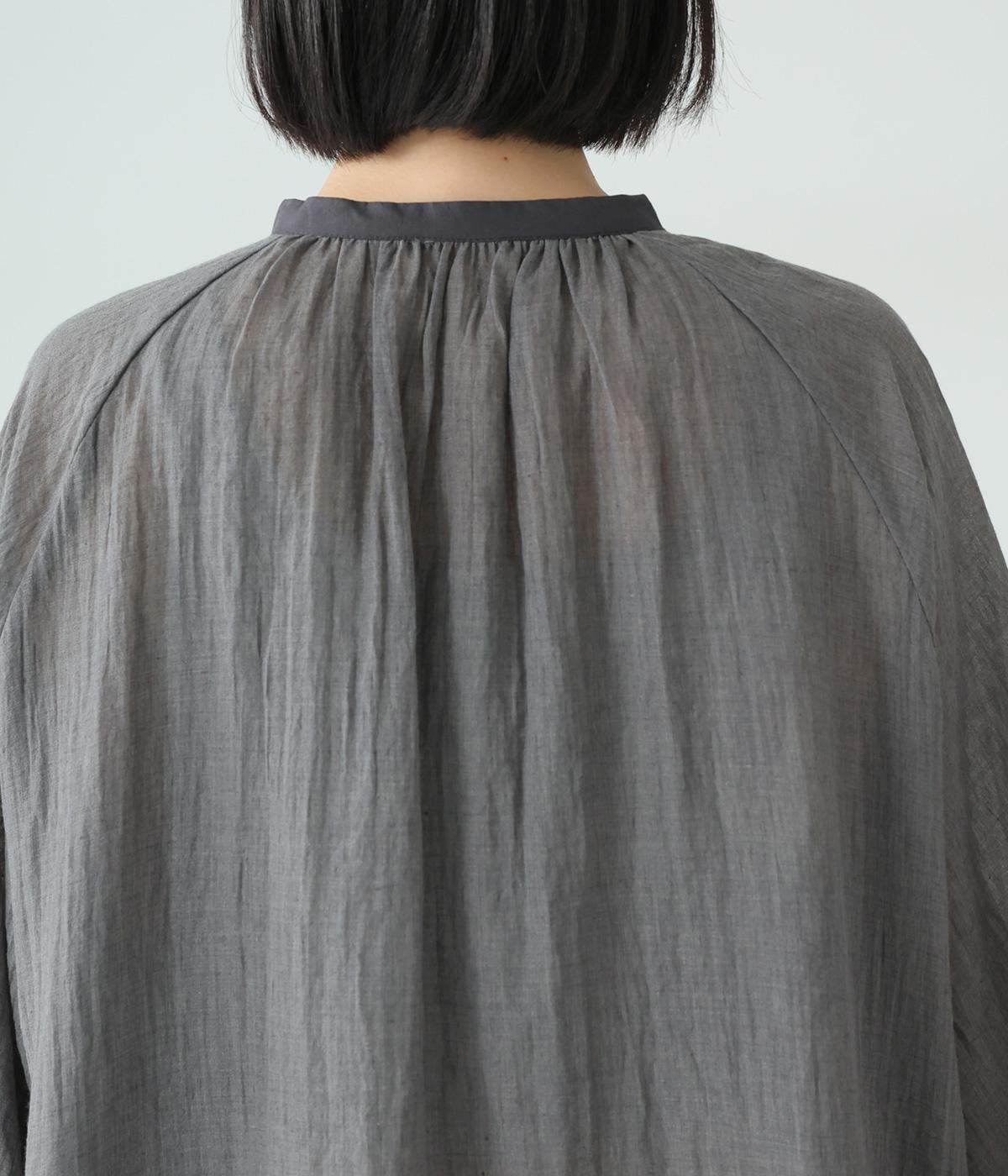 ナチュラルなシワ感のある素朴な雰囲気の混紡生地です。透け感のある軽やかさで落ち感があり、繊細なドレープをつくります。ふんわりと、空気を纏うような着心地です。