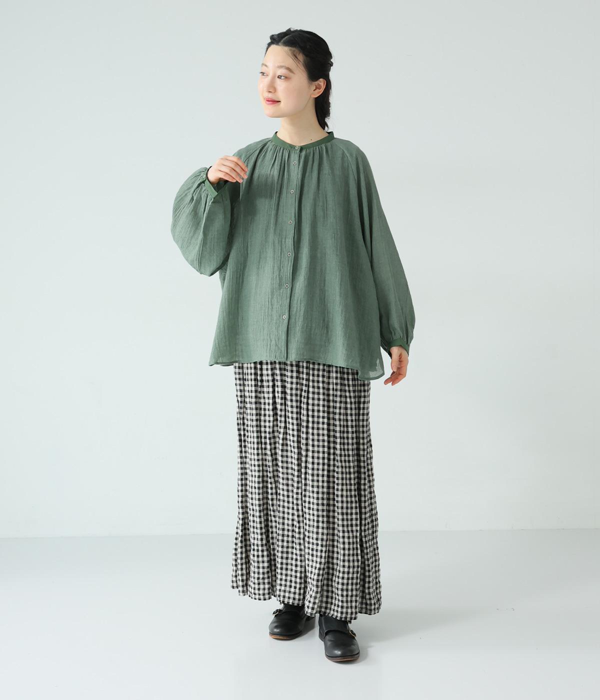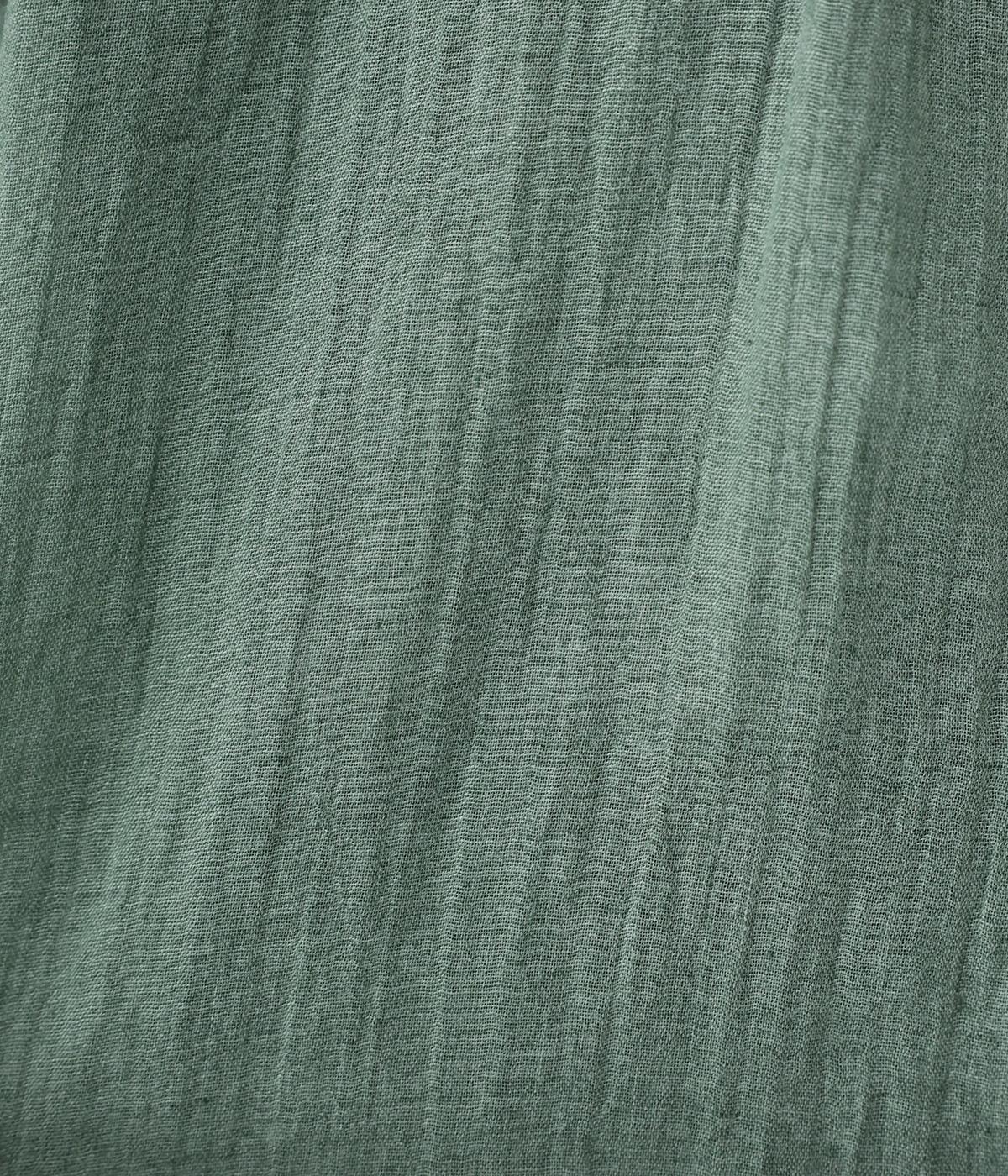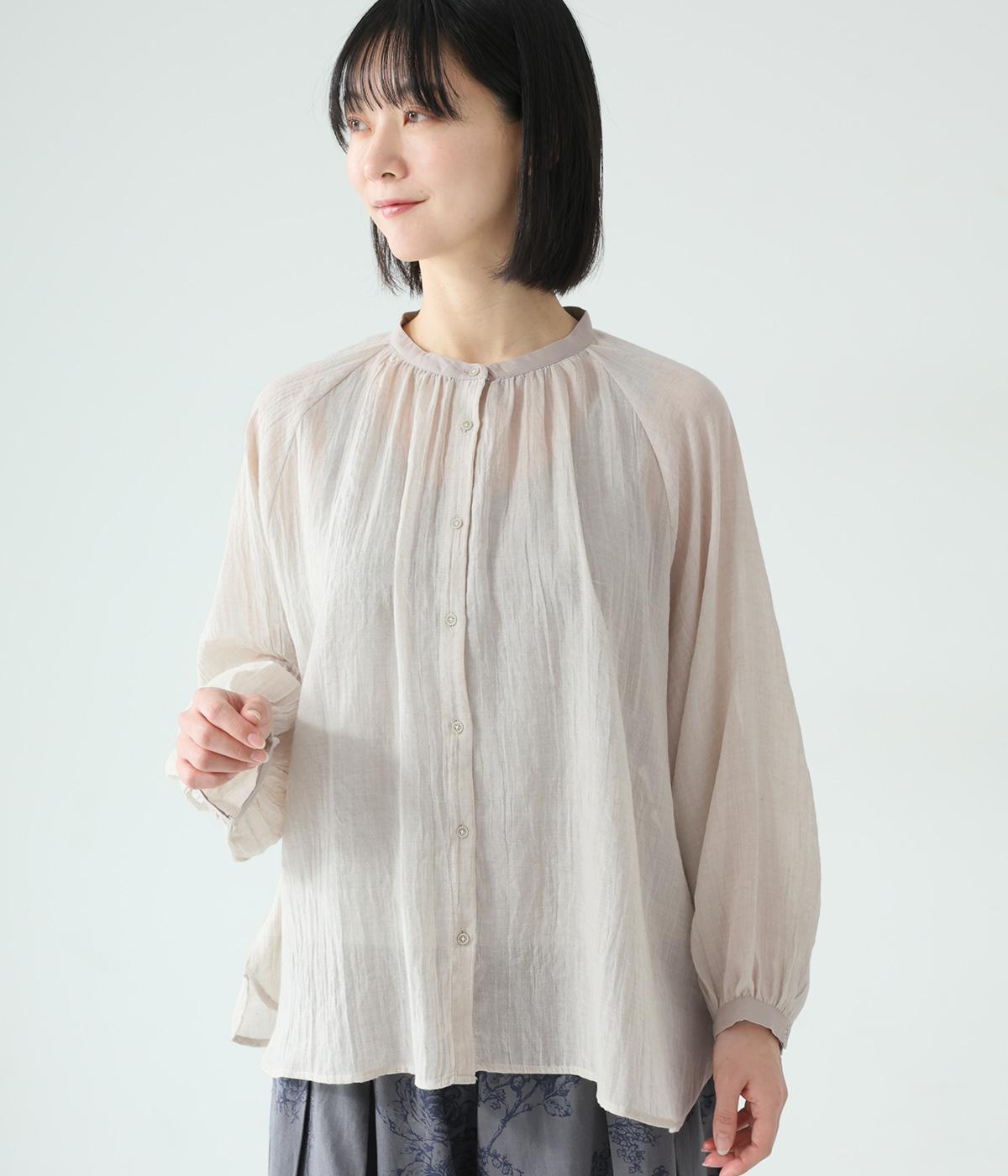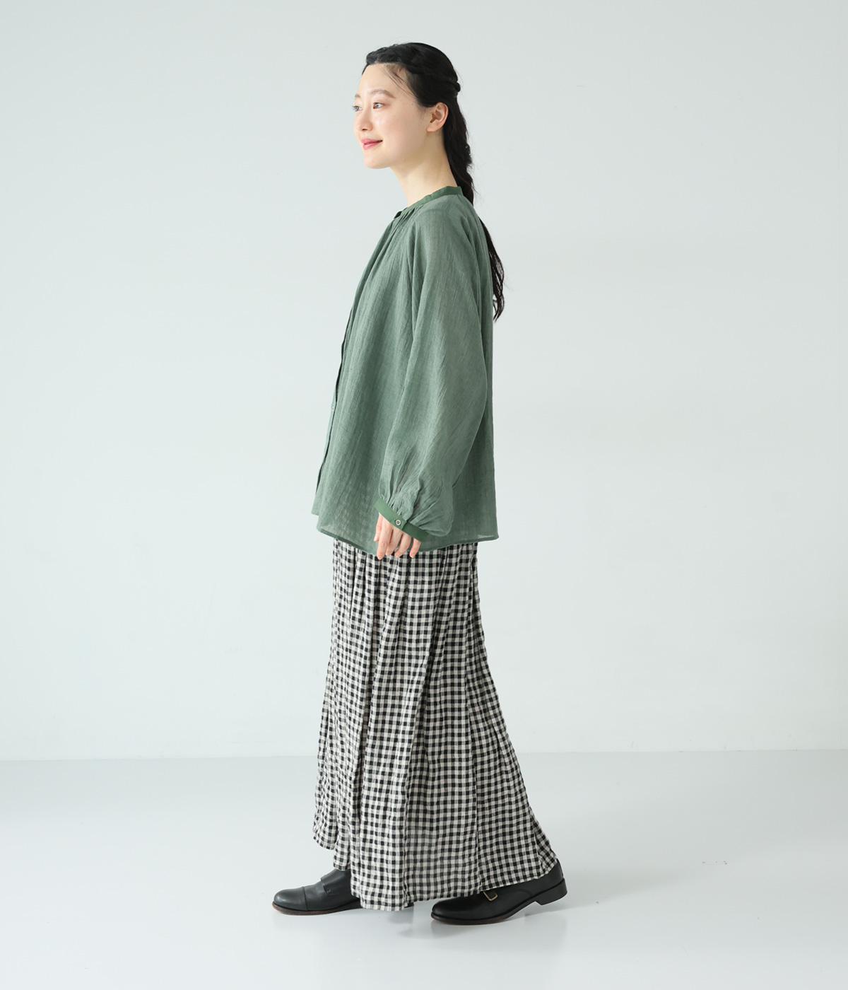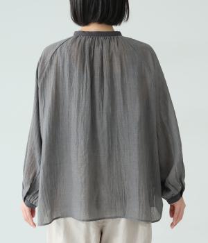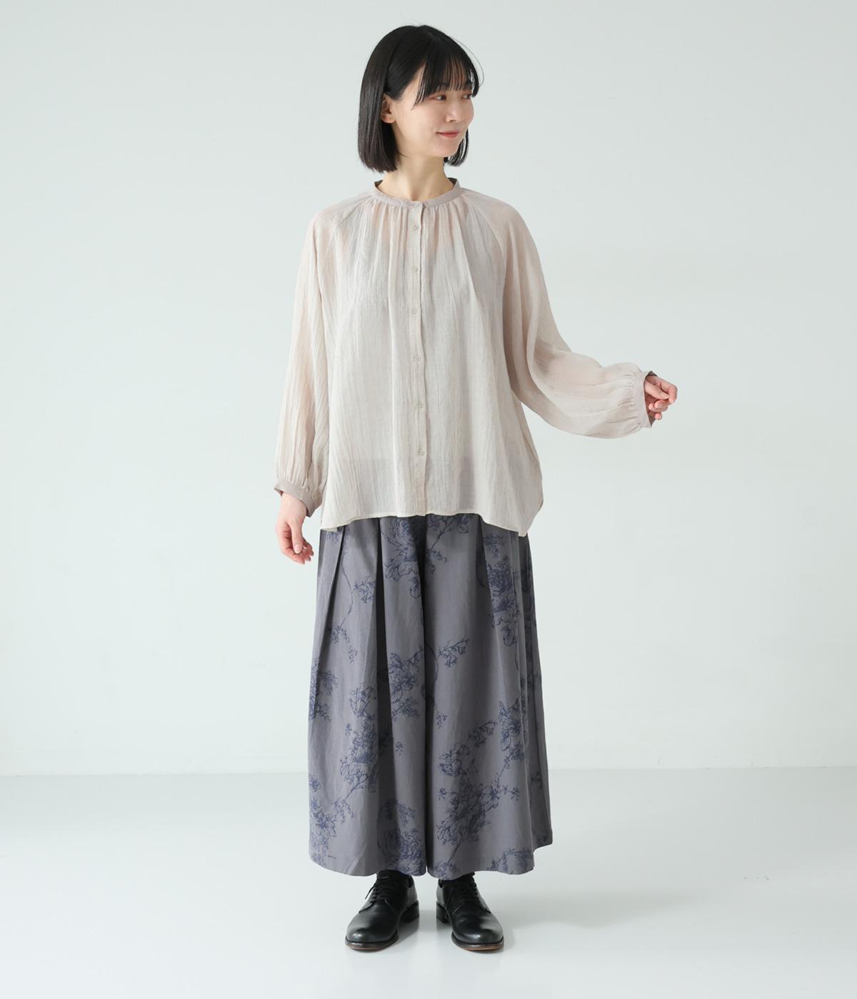 ナチュラルなシワ感のある素朴な雰囲気の混紡生地です。透け感のある軽やかさで落ち感があり、繊細なドレープをつくります。ふんわりと、空気を纏うような着心地です。