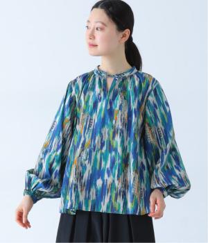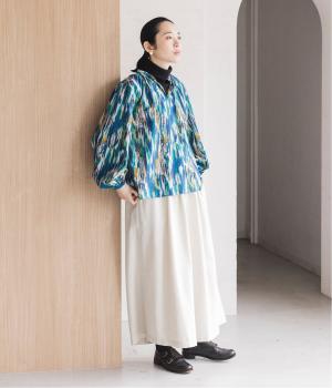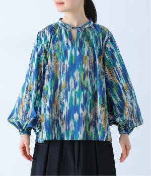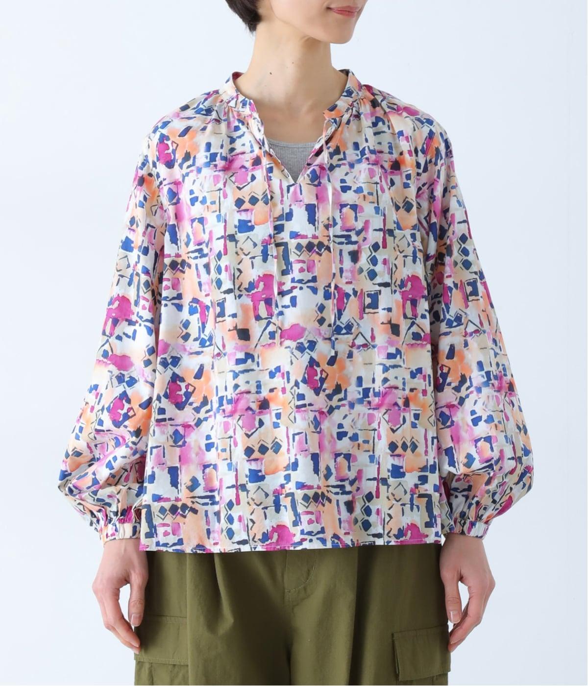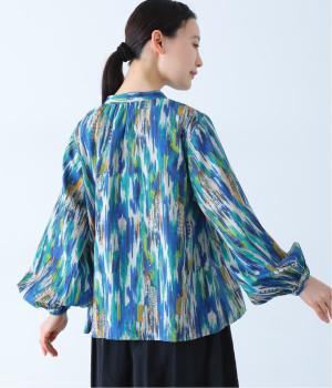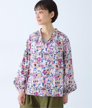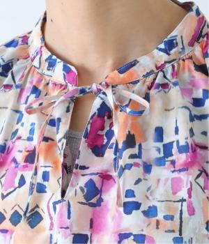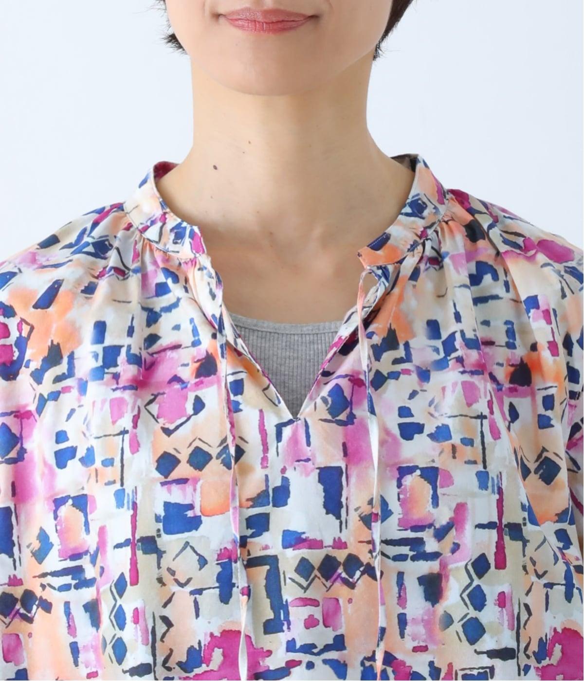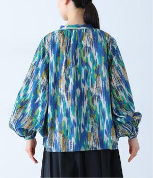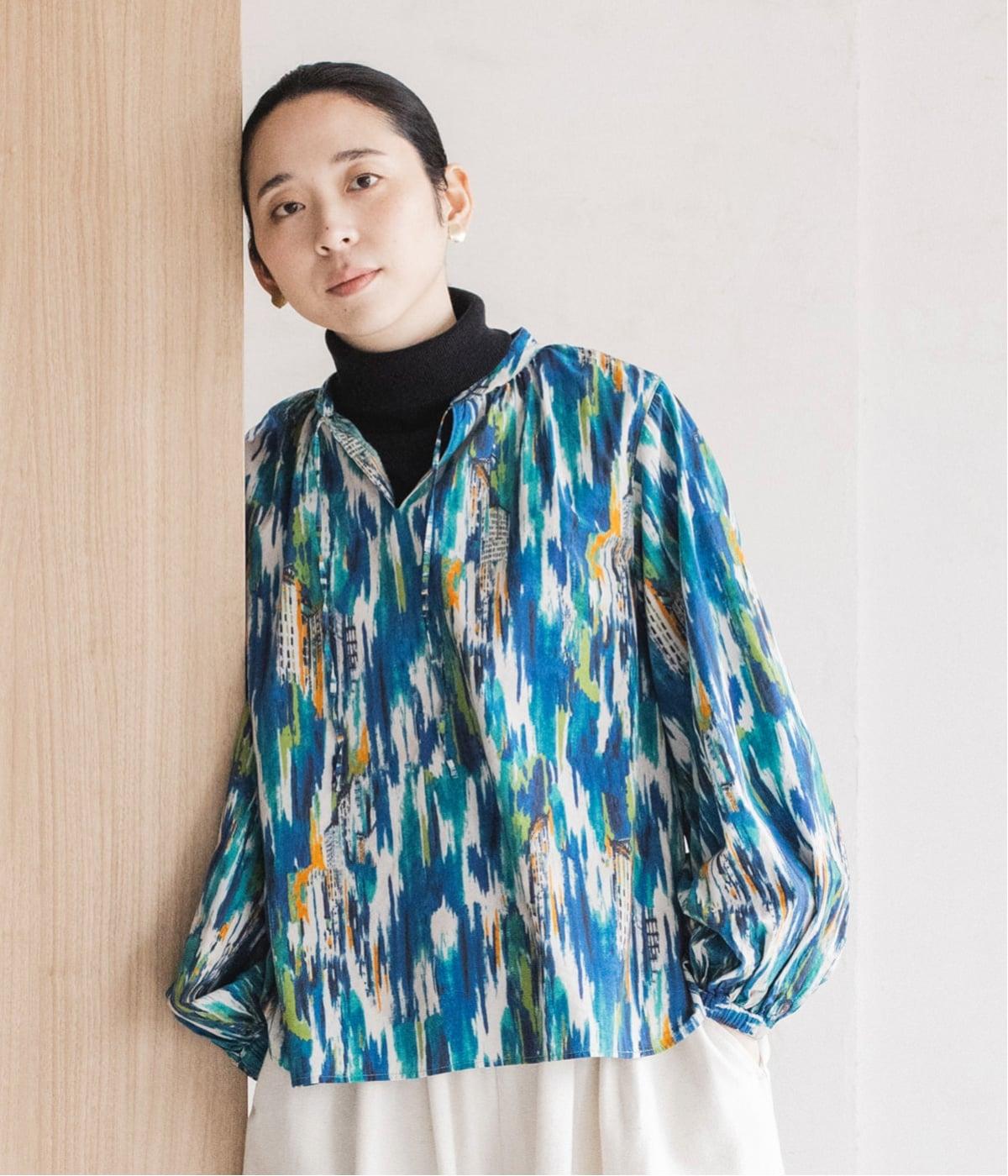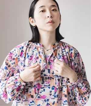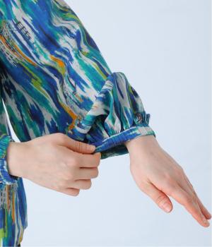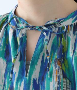 水彩絵の具が滲んだようなタッチの抽象柄が印象的なブラウス。ふんわりとした袖のシルエットがエレガントな雰囲気をつくります。首元の紐はそのままラフに垂らしても、かわいらしく結んでも、それぞれの表情を楽しめます。