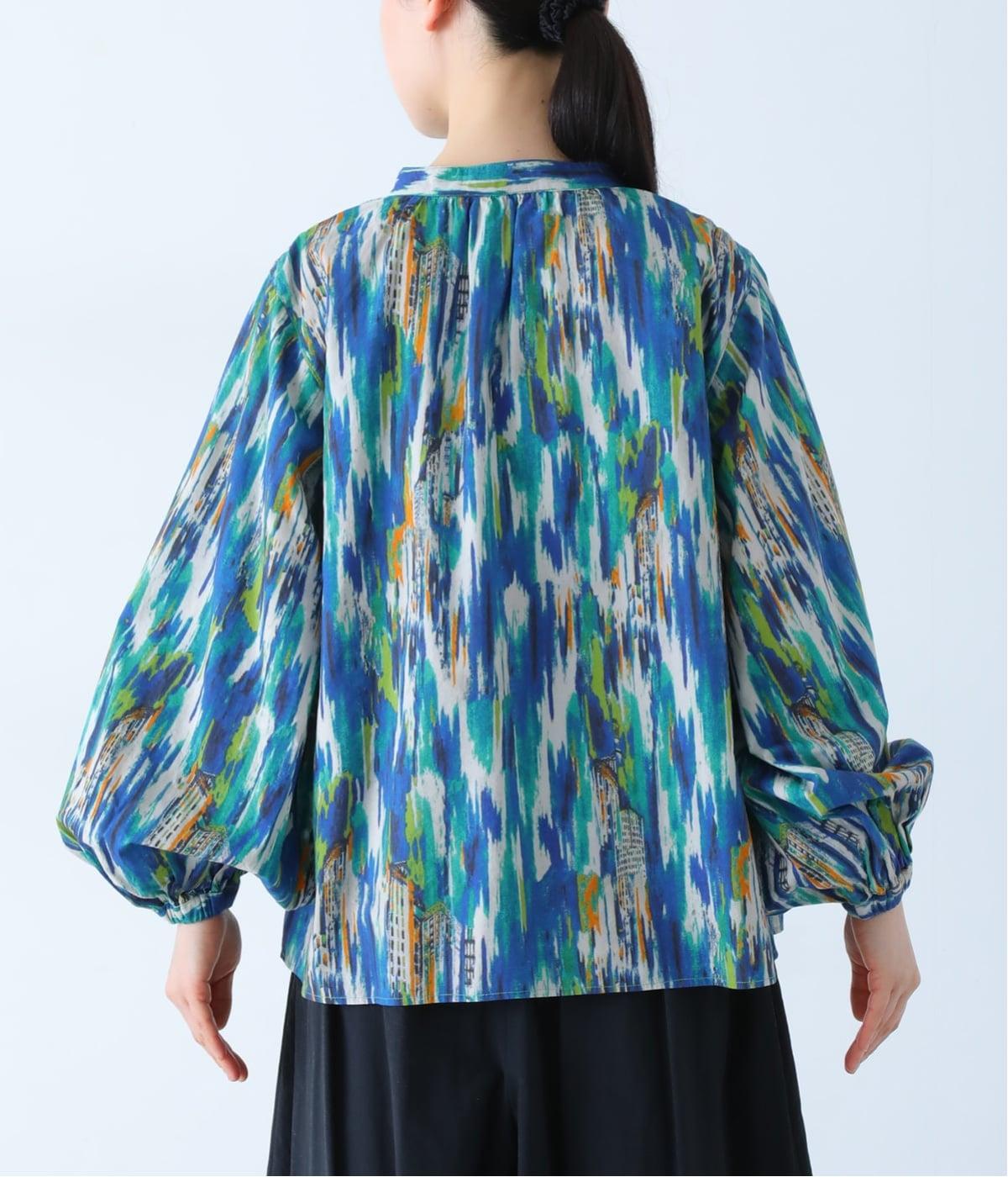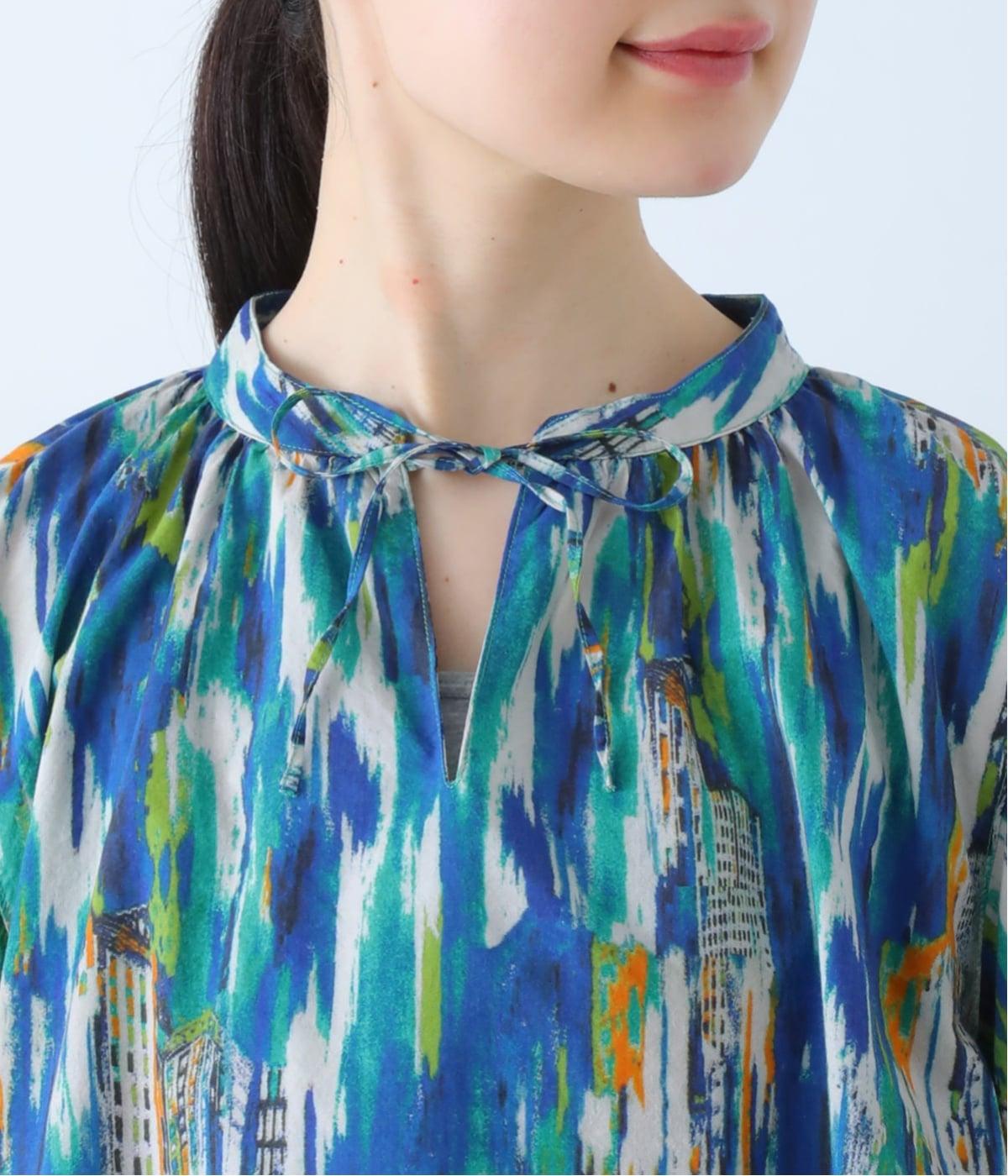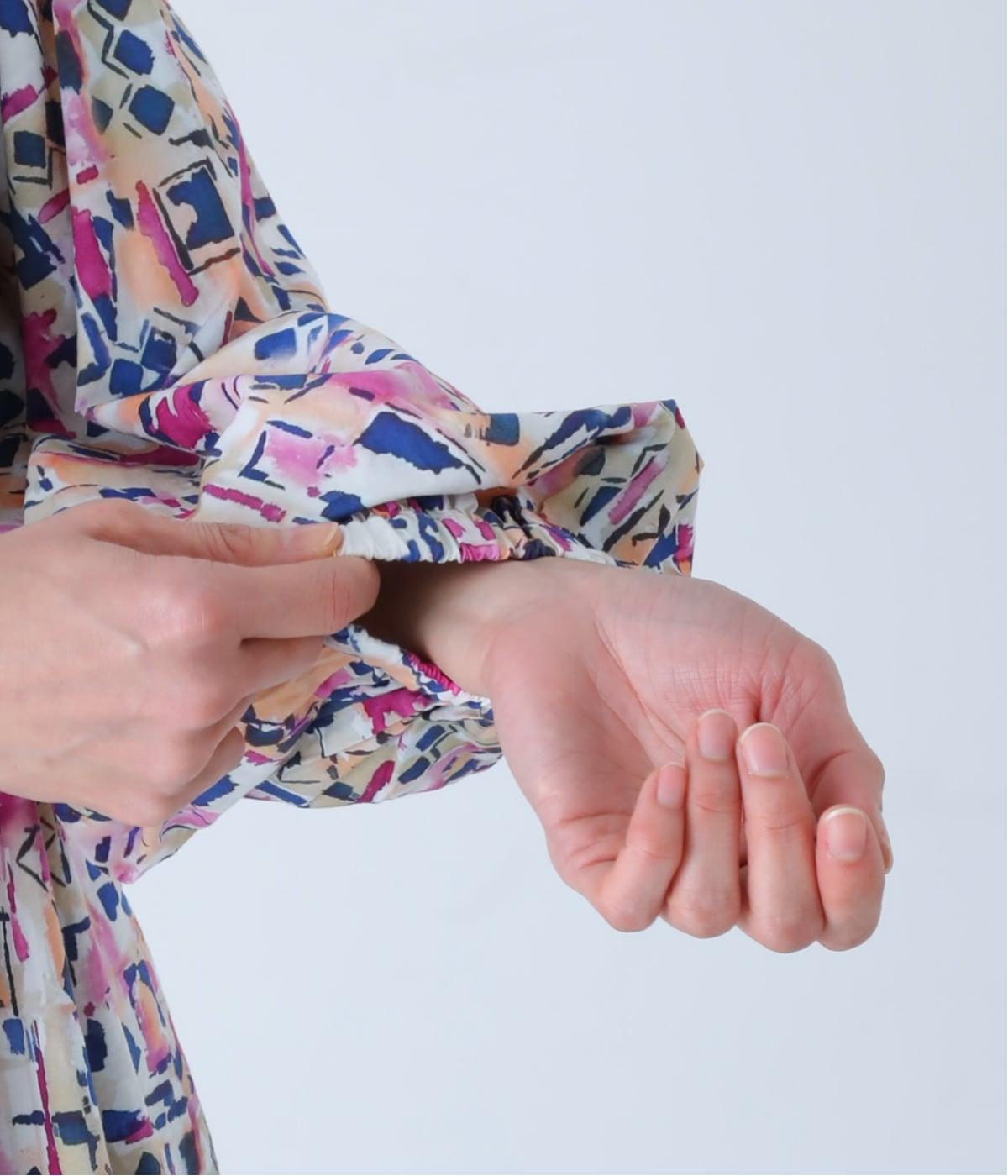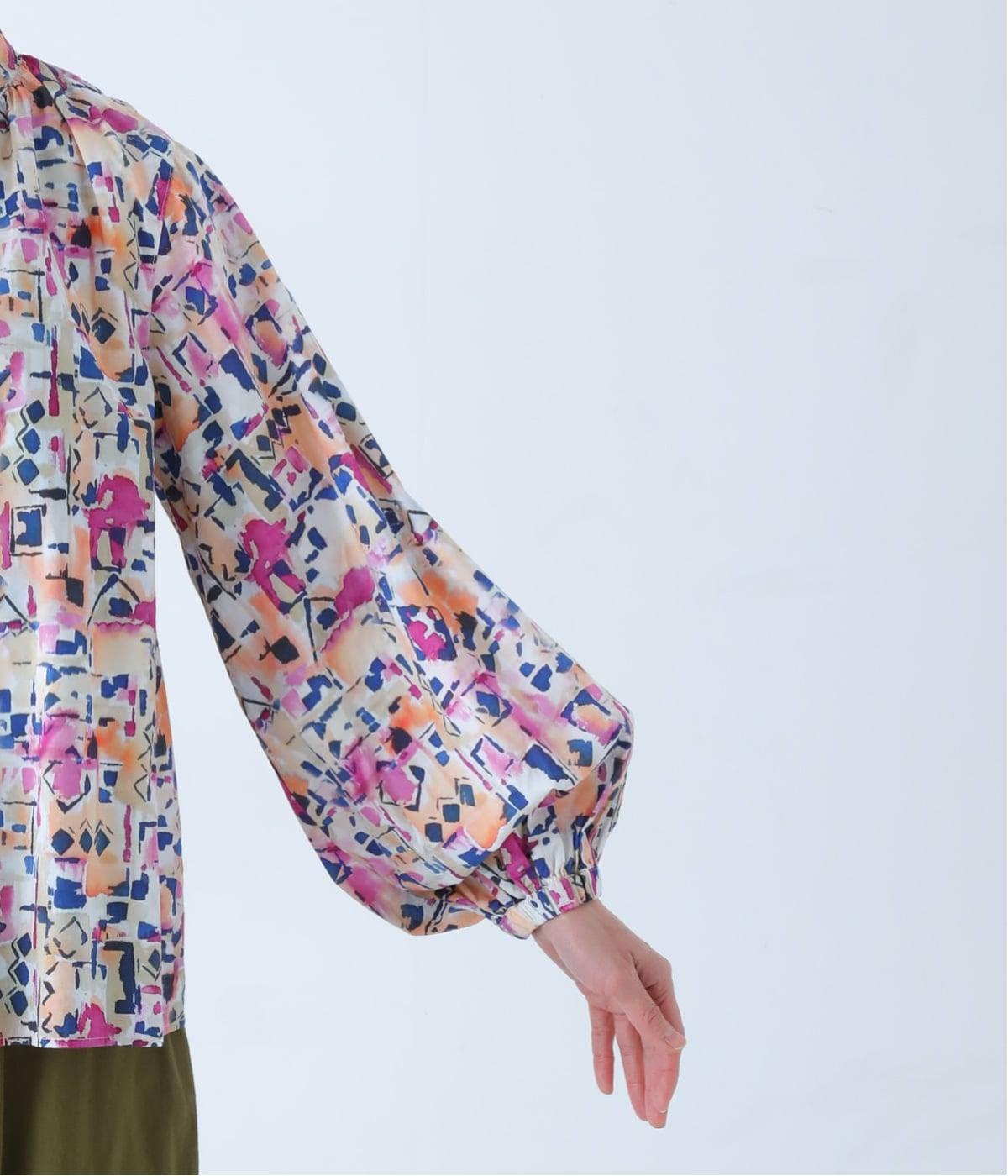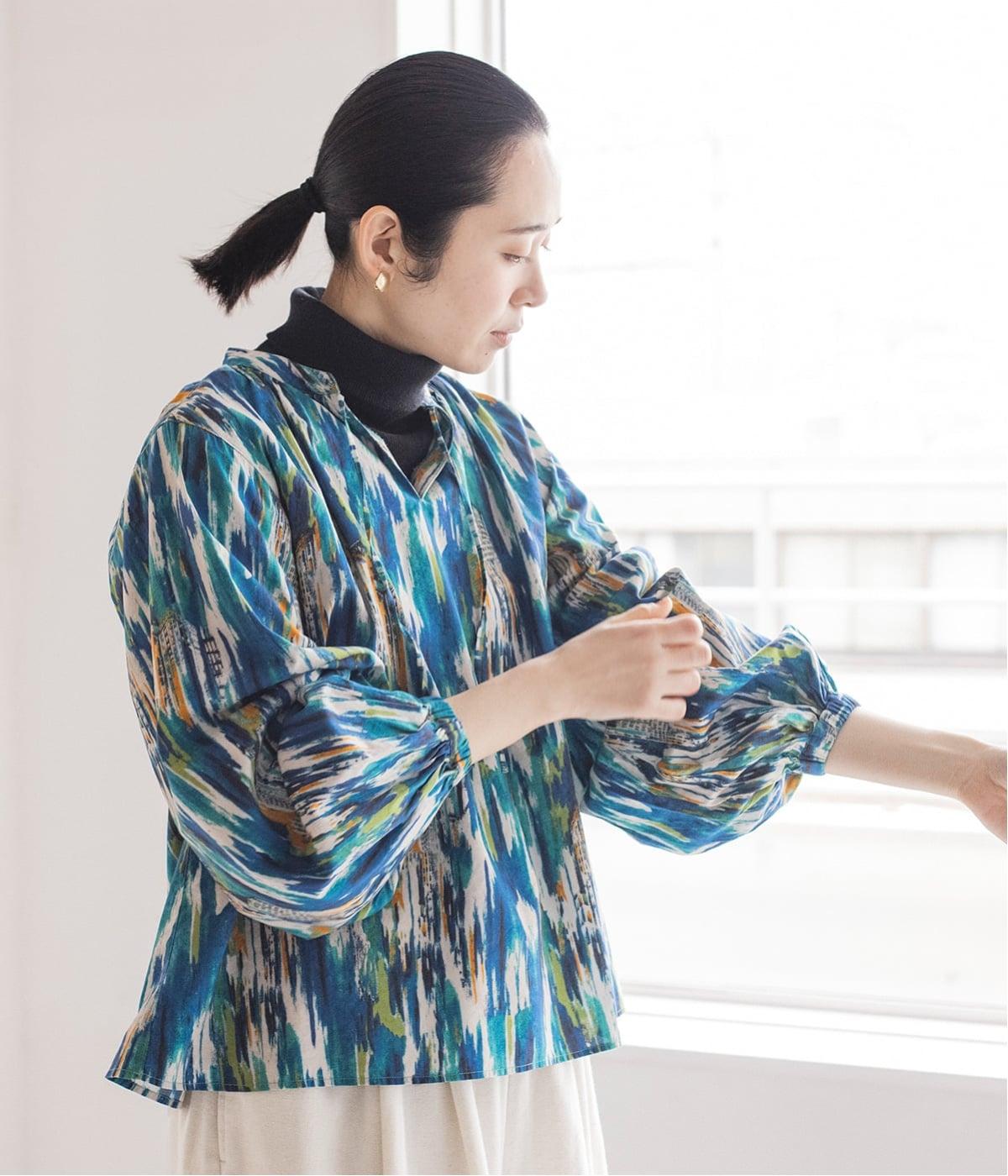 水彩絵の具が滲んだようなタッチの抽象柄が印象的なブラウス。ふんわりとした袖のシルエットがエレガントな雰囲気をつくります。首元の紐はそのままラフに垂らしても、かわいらしく結んでも、それぞれの表情を楽しめます。
