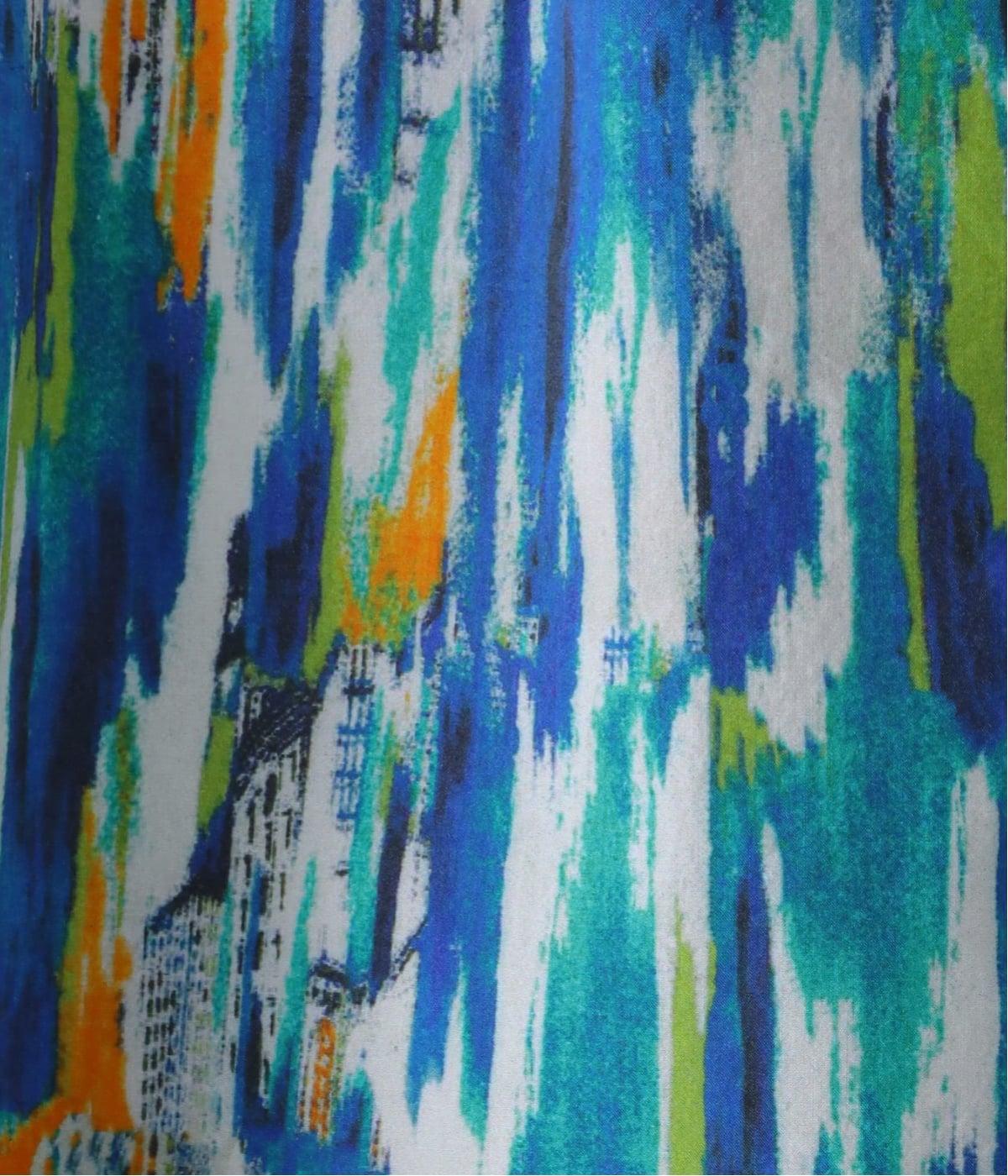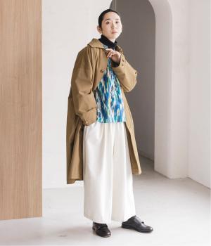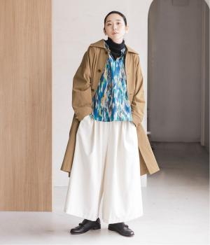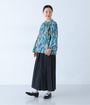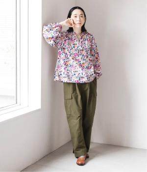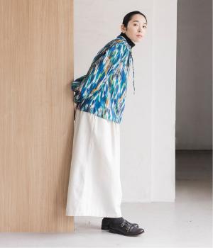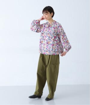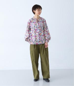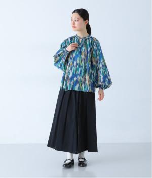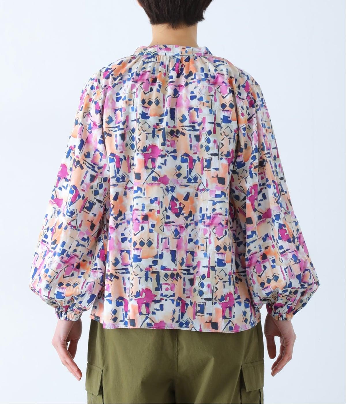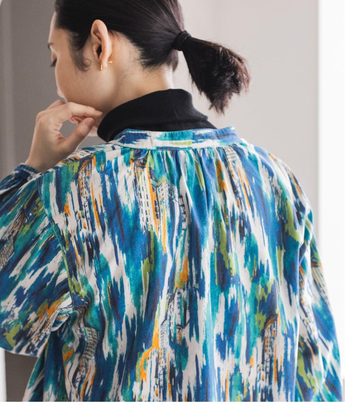 水彩絵の具が滲んだようなタッチの抽象柄が印象的なブラウス。ふんわりとした袖のシルエットがエレガントな雰囲気をつくります。首元の紐はそのままラフに垂らしても、かわいらしく結んでも、それぞれの表情を楽しめます。