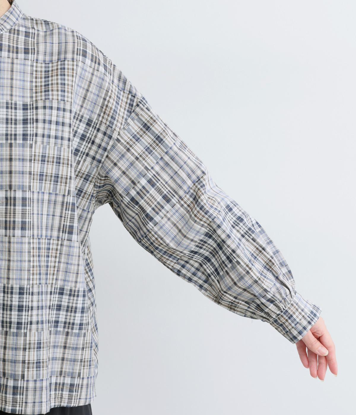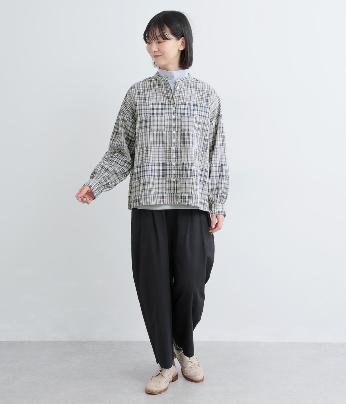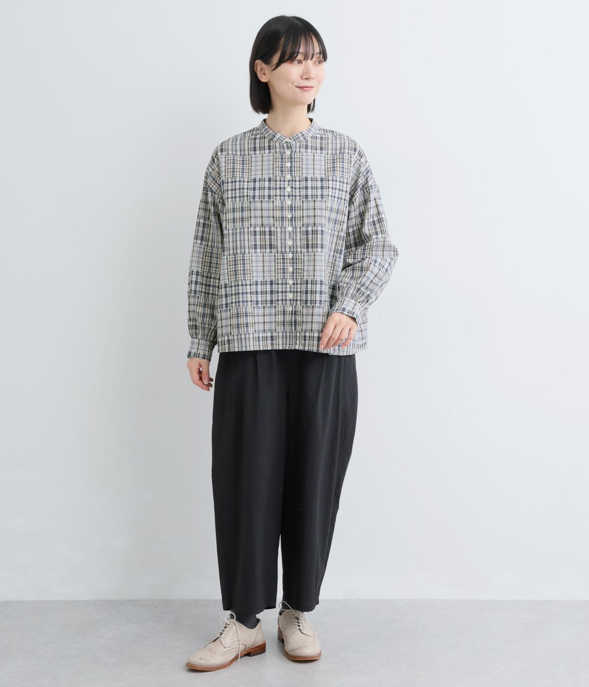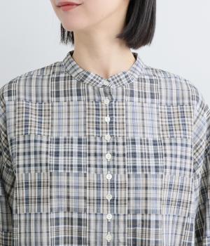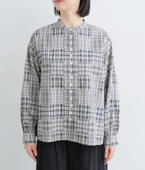 細かなチェック柄のパッチワークパターンがナチュラルな印象を与えるブラウス。すっきりとした首元とゆるやかなシルエットで上品に着こなせます。