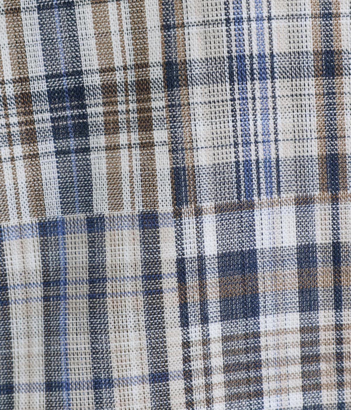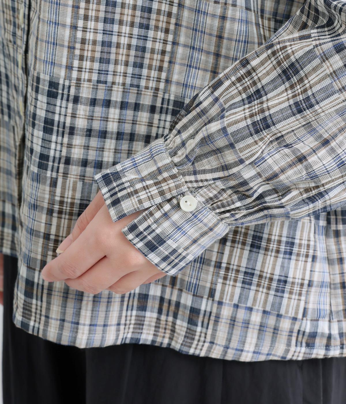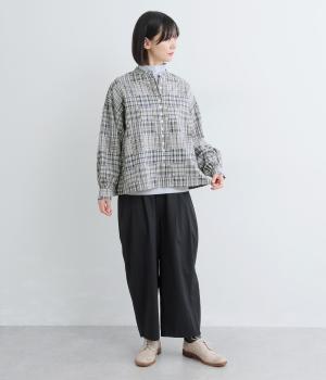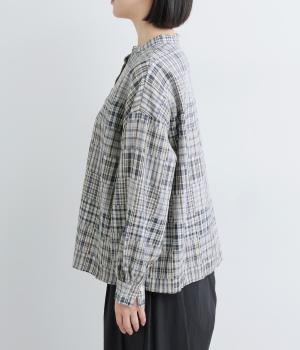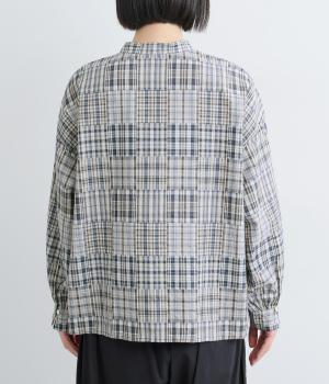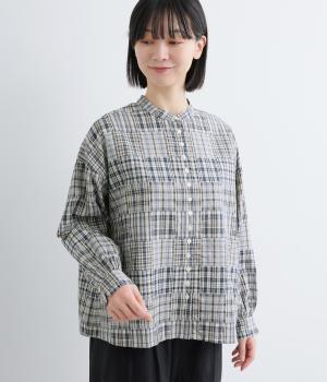 細かなチェック柄のパッチワークパターンがナチュラルな印象を与えるブラウス。すっきりとした首元とゆるやかなシルエットで上品に着こなせます。