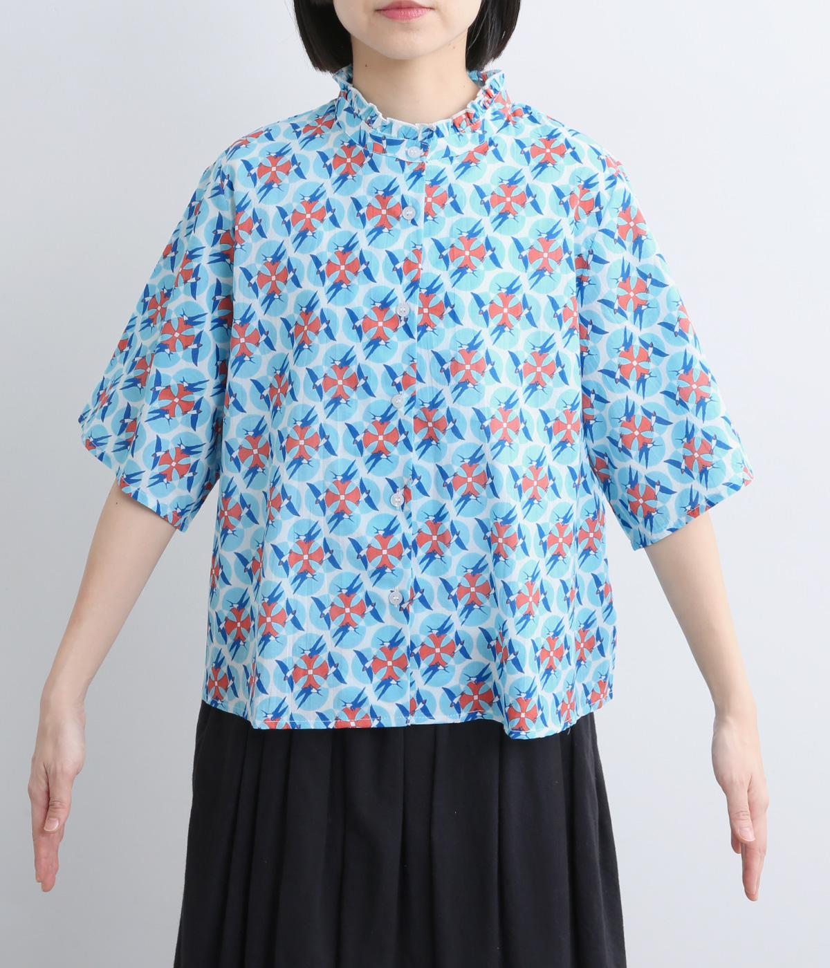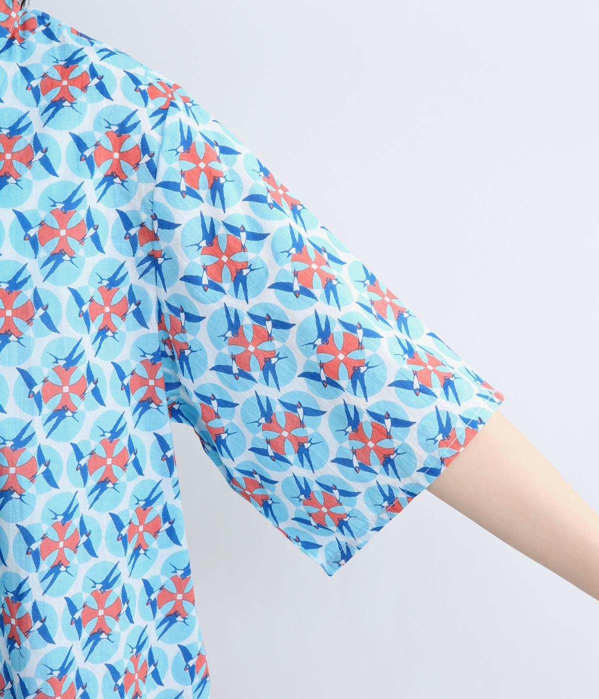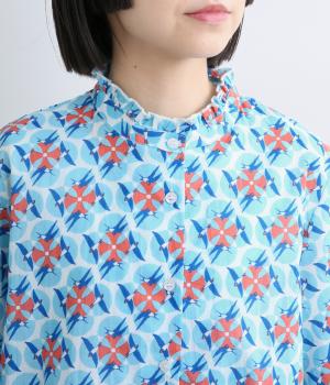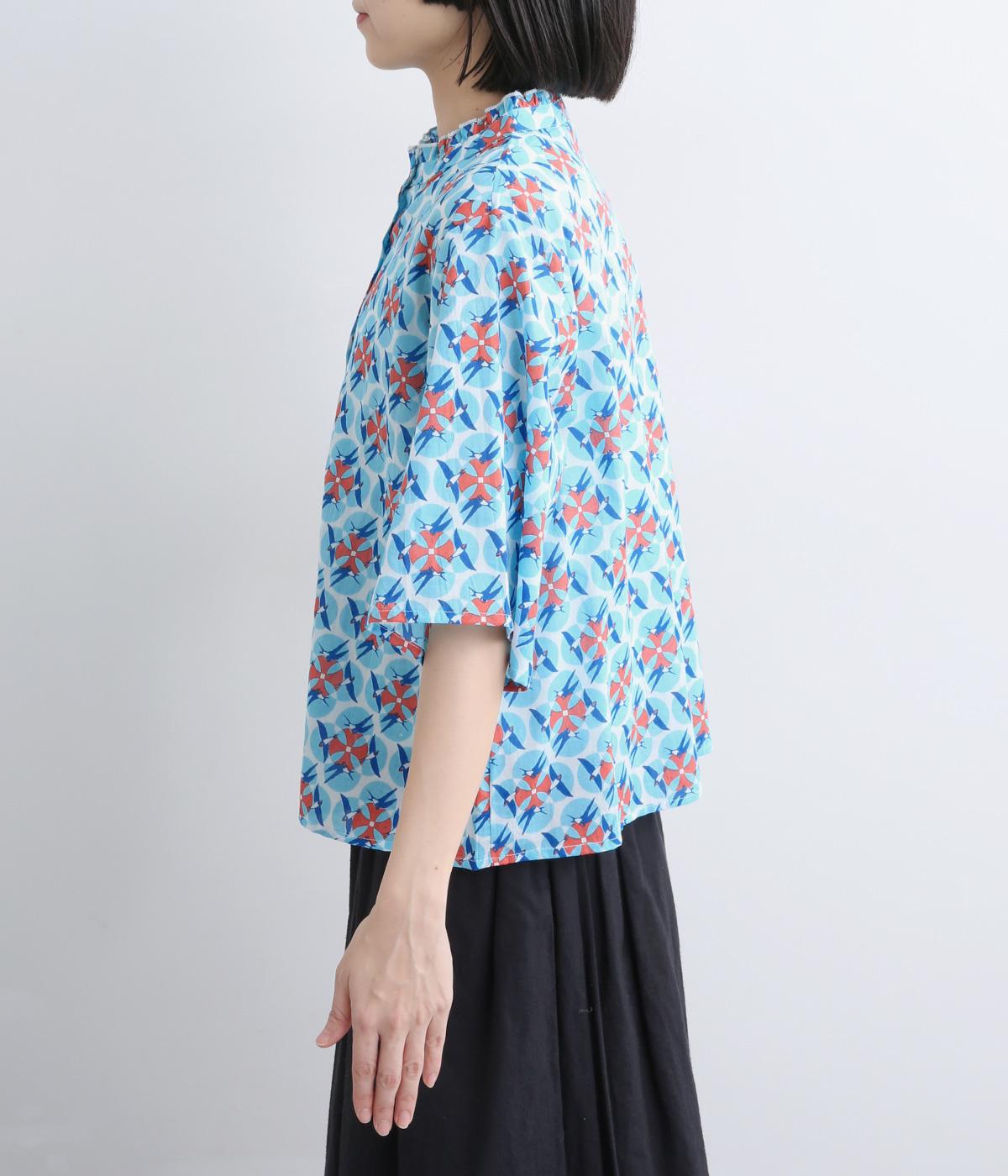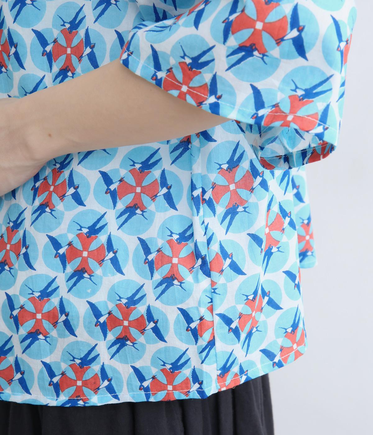 どこかレトロな空気をまとうスワロー柄のブラウス。燕たちが円を描くように舞うテキスタイルは、遠目には花のようにも映るデザインです。首元にはフリルをあしらい、ほのかな甘さを添えました。さらりと着られるゆったりとしたシルエットです。