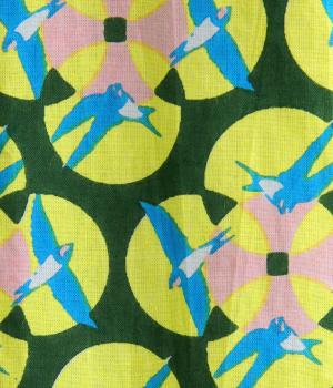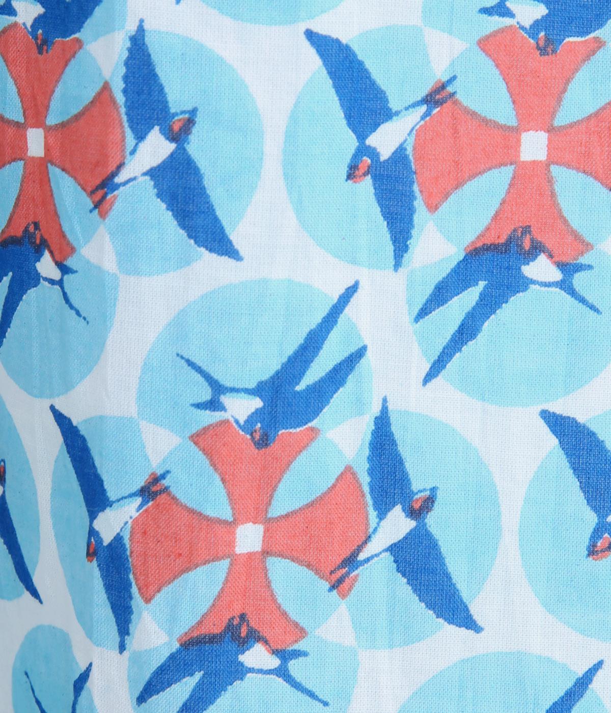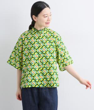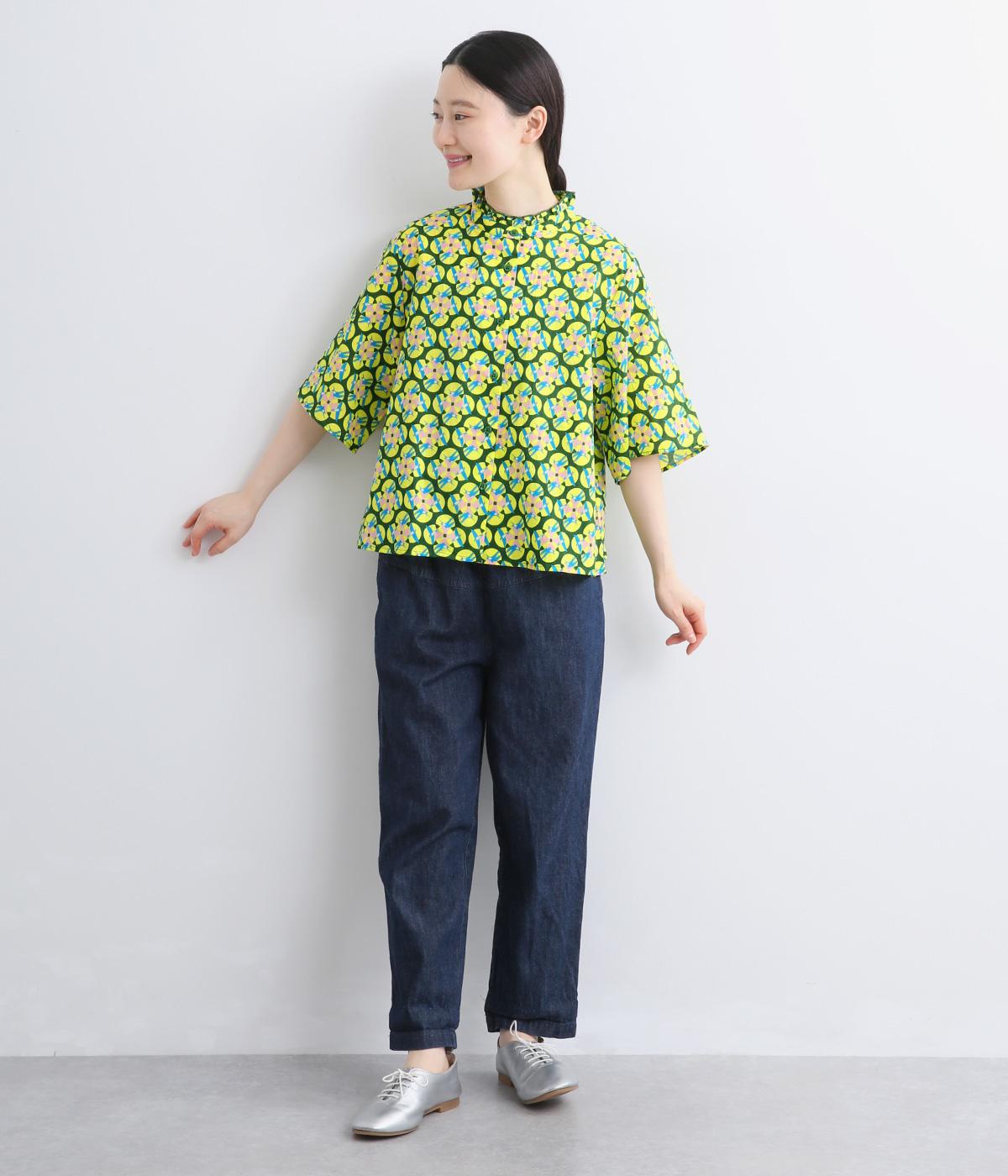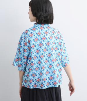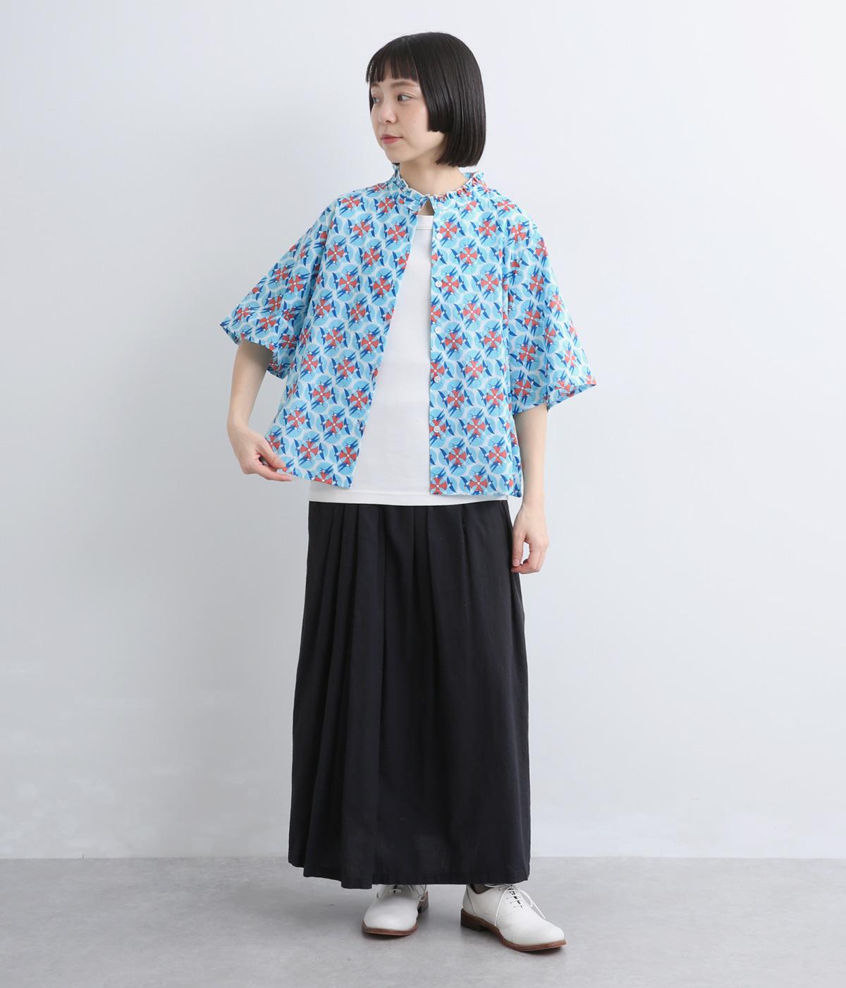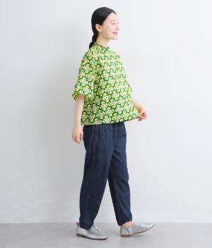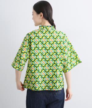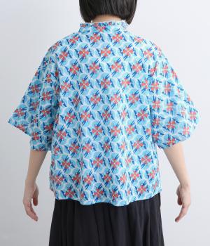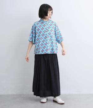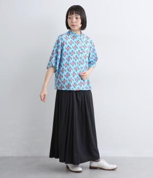 どこかレトロな空気をまとうスワロー柄のブラウス。燕たちが円を描くように舞うテキスタイルは、遠目には花のようにも映るデザインです。首元にはフリルをあしらい、ほのかな甘さを添えました。さらりと着られるゆったりとしたシルエットです。