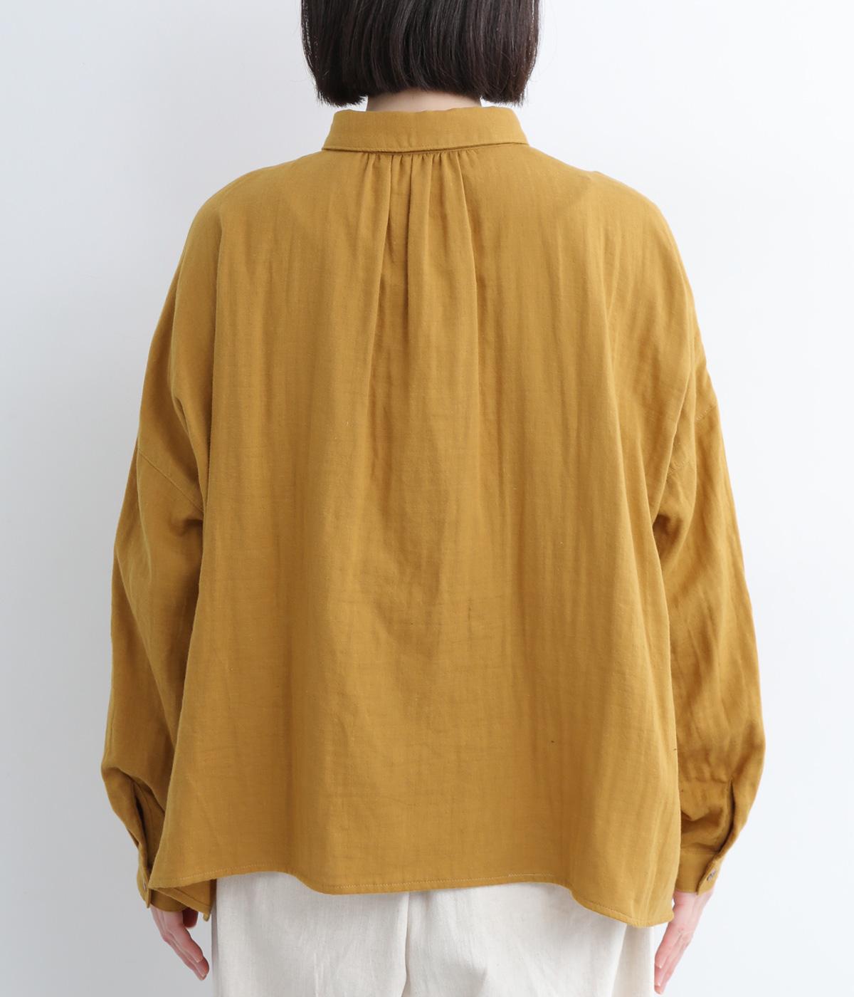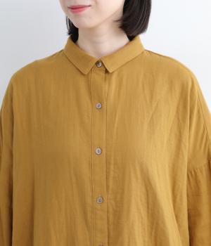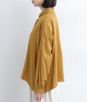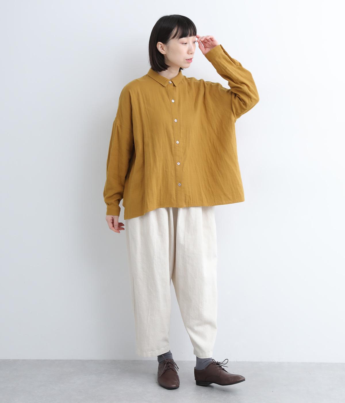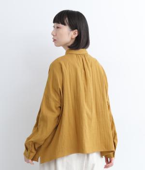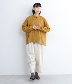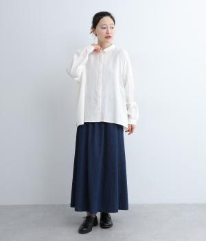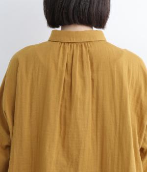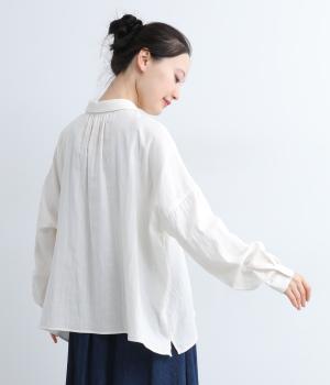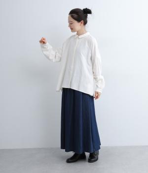 小さな襟がかわいらしいオーバーサイズのブラウス。ボリュームを持たせつつも着用すると自然となじむのがこだわり。後ろは襟ぐりにギャザーを入れてフレア感を出し、羽織りにしたスタイリングもおすすめです。