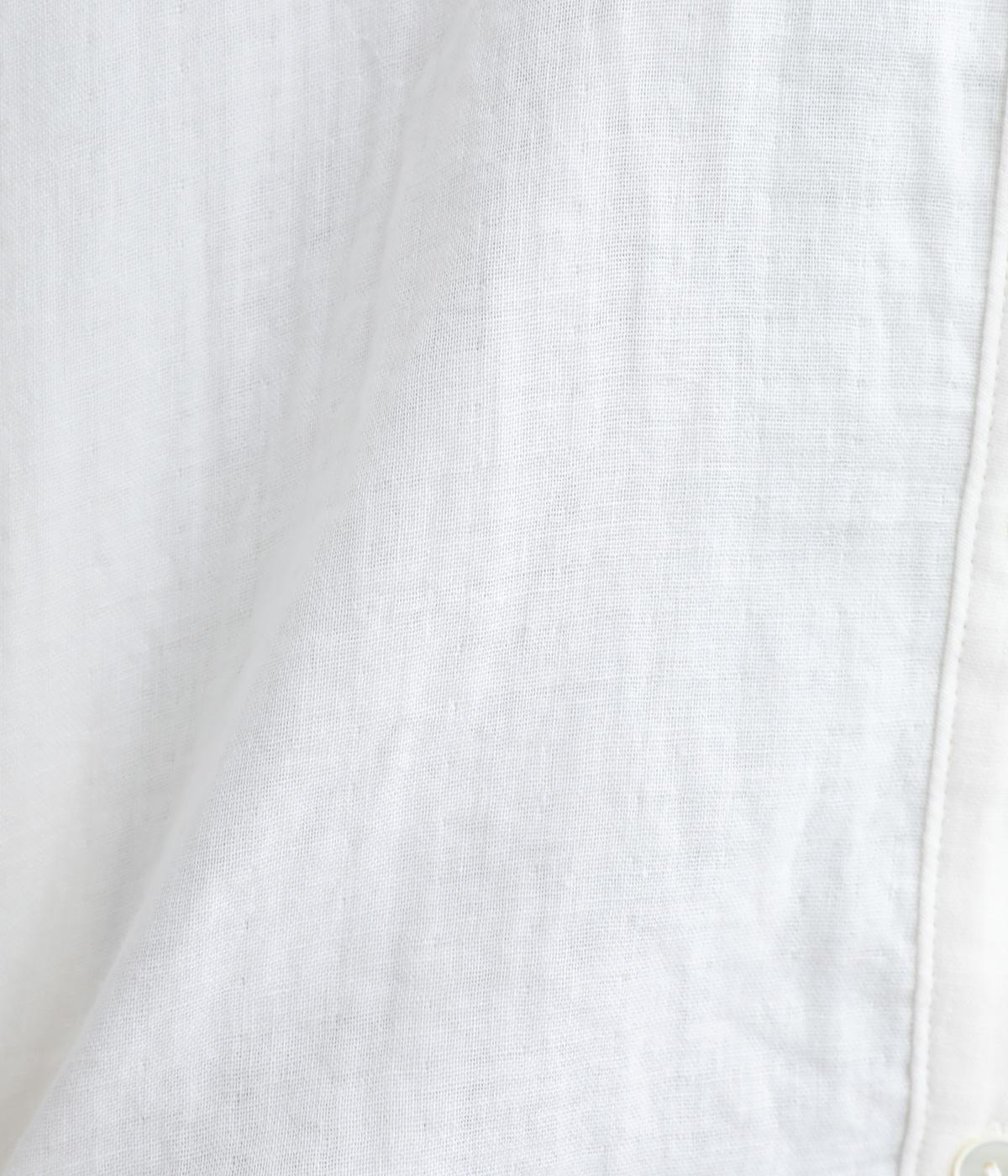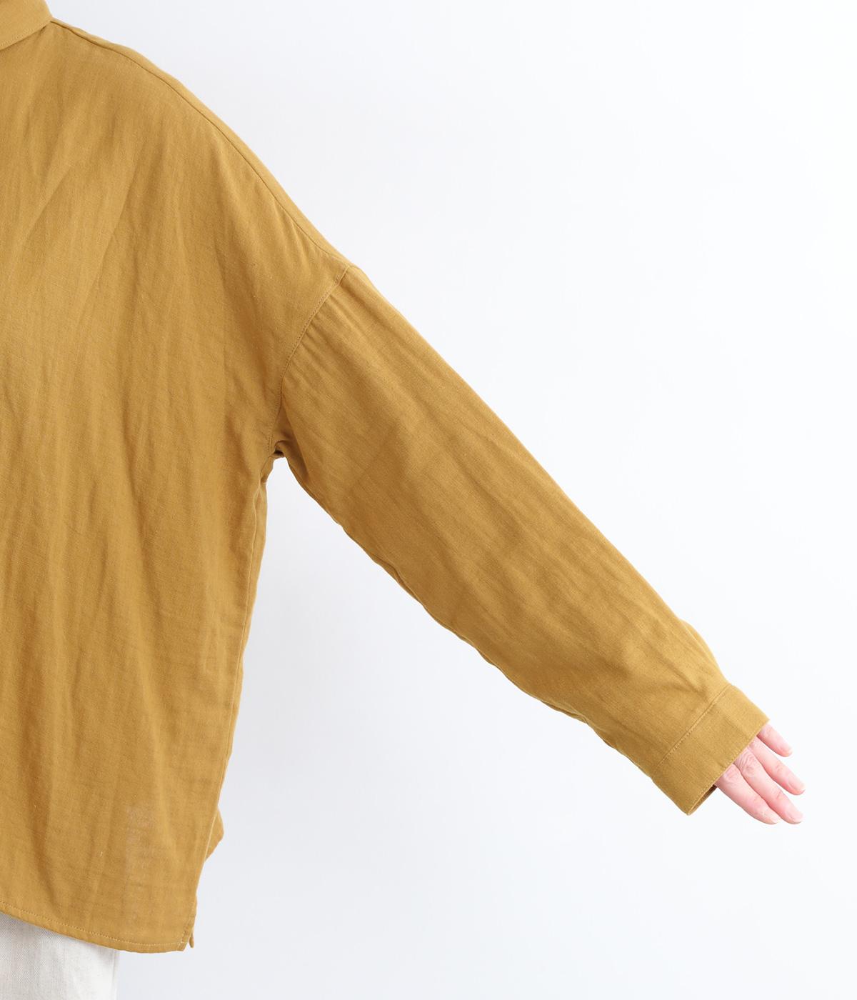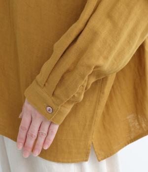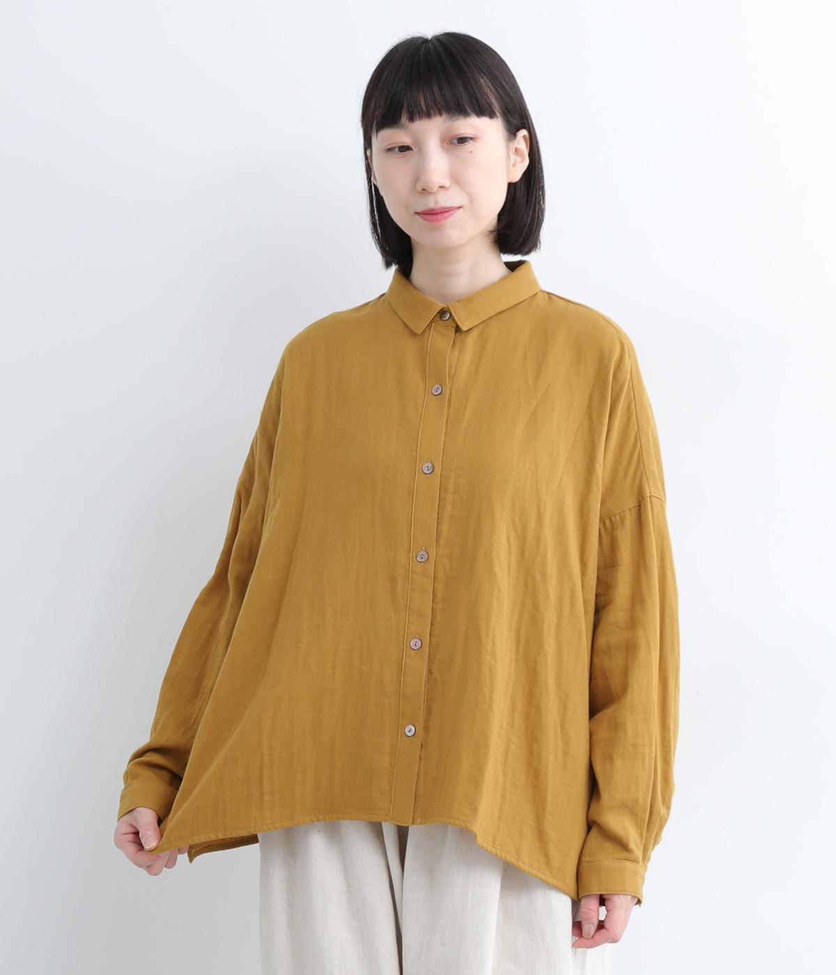 小さな襟がかわいらしいオーバーサイズのブラウス。ボリュームを持たせつつも着用すると自然となじむのがこだわり。後ろは襟ぐりにギャザーを入れてフレア感を出し、羽織りにしたスタイリングもおすすめです。
