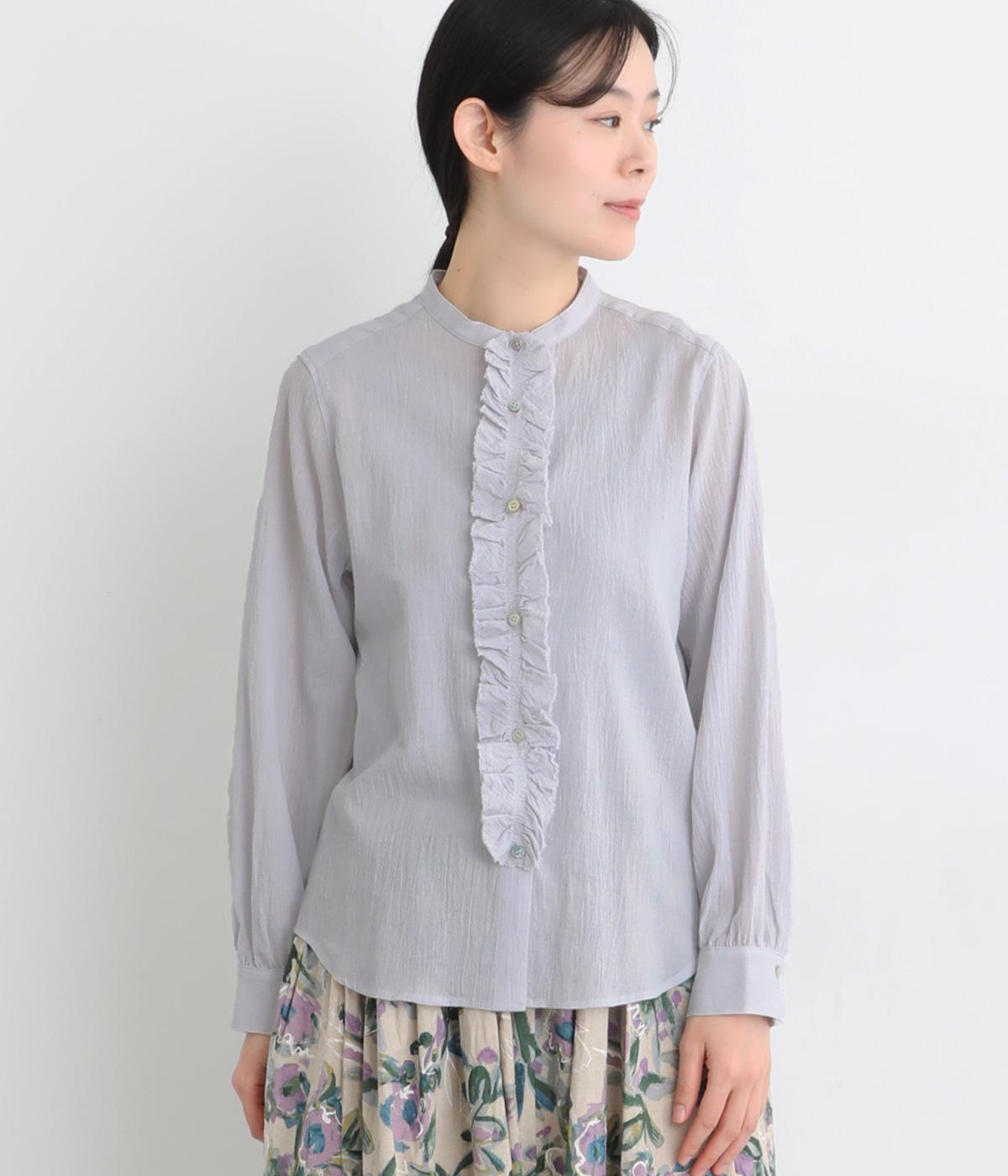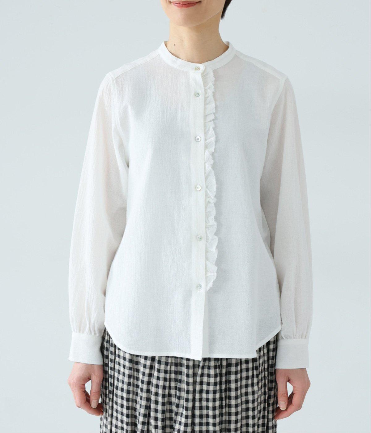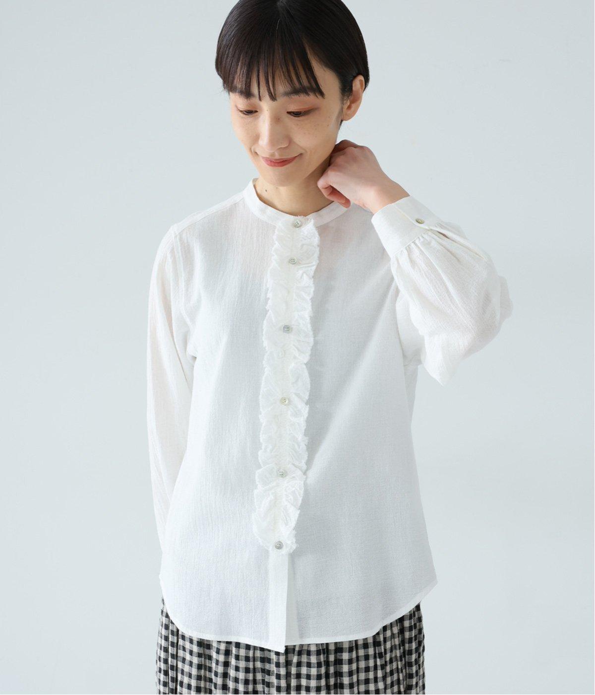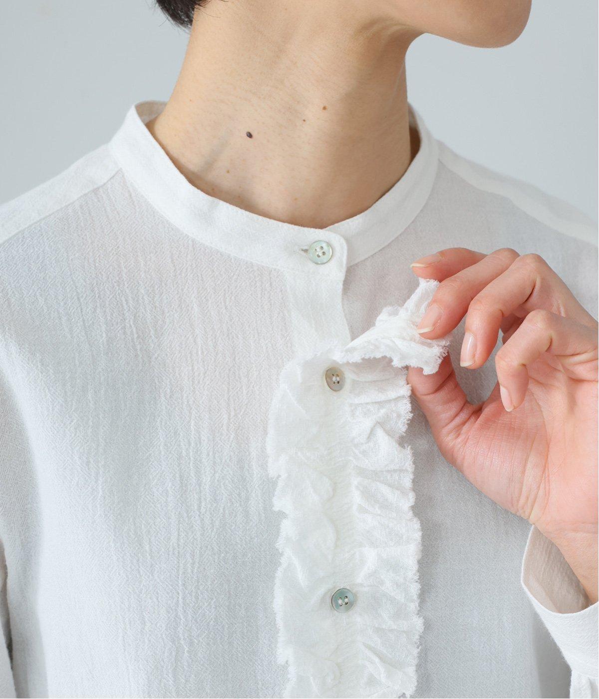 きちんと感ただようバンドカラーシャツのフロントにフリルをあしらって甘さをプラス。フリル部分は取り外し可能で、気分やスタイルに合わせて異なる表情をたのしめます。背中や袖口のギャザー、ラウンドヘムなど細かなディテールにもこだわりました。