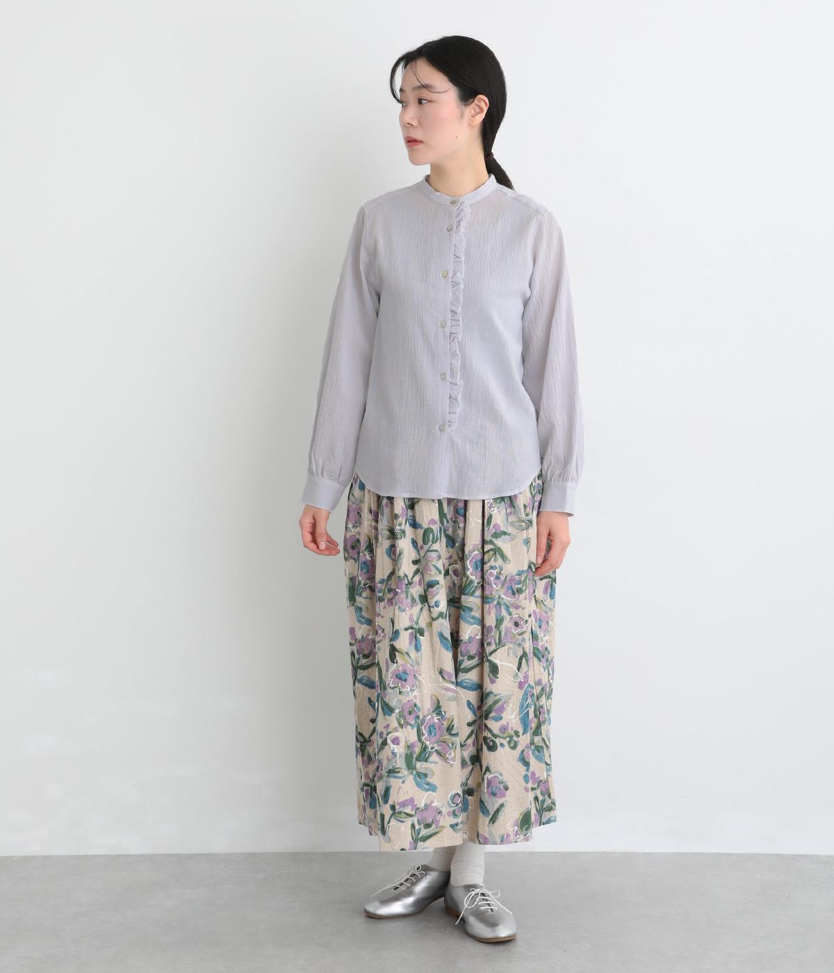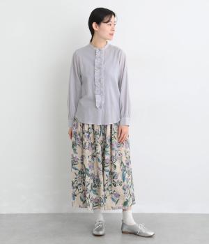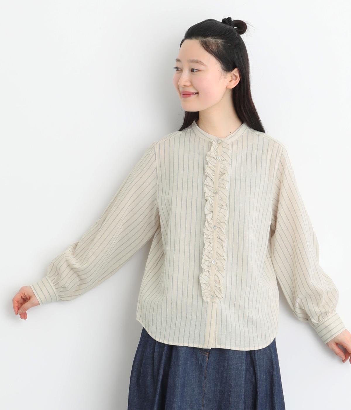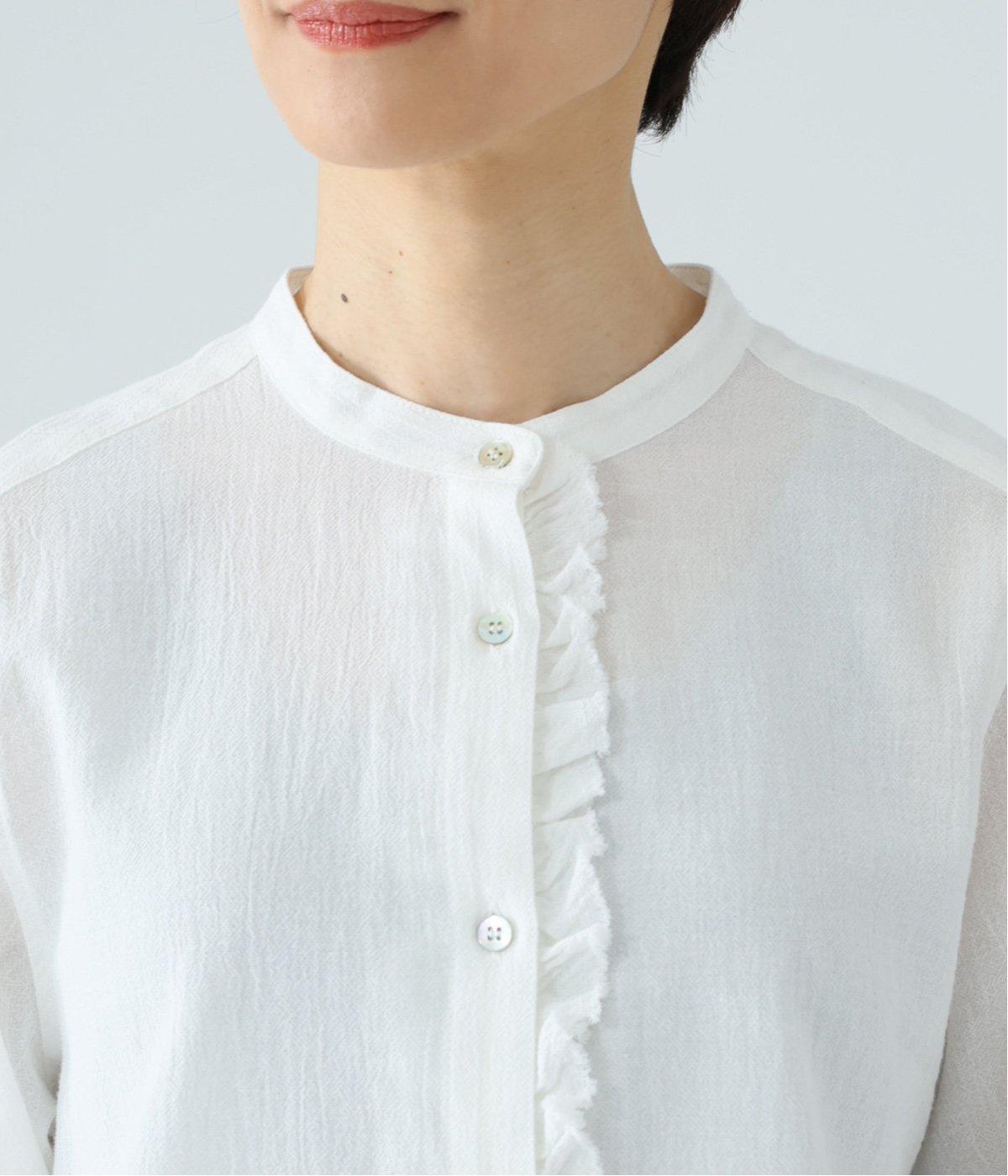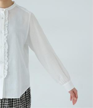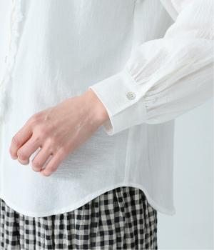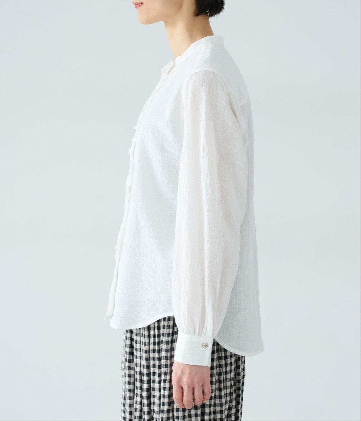 きちんと感ただようバンドカラーシャツのフロントにフリルをあしらって甘さをプラス。フリル部分は取り外し可能で、気分やスタイルに合わせて異なる表情をたのしめます。背中や袖口のギャザー、ラウンドヘムなど細かなディテールにもこだわりました。