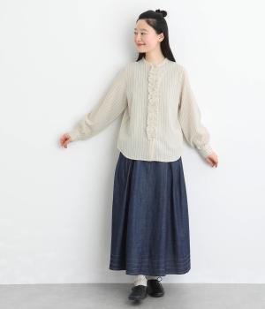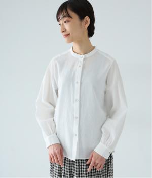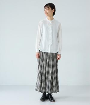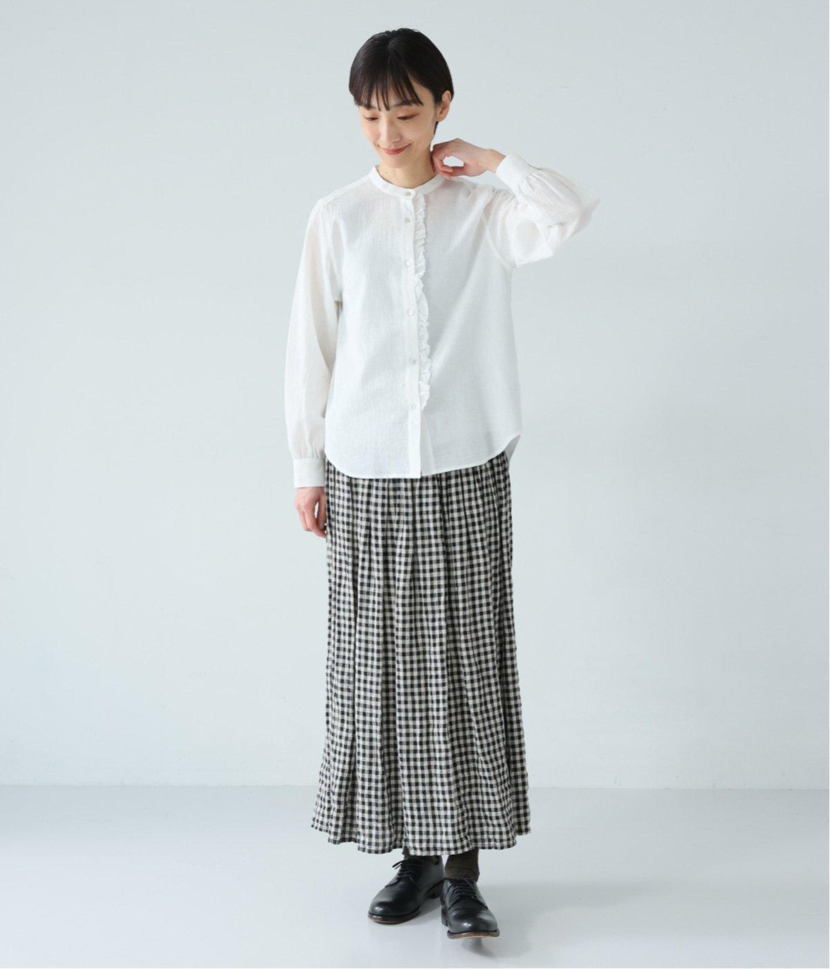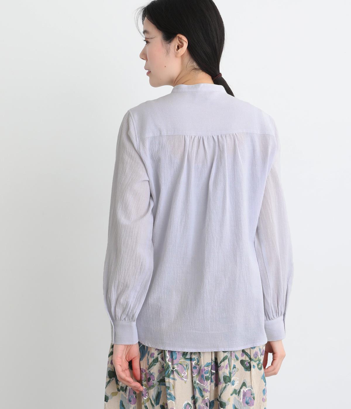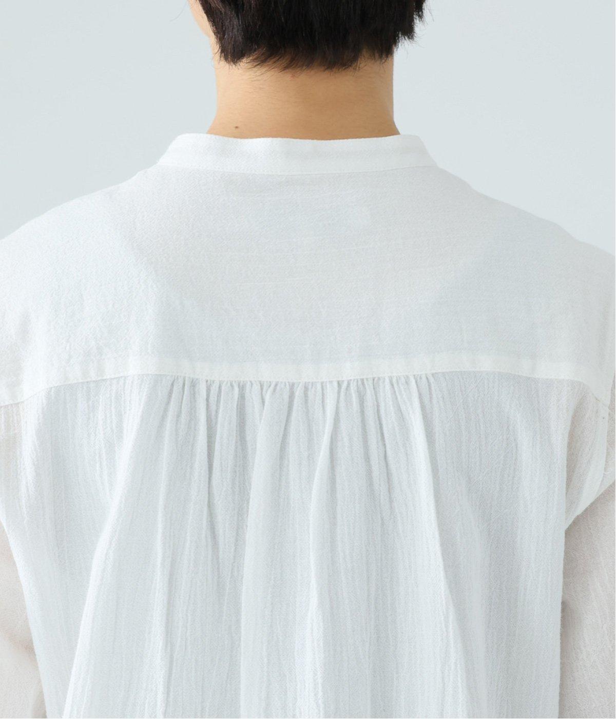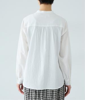 きちんと感ただようバンドカラーシャツのフロントにフリルをあしらって甘さをプラス。フリル部分は取り外し可能で、気分やスタイルに合わせて異なる表情をたのしめます。背中や袖口のギャザー、ラウンドヘムなど細かなディテールにもこだわりました。