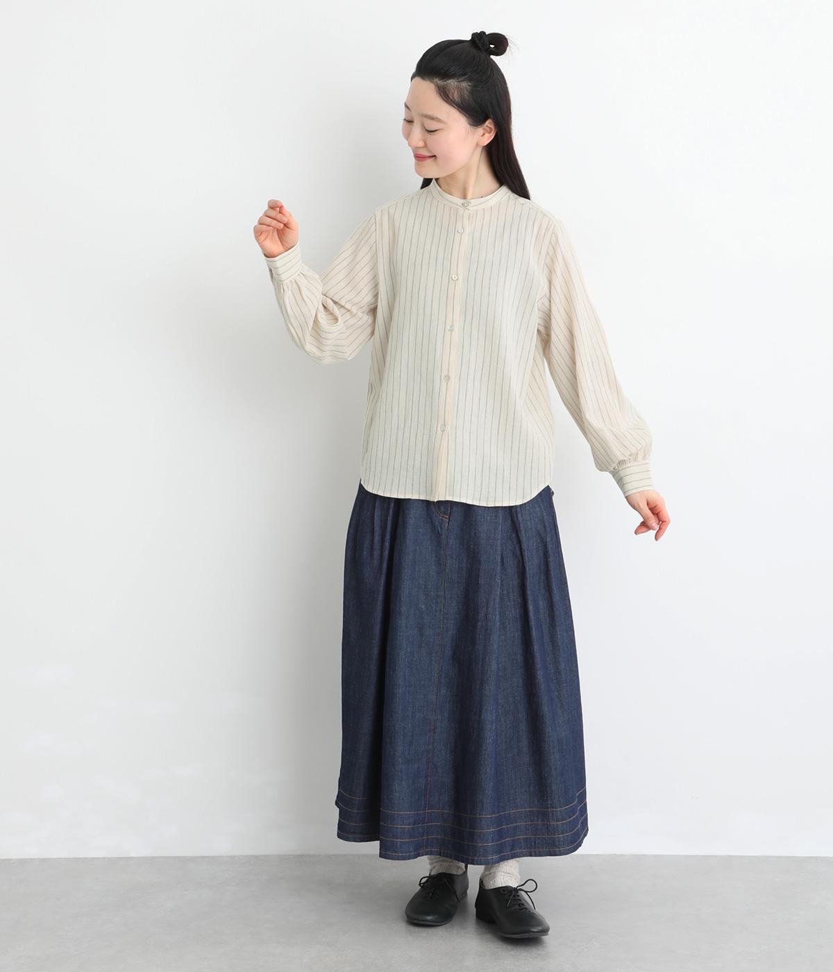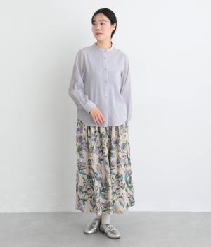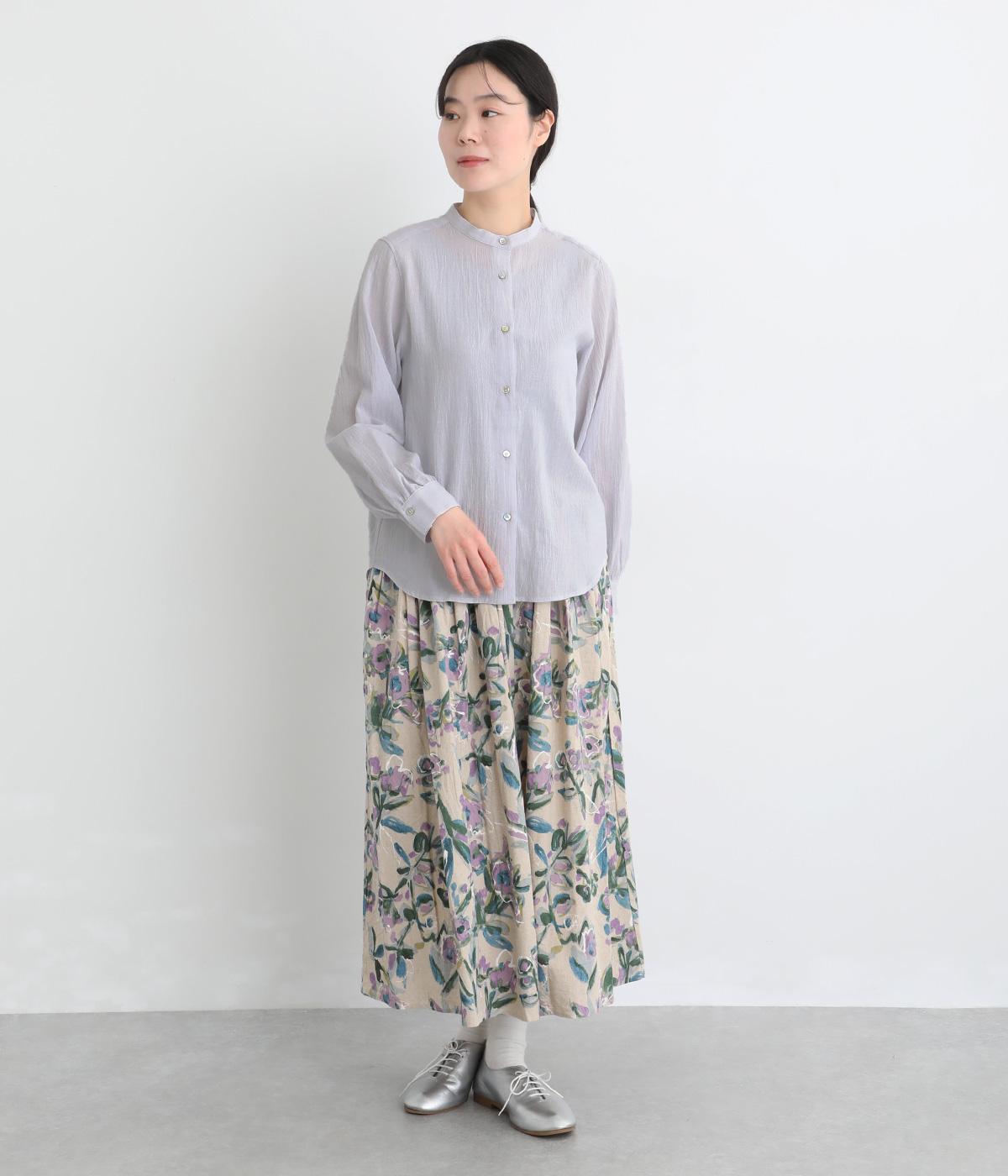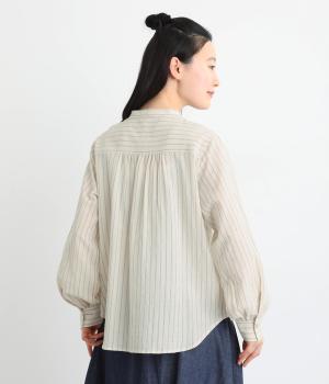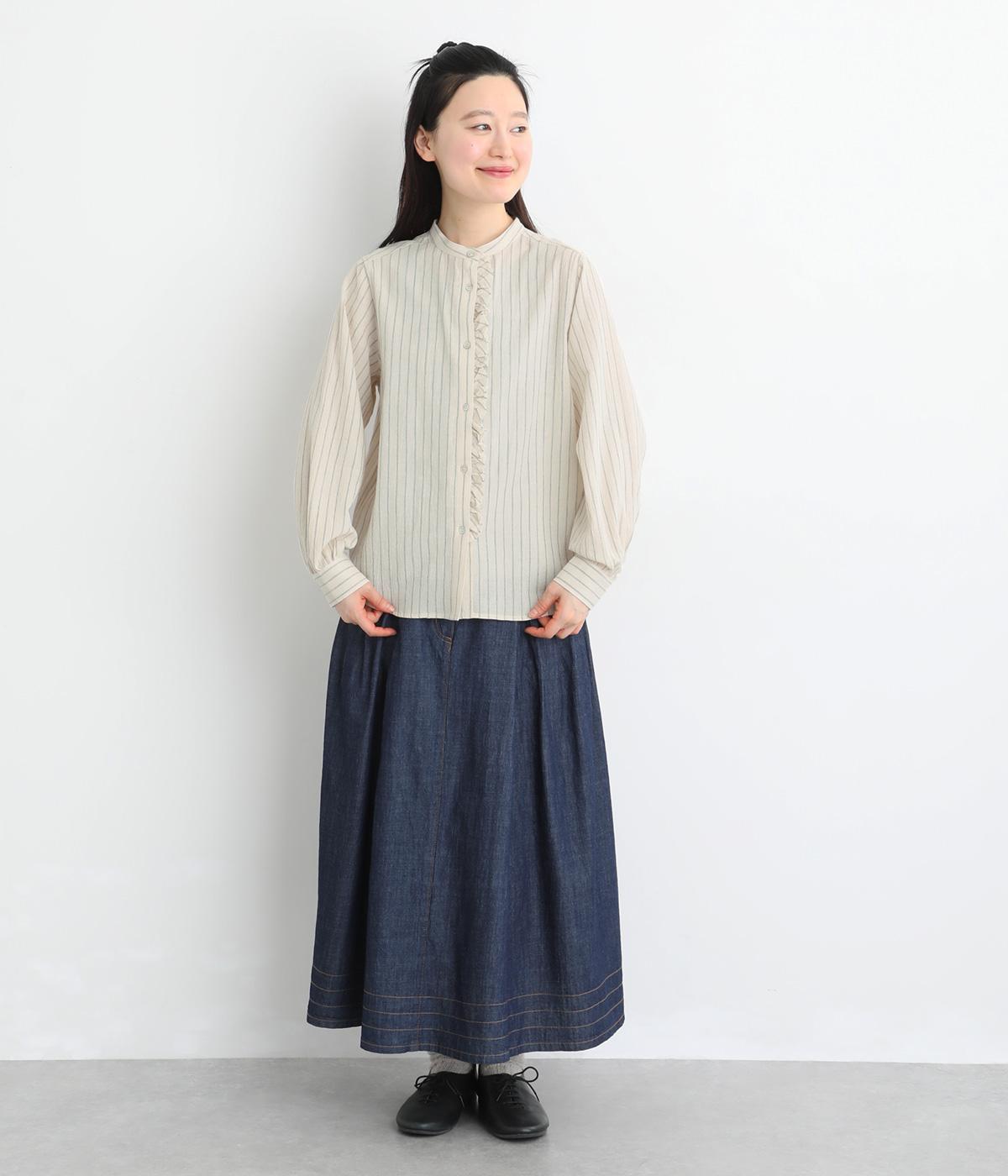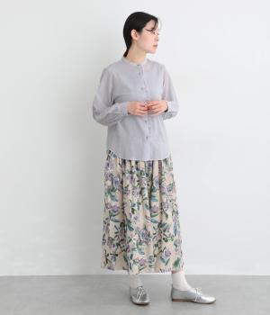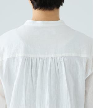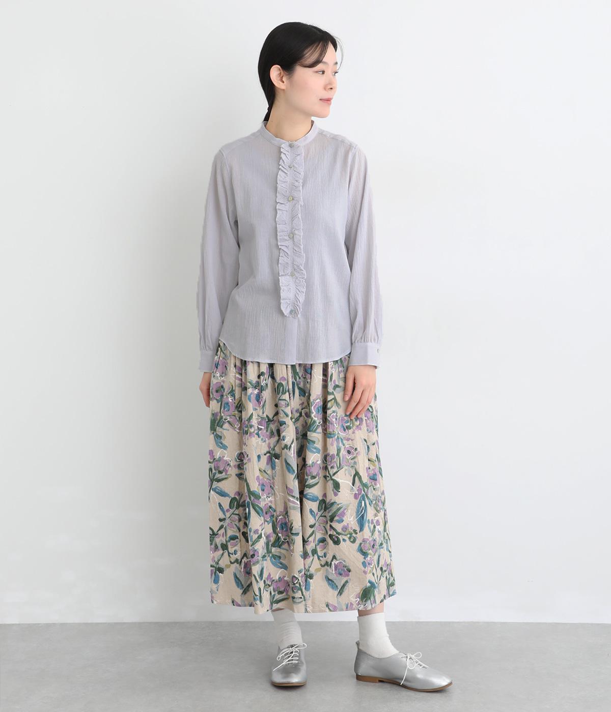 きちんと感ただようバンドカラーシャツのフロントにフリルをあしらって甘さをプラス。フリル部分は取り外し可能で、気分やスタイルに合わせて異なる表情をたのしめます。背中や袖口のギャザー、ラウンドヘムなど細かなディテールにもこだわりました。