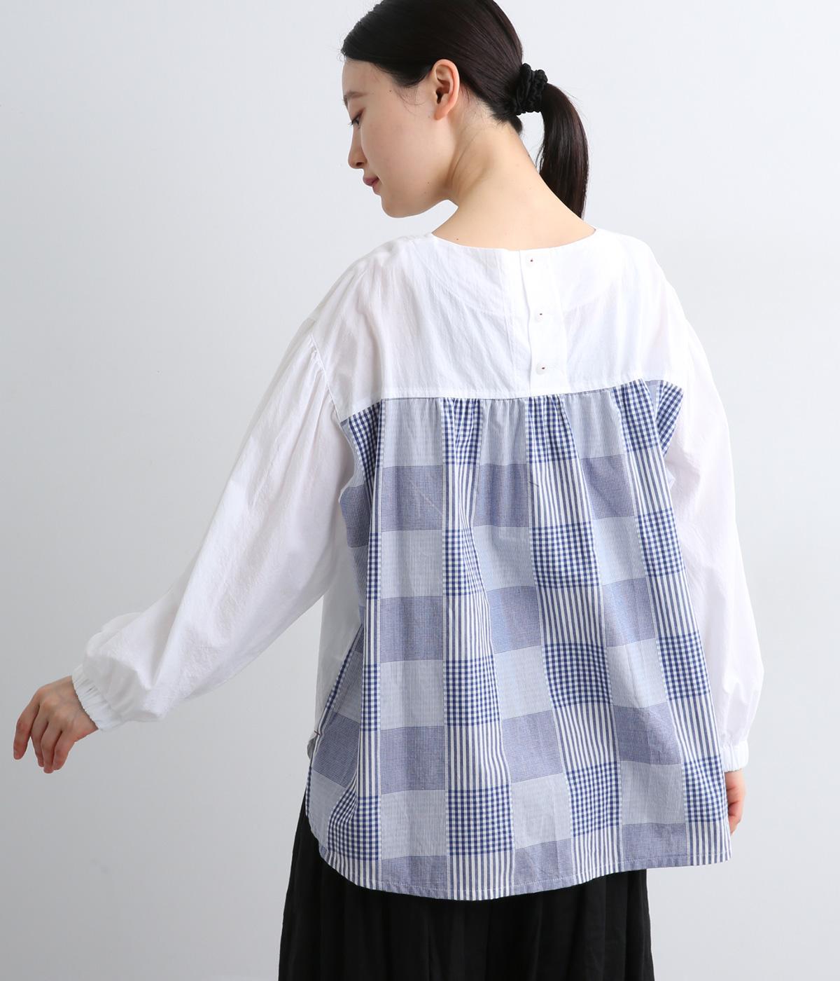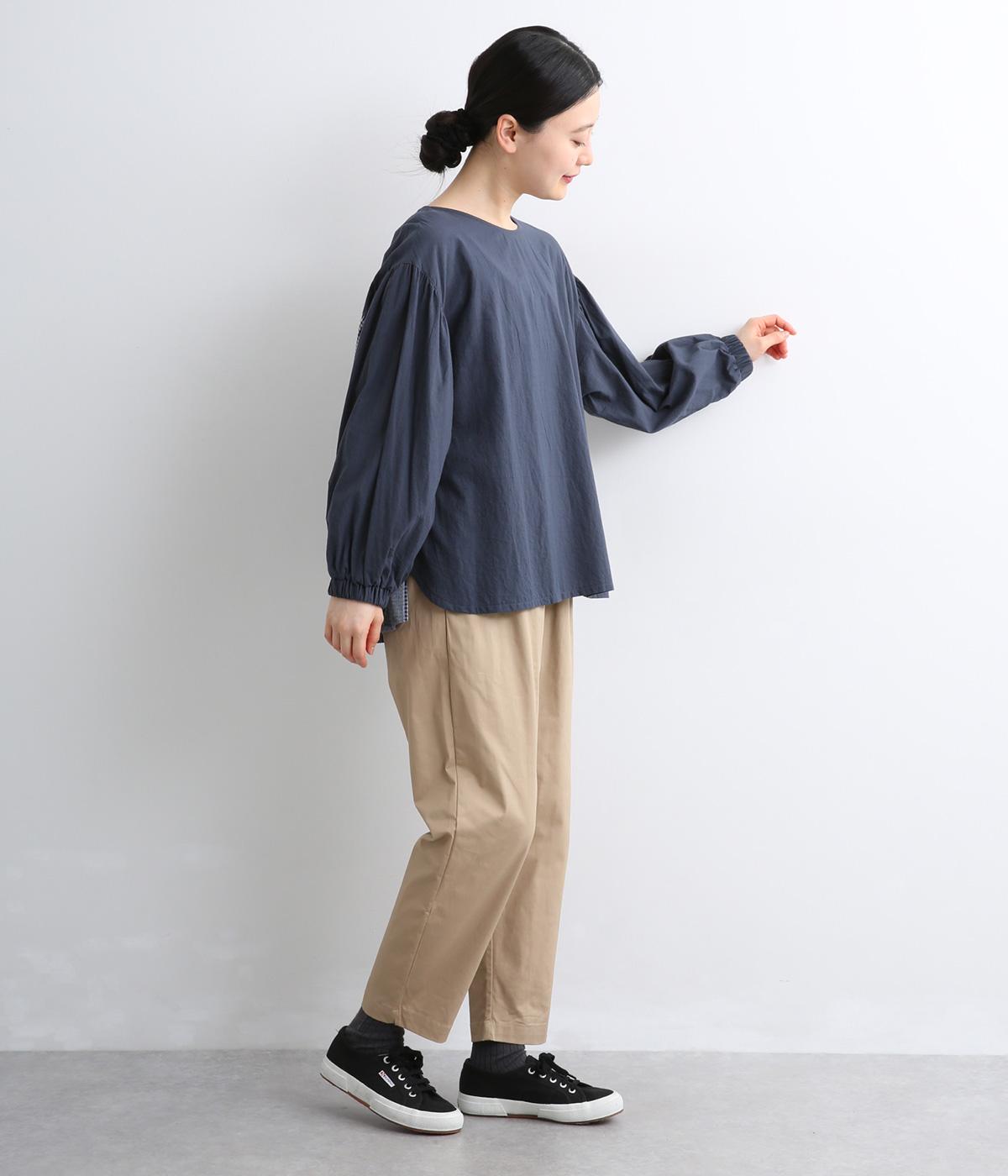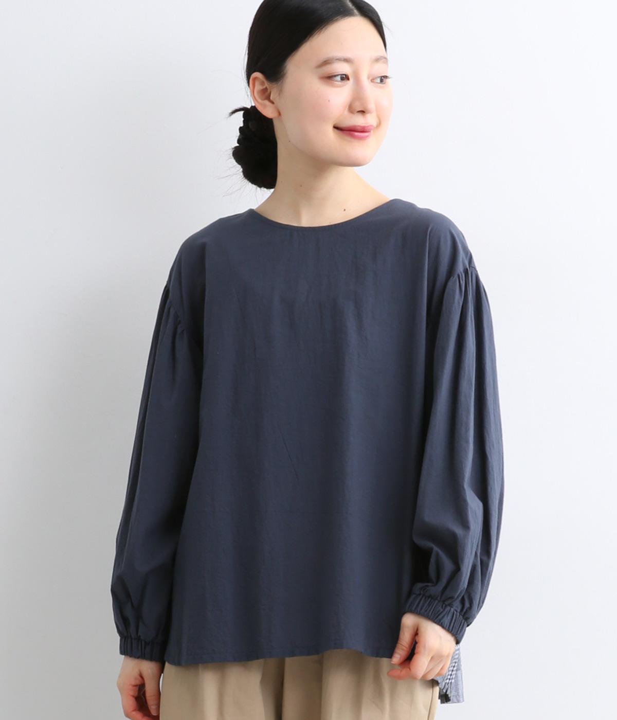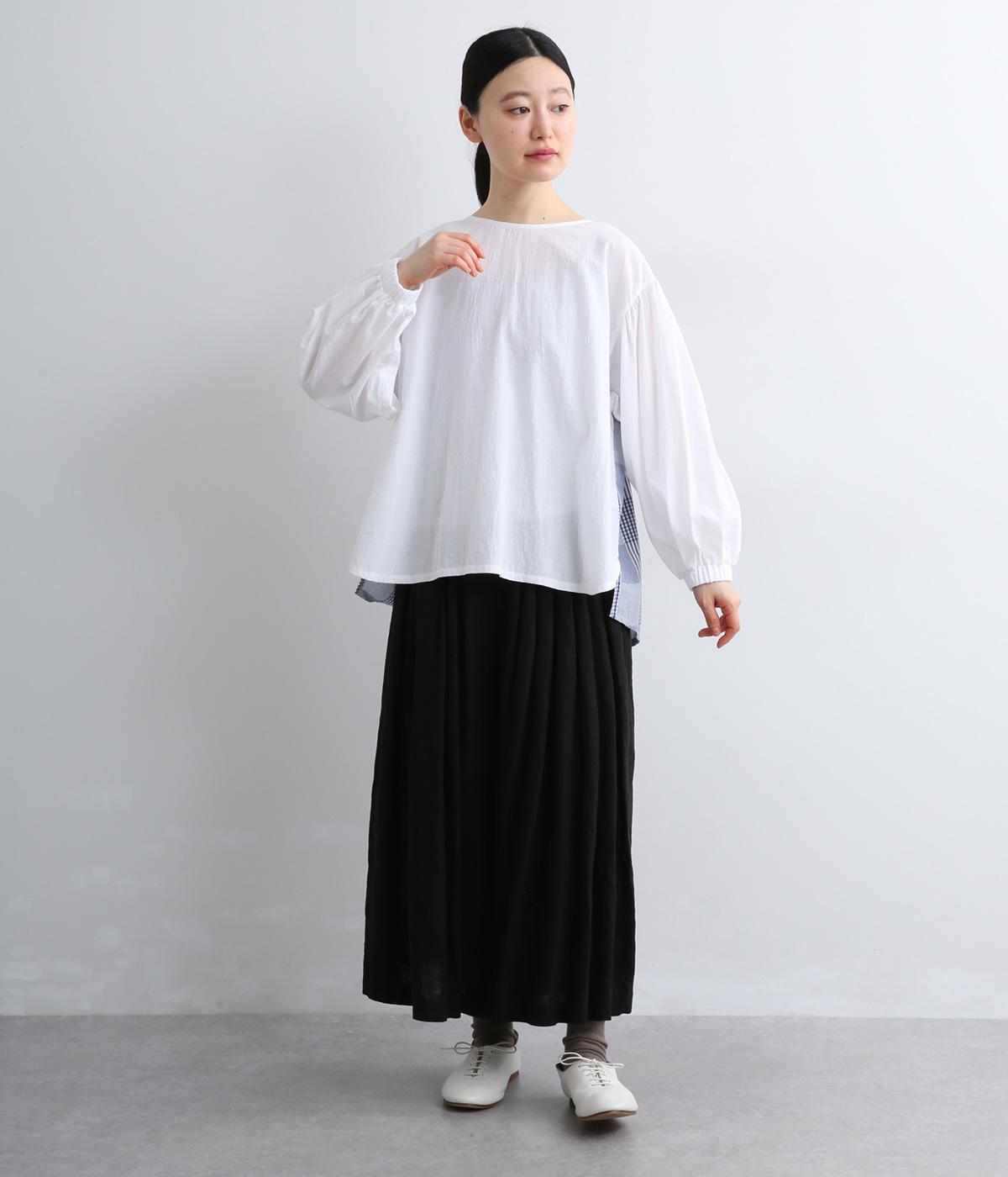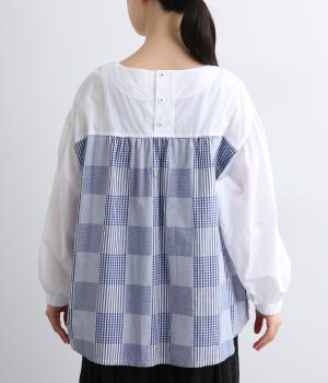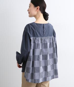 前はすっきりシンプルに、後ろはチェック切り替えやボタンあき、ギャザーのフレア感でキャッチーに仕立てました。全体的にゆったりとしているので着心地よく、袖口ゴムでたくし上げのアレンジもたのしめます。軽やかに揺れる生地感が優雅な印象に。