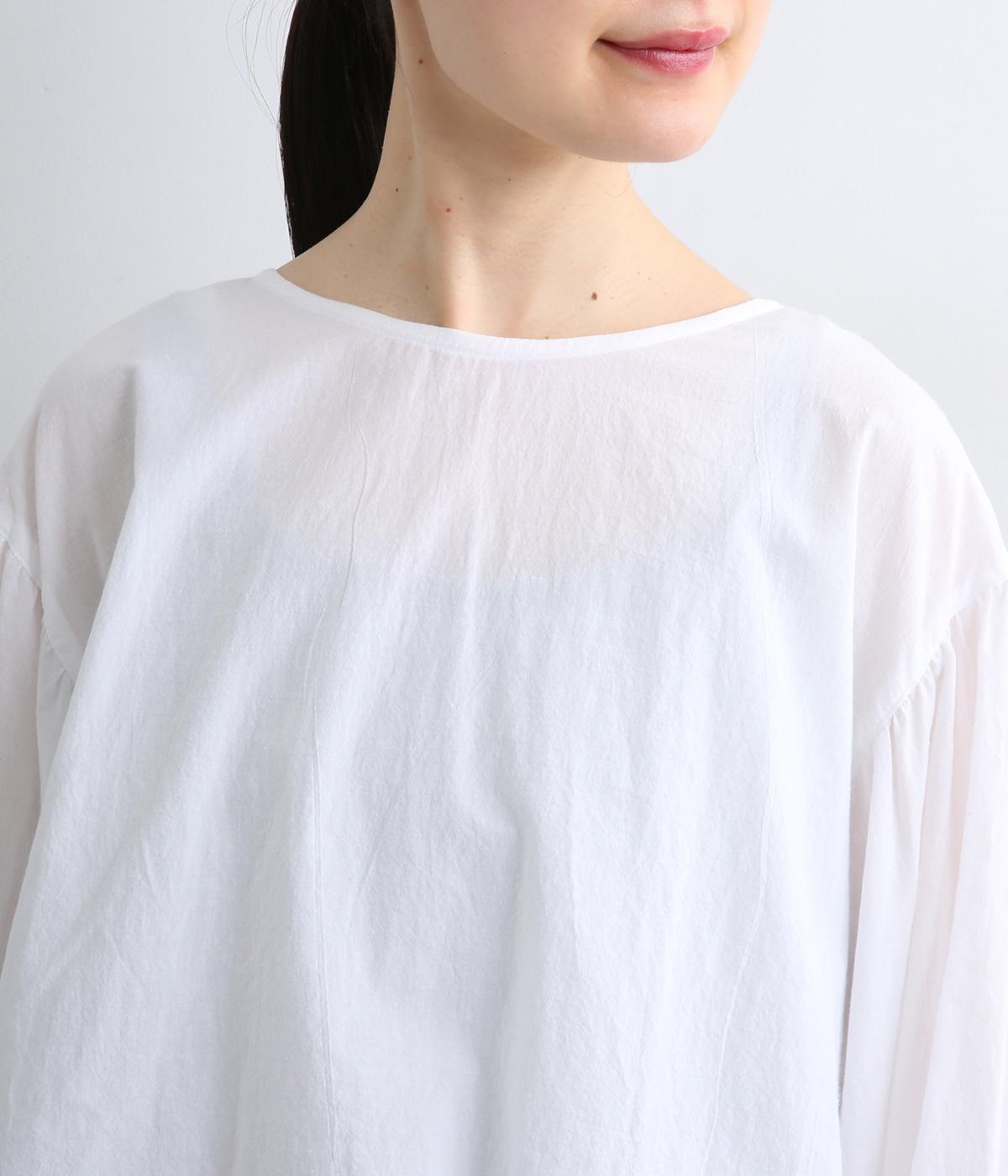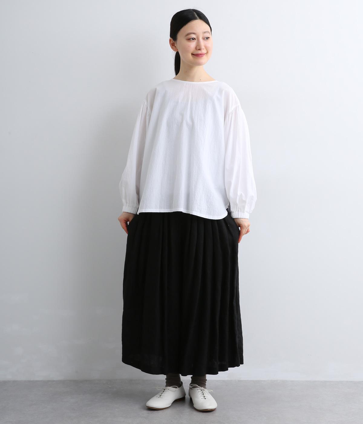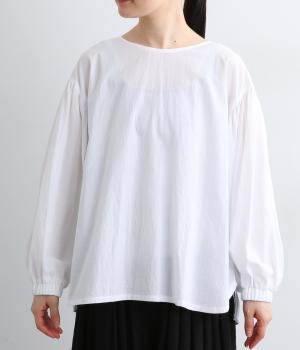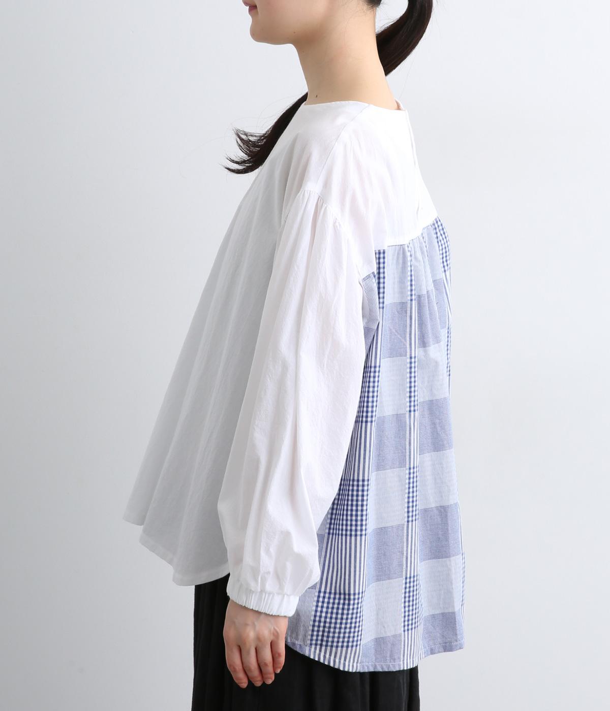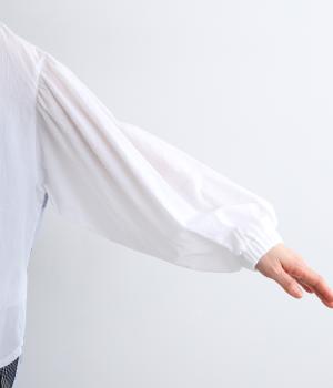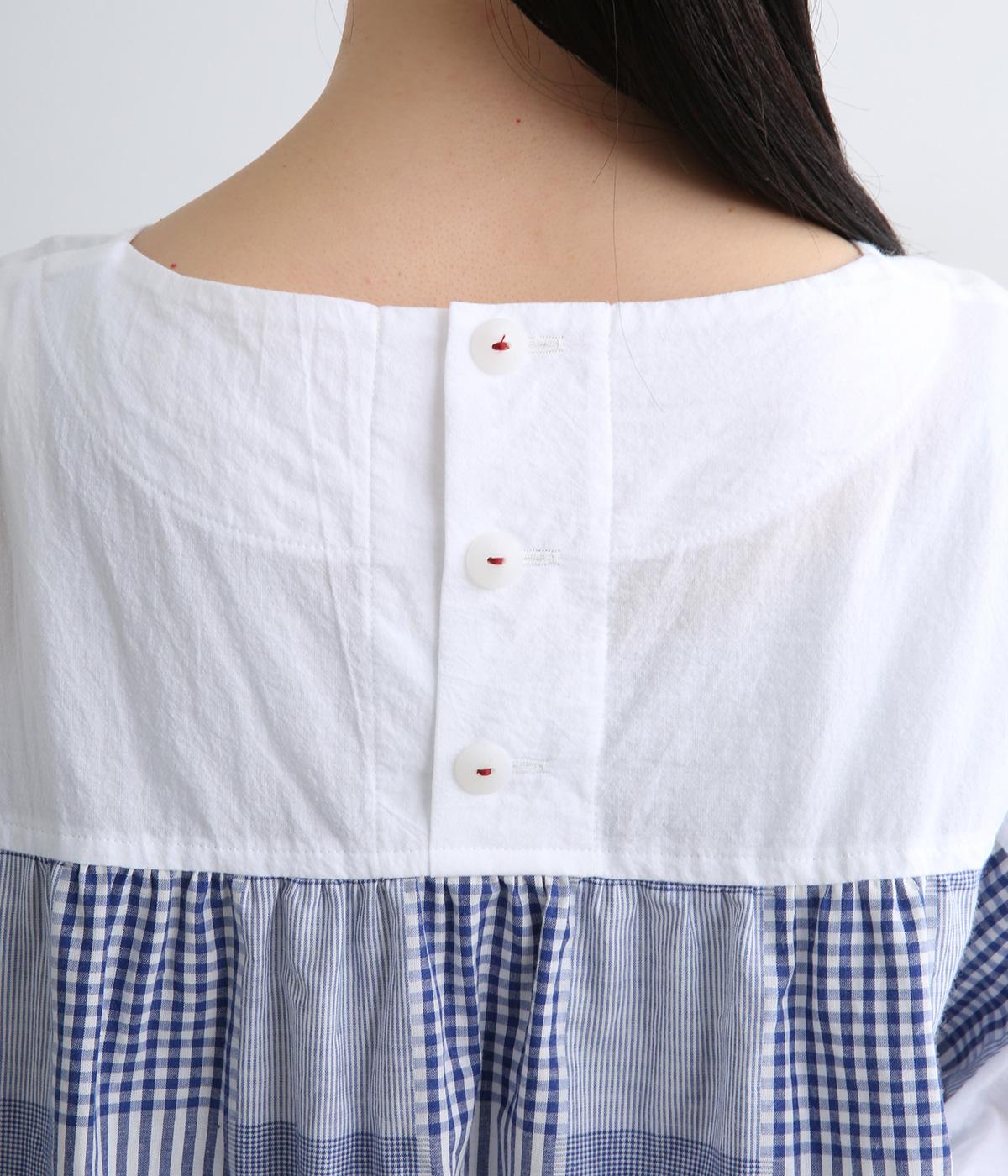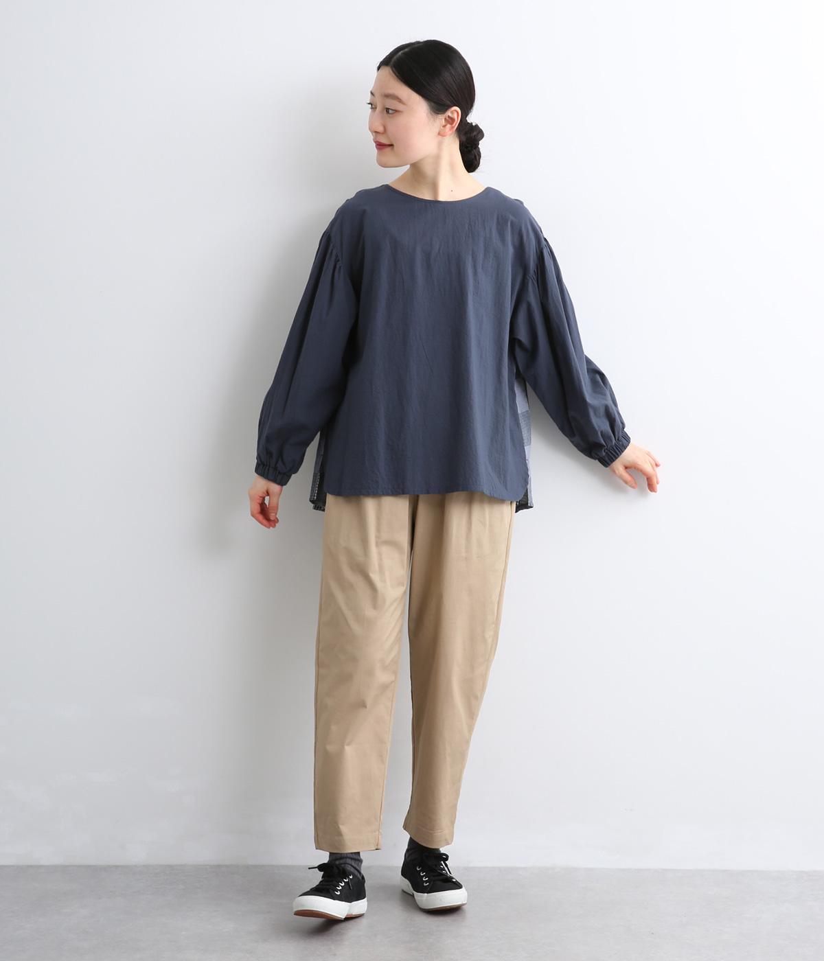 前はすっきりシンプルに、後ろはチェック切り替えやボタンあき、ギャザーのフレア感でキャッチーに仕立てました。全体的にゆったりとしているので着心地よく、袖口ゴムでたくし上げのアレンジもたのしめます。軽やかに揺れる生地感が優雅な印象に。