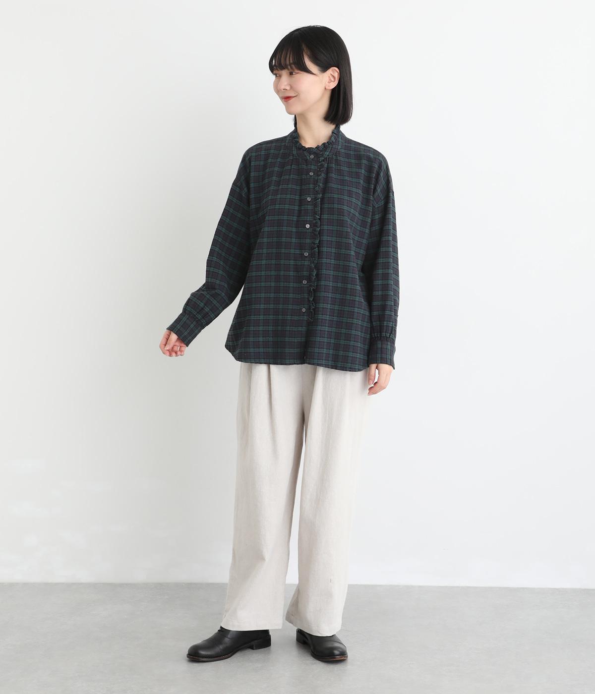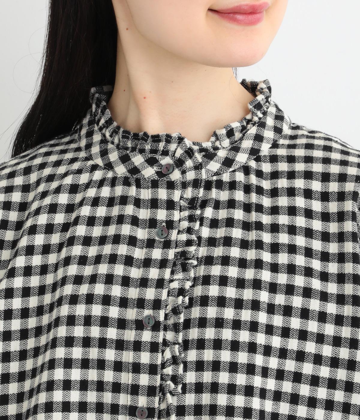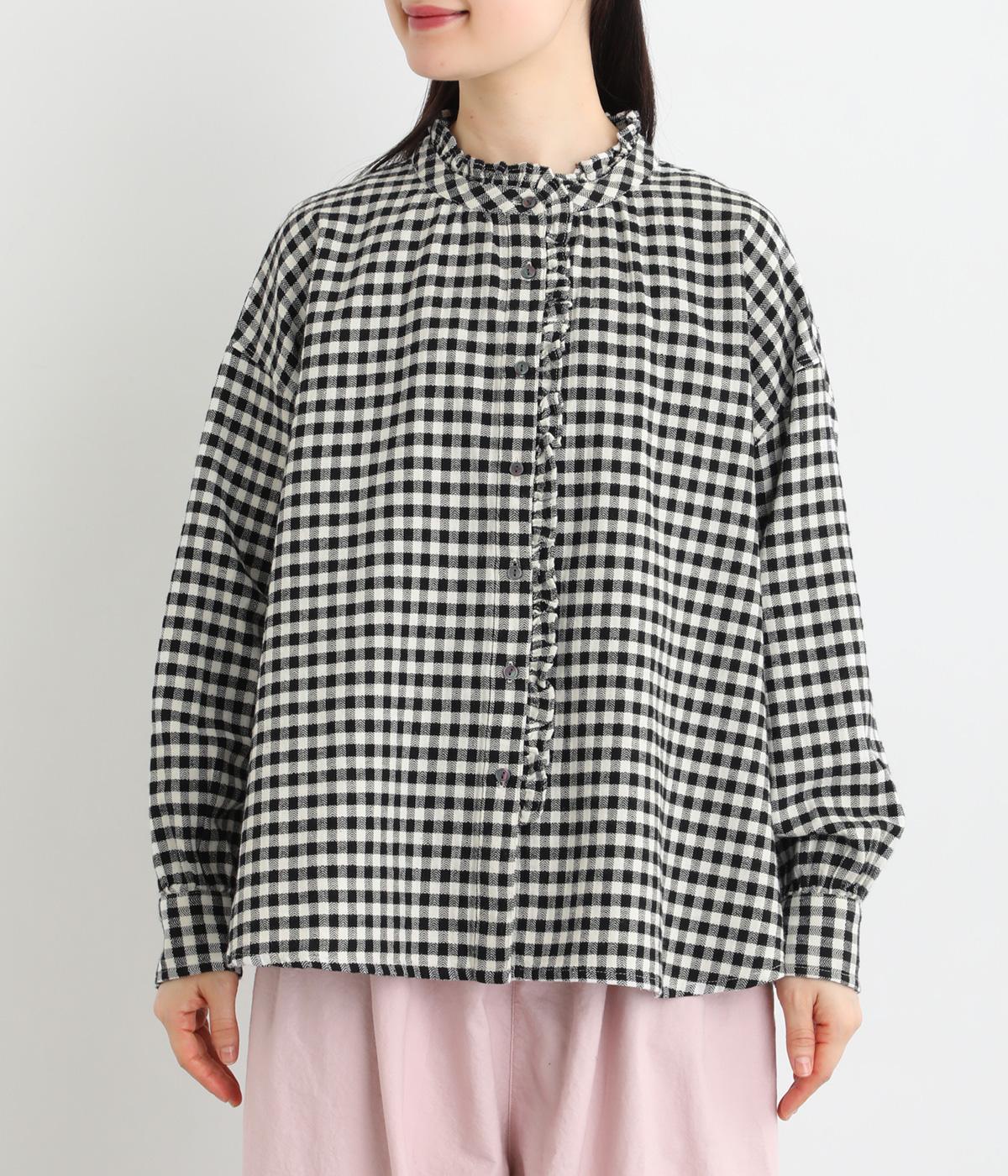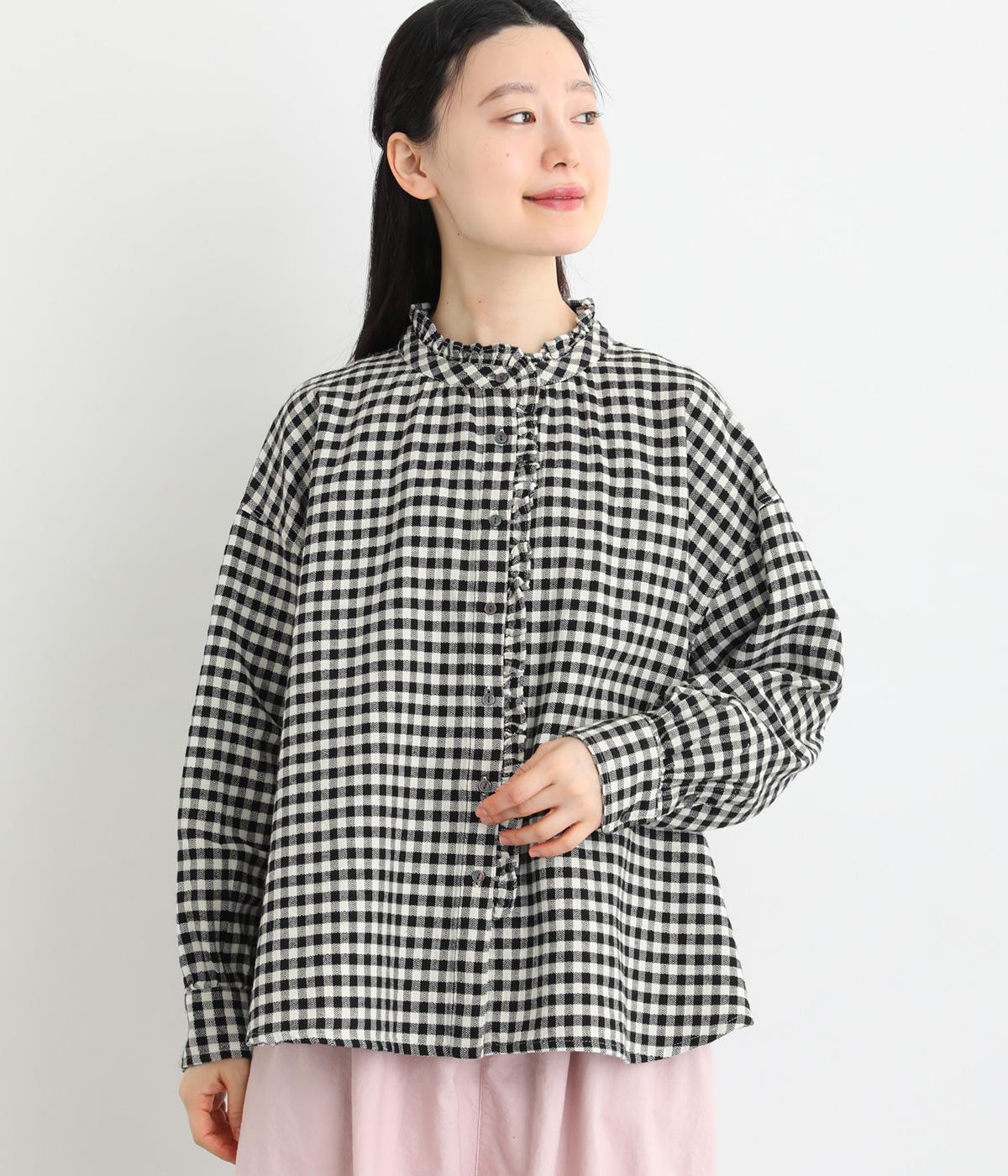 ヘリンボーン織りが、奥行きと上品な存在感を演出するブラウスです。ゆったりとした身幅に、襟元と前たてにあしらったフリルが、やわらかなアクセントを添えます。甘さをほどよくおさえたデザインで、そのままで着るのはもちろん、前をあけて羽織り風の着こなしもおすすめです。