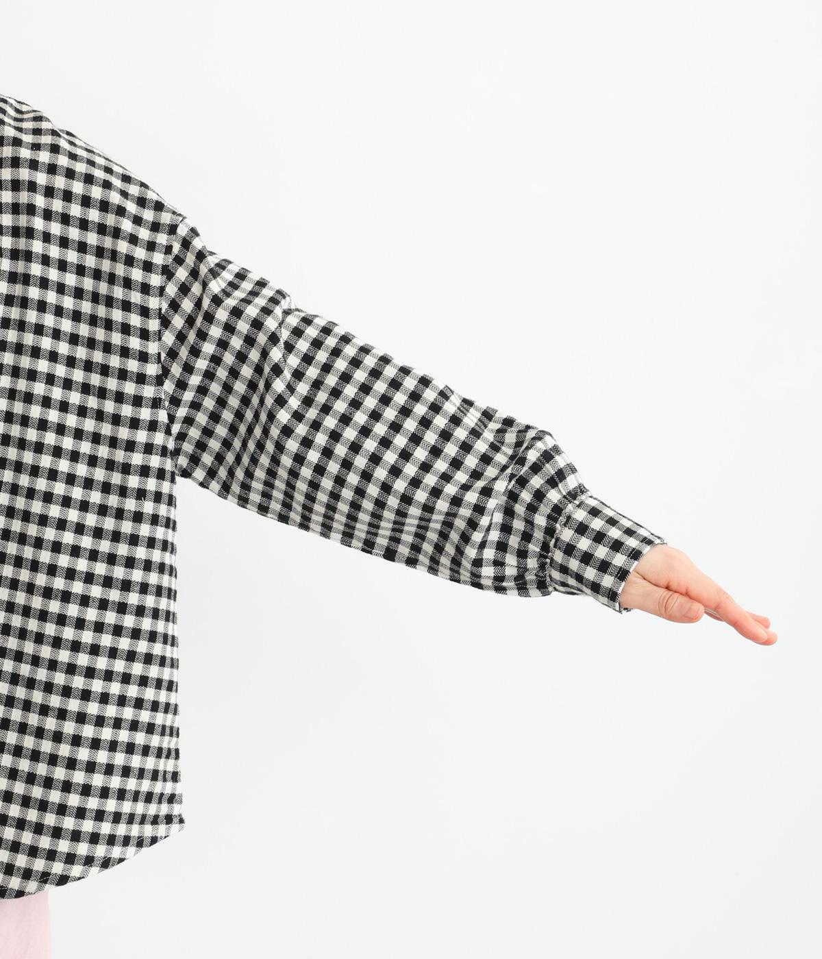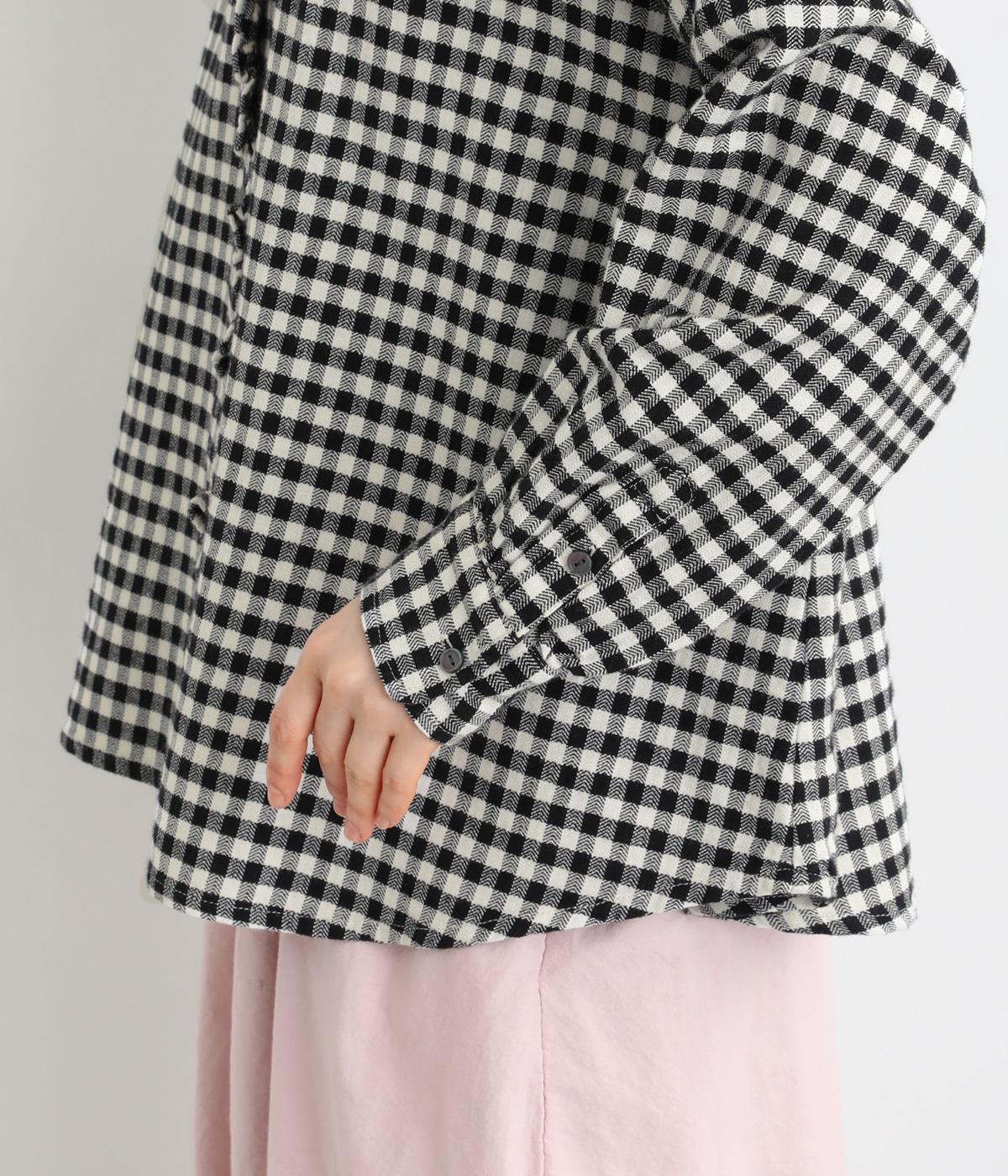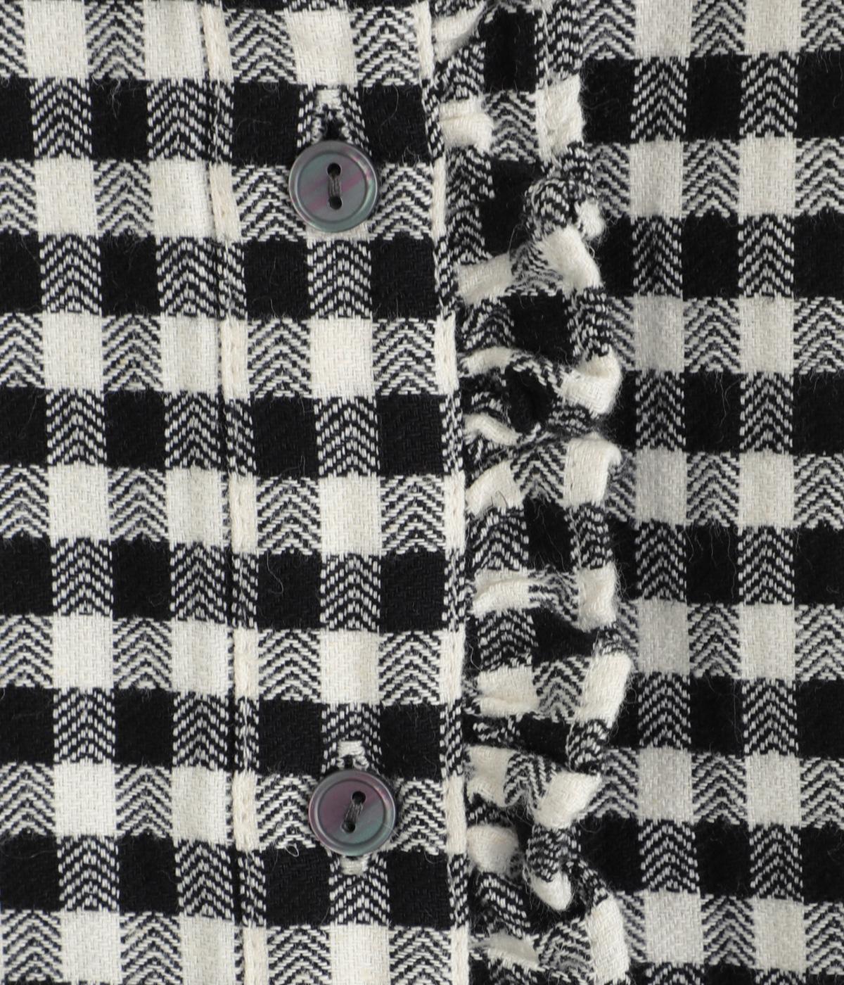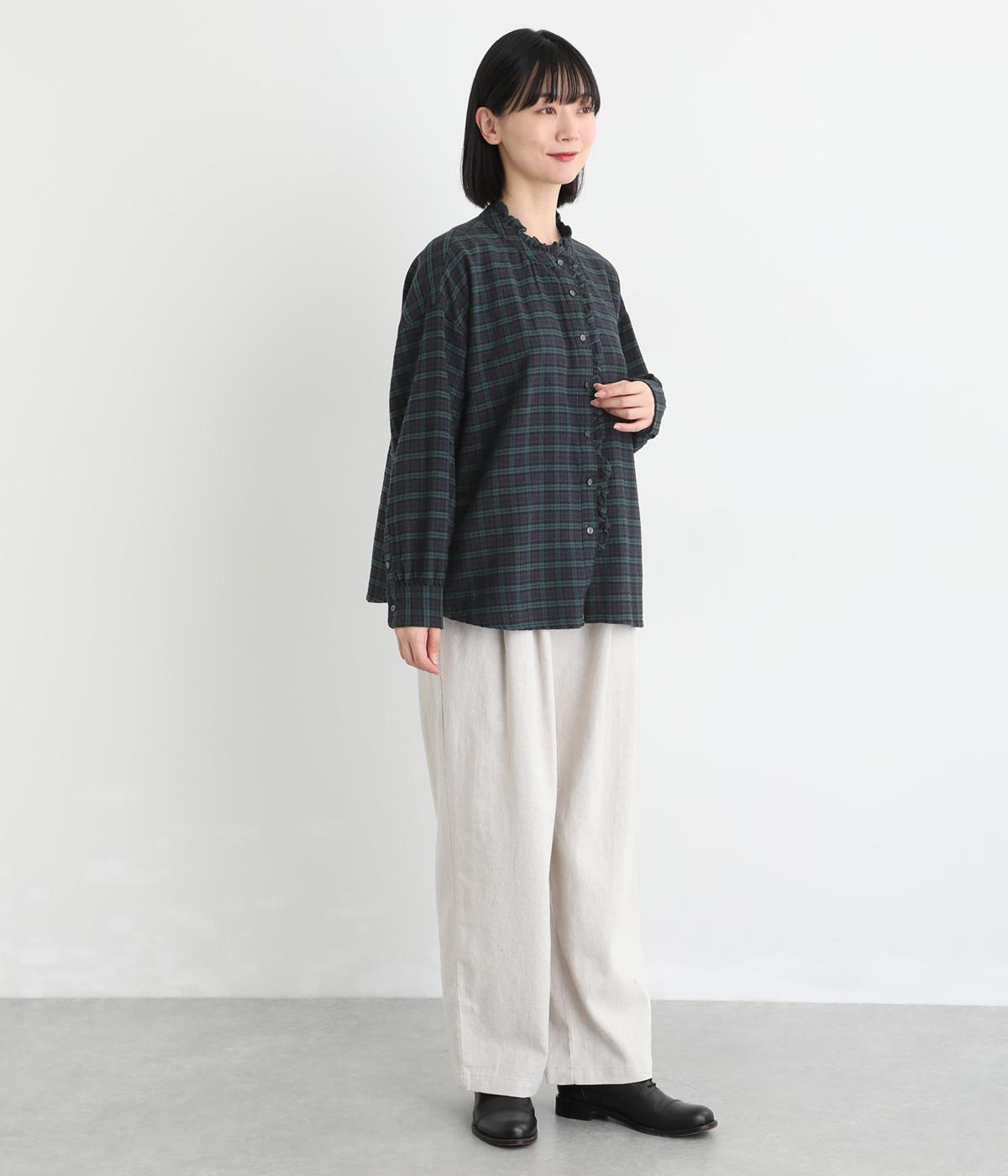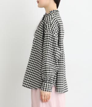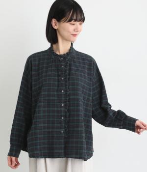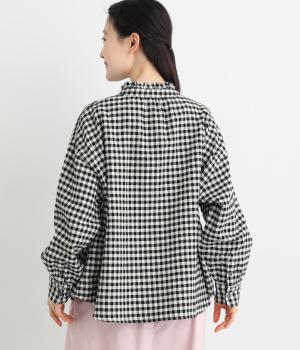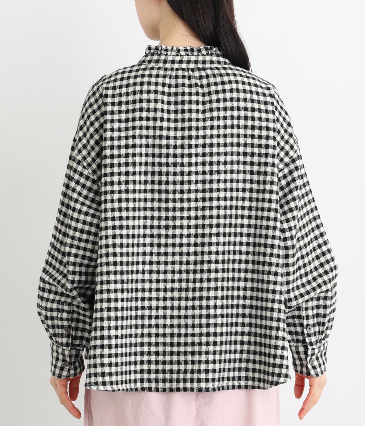 ヘリンボーン織りが、奥行きと上品な存在感を演出するブラウスです。ゆったりとした身幅に、襟元と前たてにあしらったフリルが、やわらかなアクセントを添えます。甘さをほどよくおさえたデザインで、そのままで着るのはもちろん、前をあけて羽織り風の着こなしもおすすめです。