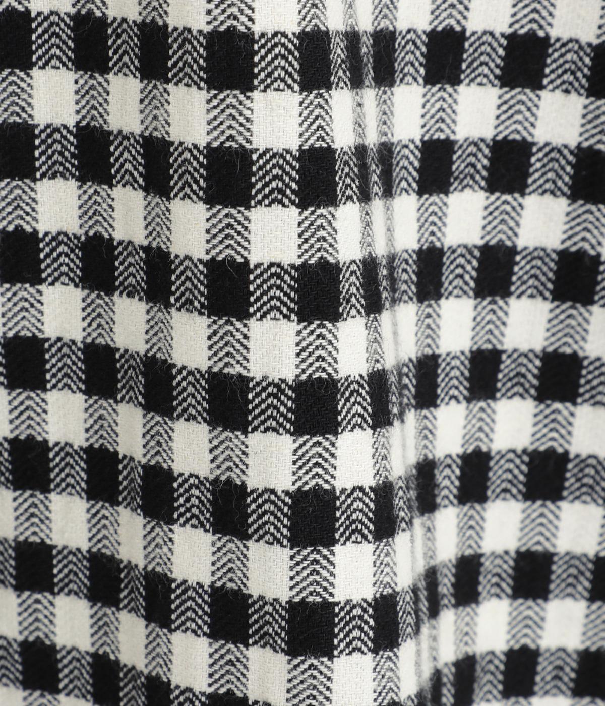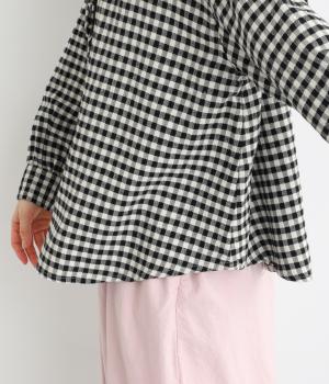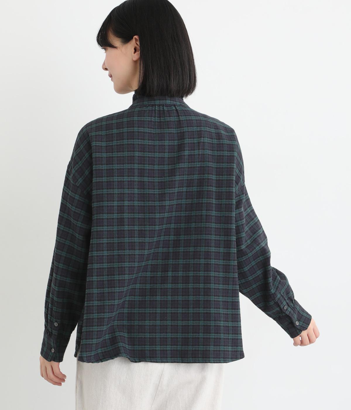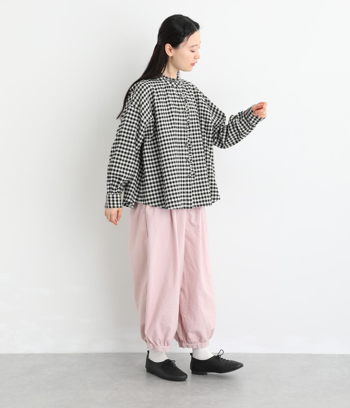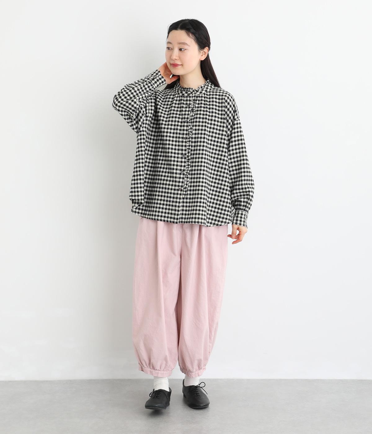 ヘリンボーン織りが、奥行きと上品な存在感を演出するブラウスです。ゆったりとした身幅に、襟元と前たてにあしらったフリルが、やわらかなアクセントを添えます。甘さをほどよくおさえたデザインで、そのままで着るのはもちろん、前をあけて羽織り風の着こなしもおすすめです。