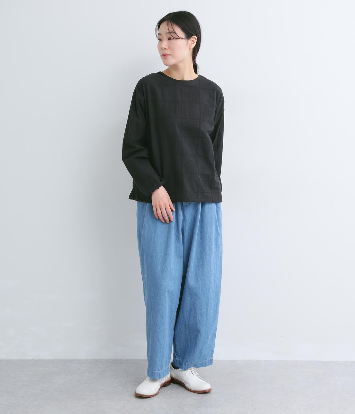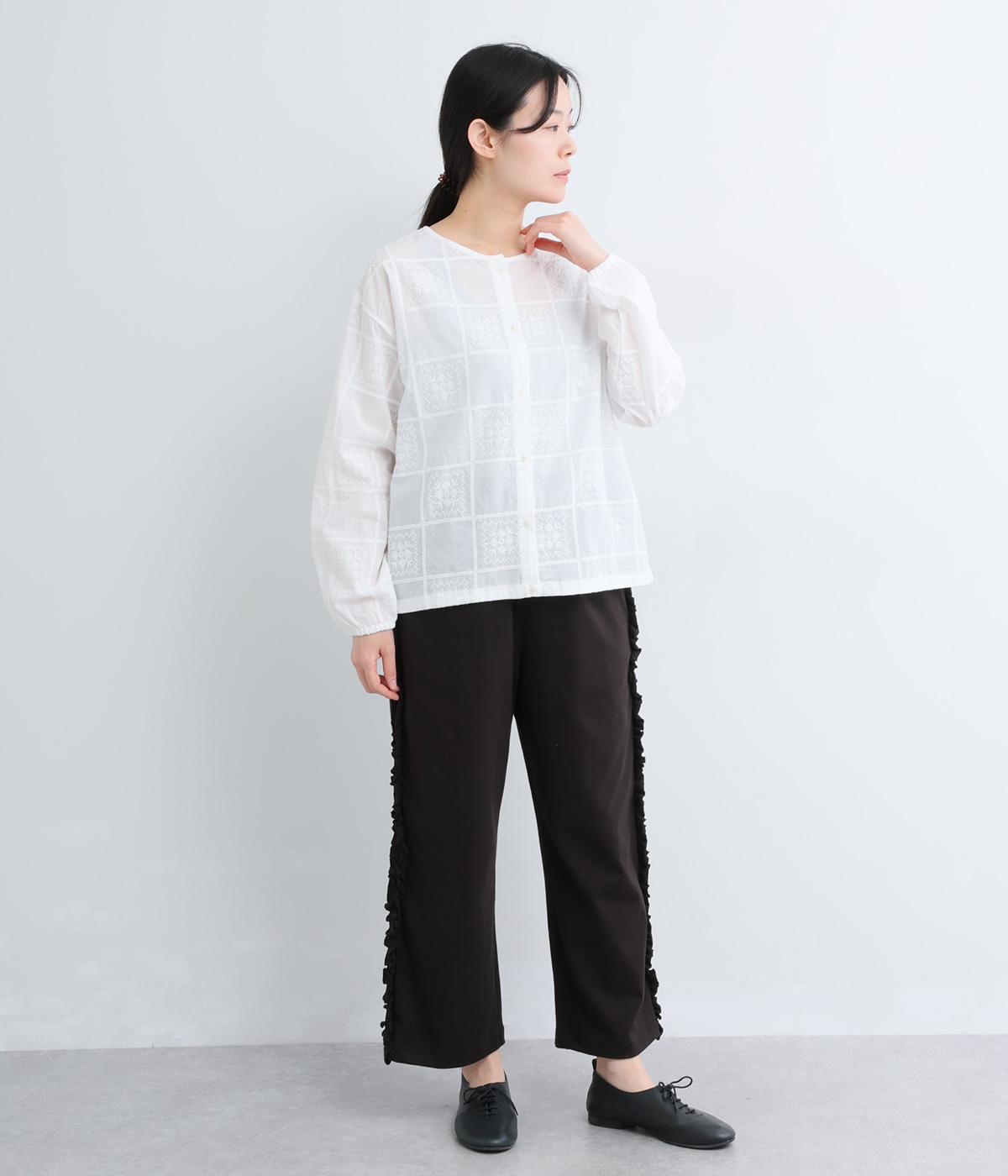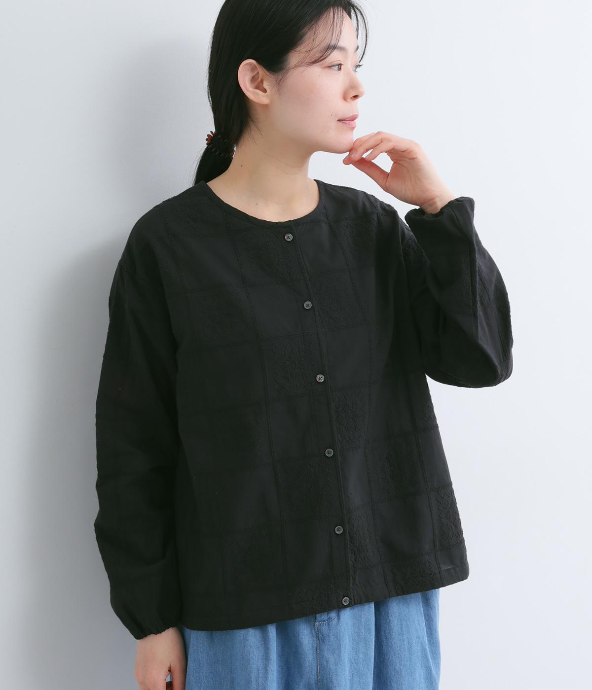 レースのようにクロスステッチをほどこしてロマンティックな雰囲気に仕上げた一枚。シンプルなボックスシルエットで、プルオーバーにも前あきにもなる前後2way仕様。袖口はゴムが入っているのでたくし上げるのもおすすめ。