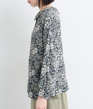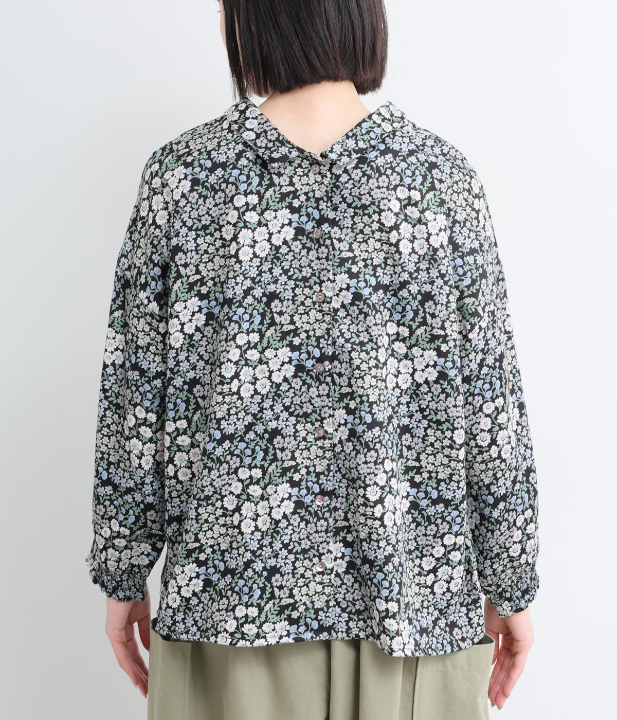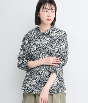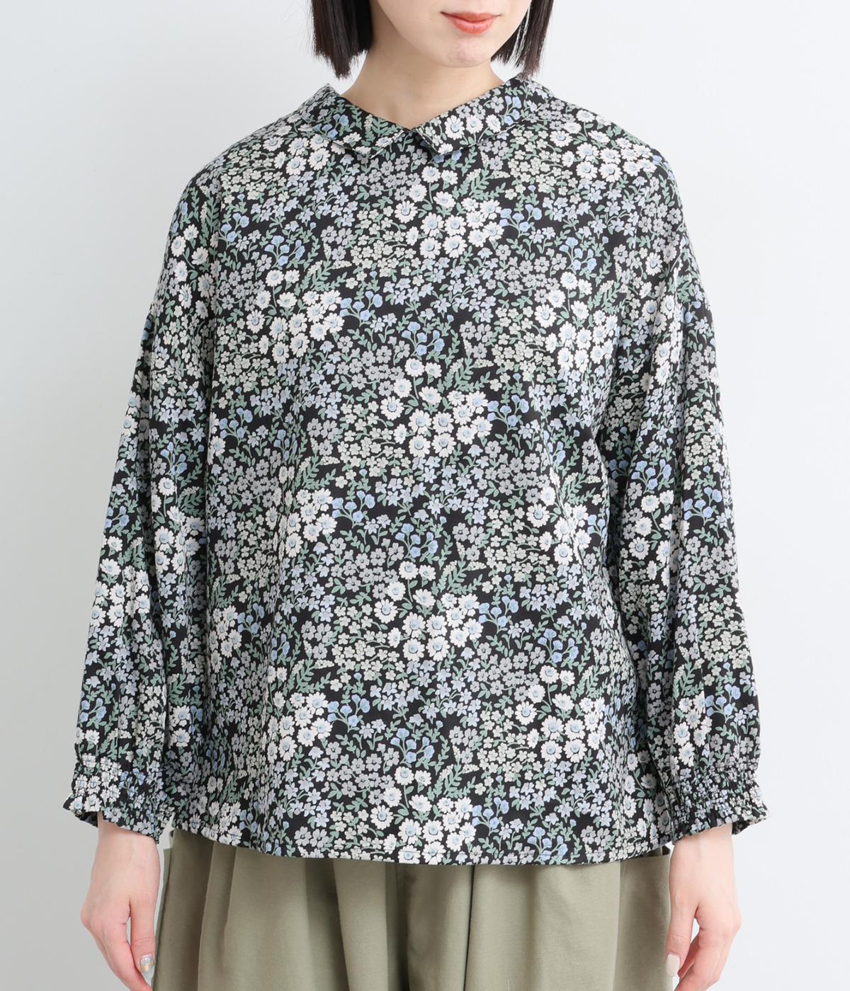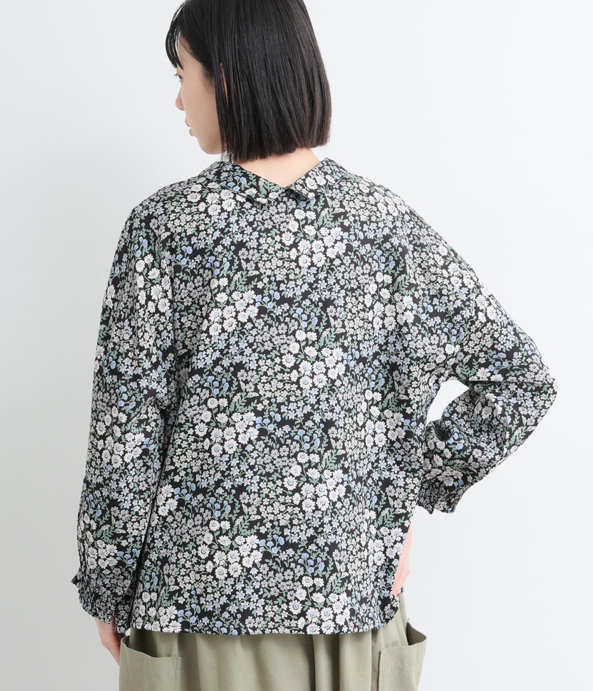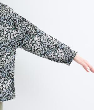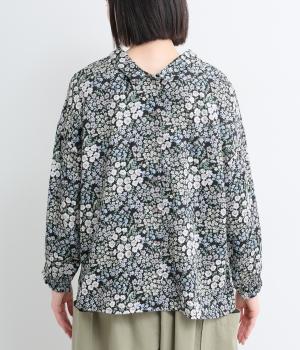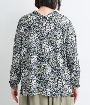 さまざまな草花を散りばめた華やかなプリントブラウス。前後どちらでも着られる2way仕様で、その日の気分やコーディネートに合わせて表情を変えられます。派手すぎないシックな雰囲気で、装いにさりげない彩りを添えます。