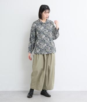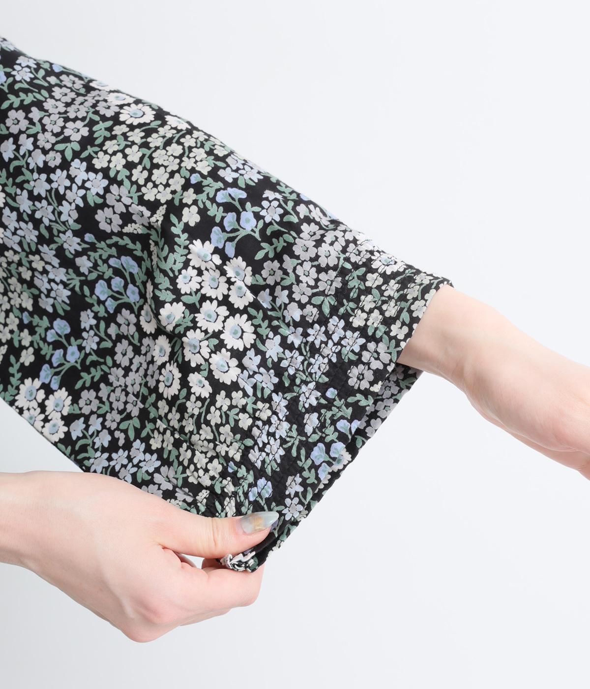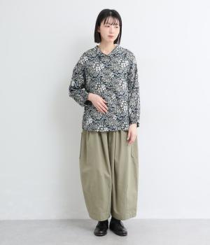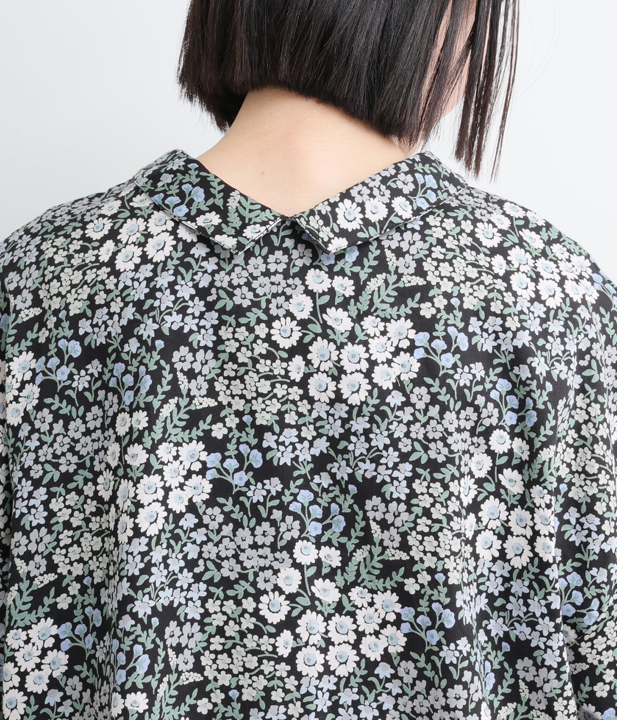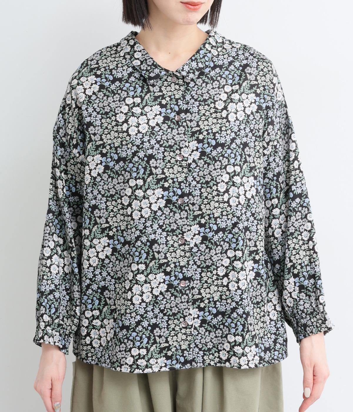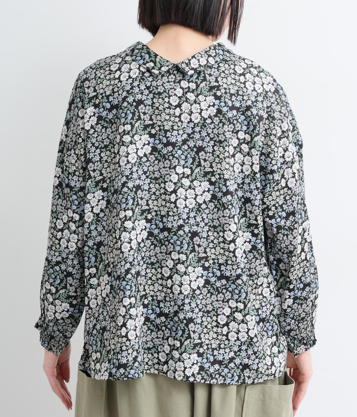 さまざまな草花を散りばめた華やかなプリントブラウス。前後どちらでも着られる2way仕様で、その日の気分やコーディネートに合わせて表情を変えられます。派手すぎないシックな雰囲気で、装いにさりげない彩りを添えます。