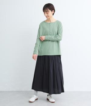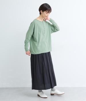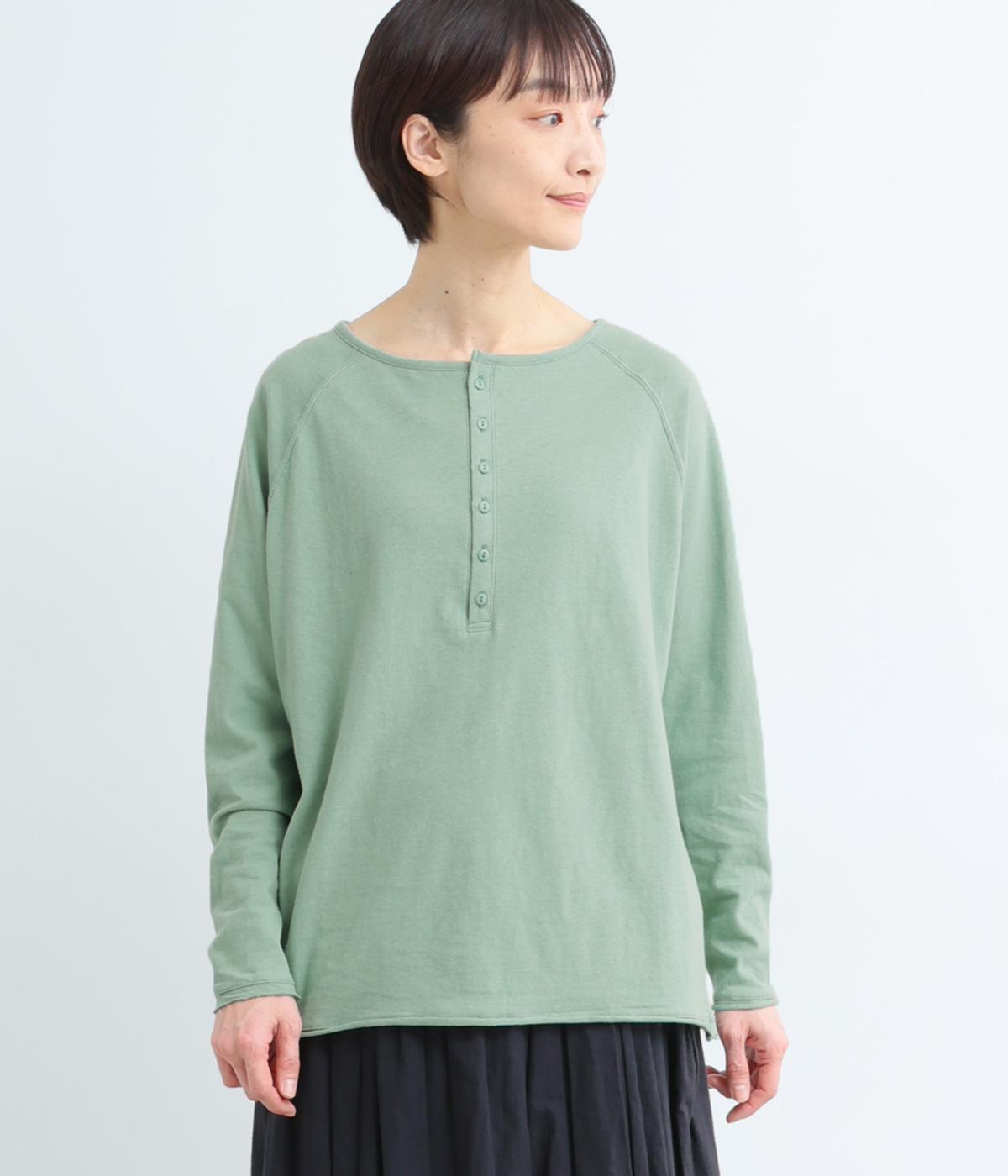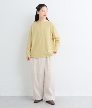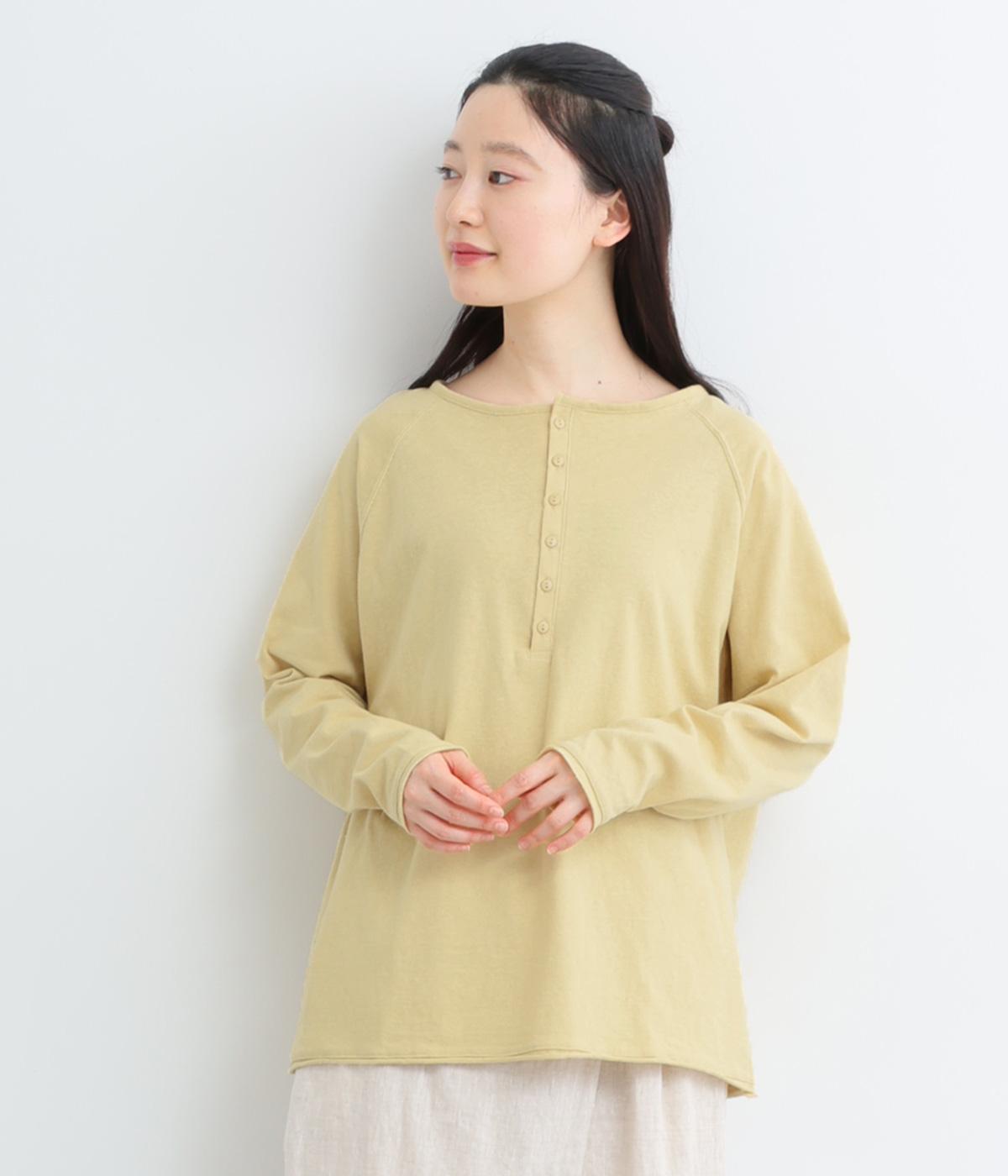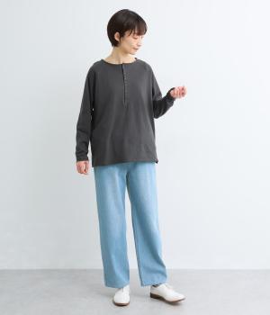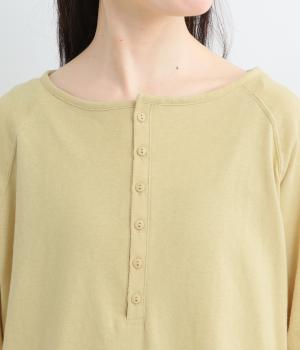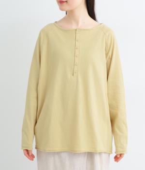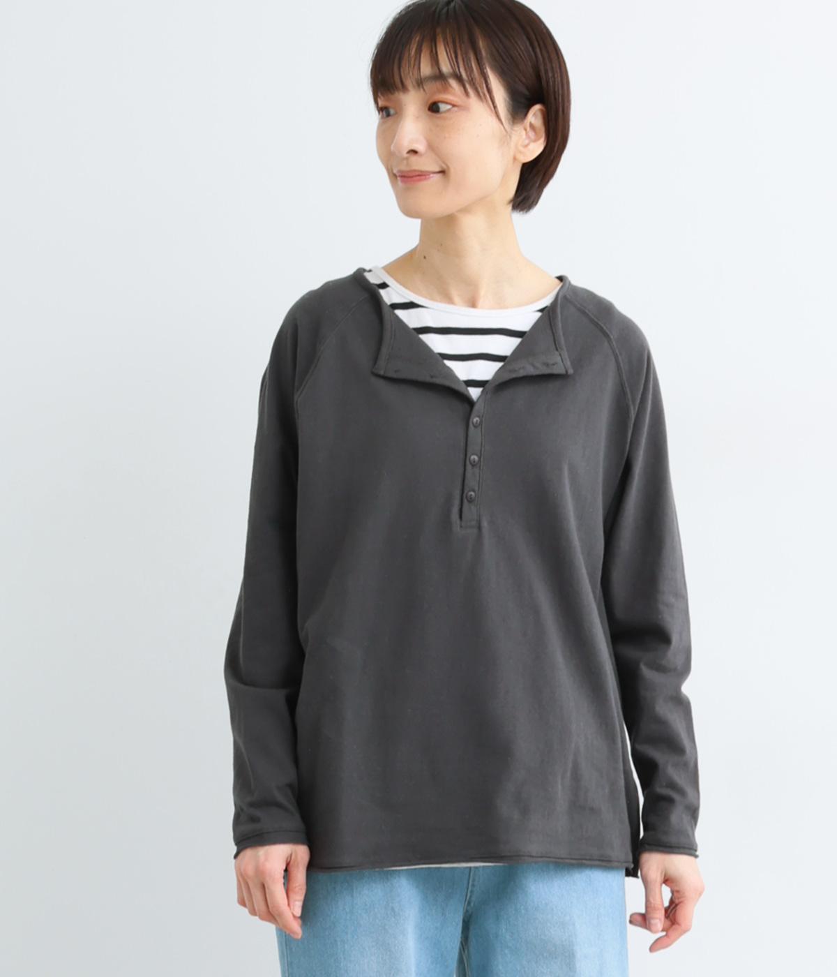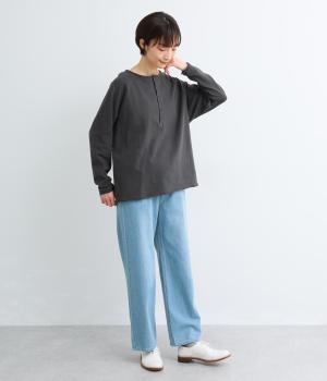 カジュアルな印象のヘンリーネックTシャツを、ニュアンスのある素材で仕立てました。肩まわりを華奢に見せるラグランスリーブがラフな風合いを中和し、大人の装いになじみます。背中の切り替えラインもさりげなくアクセントを添えています。