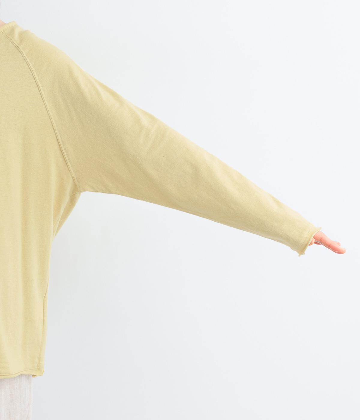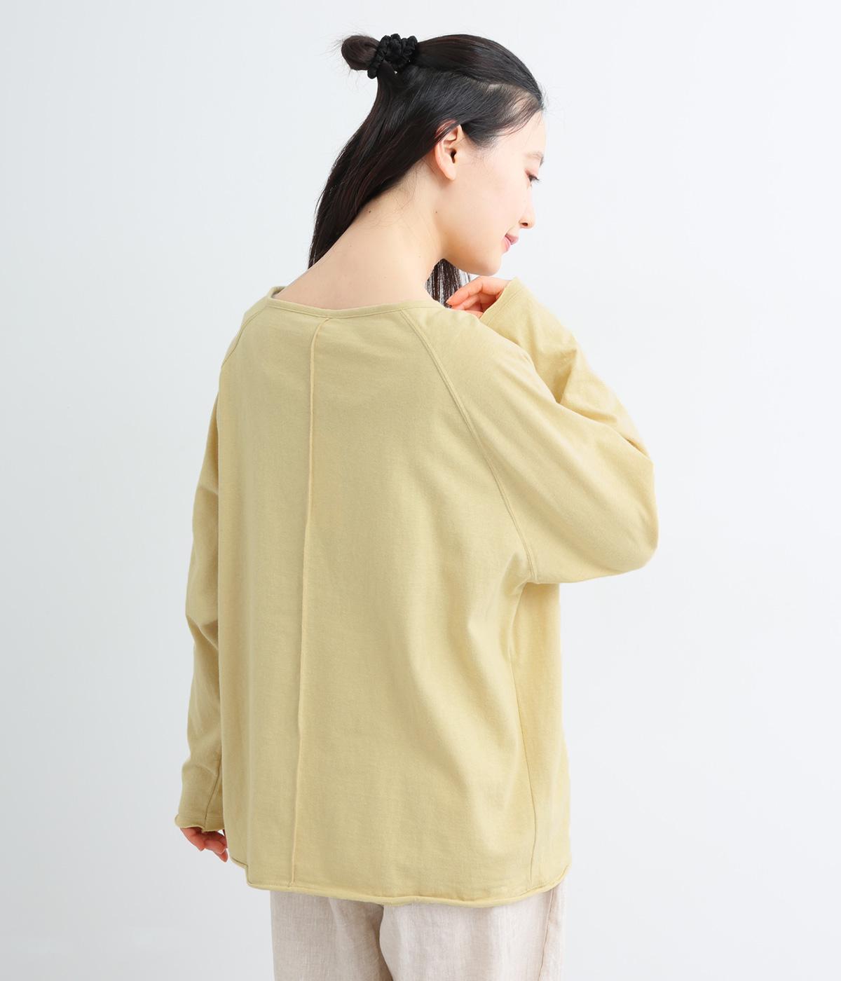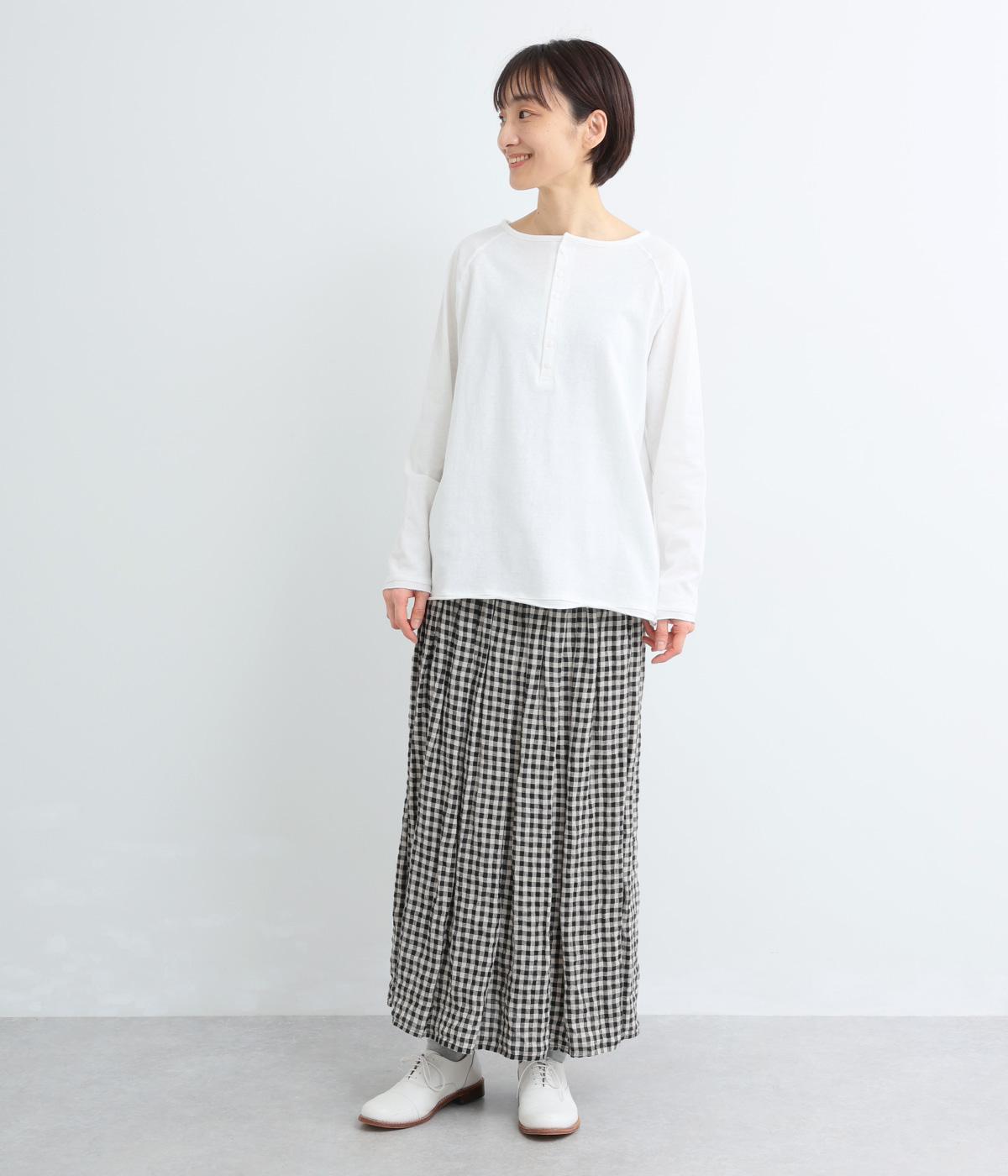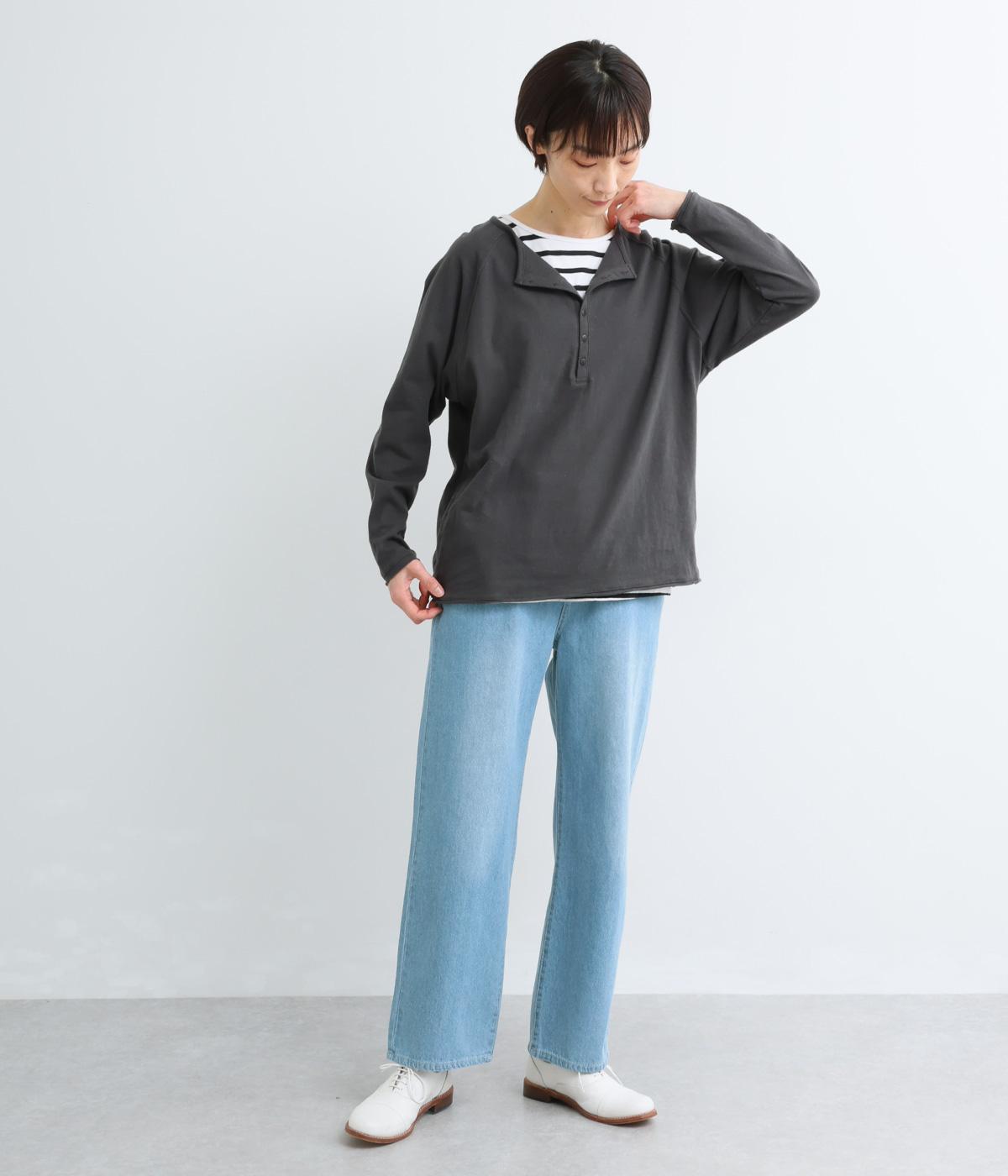 カジュアルな印象のヘンリーネックTシャツを、ニュアンスのある素材で仕立てました。肩まわりを華奢に見せるラグランスリーブがラフな風合いを中和し、大人の装いになじみます。背中の切り替えラインもさりげなくアクセントを添えています。