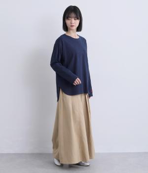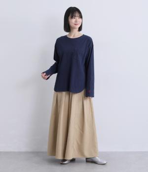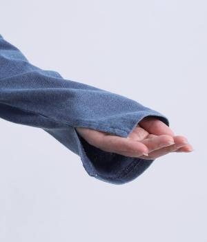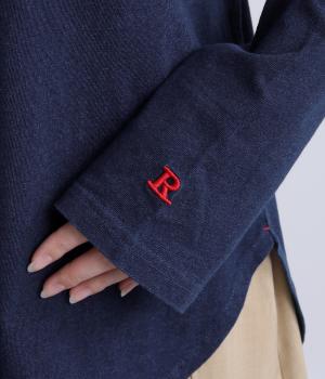 胸ポケットや袖口のワンポイント刺しゅうが特徴の一枚。着丈は前後差をつけ、大きくラウンドさせて動きを加えています。手元はスリット入りで適度な抜け感をもたせ、刺しゅうに合わせた閂止めの配色がアクセントに。