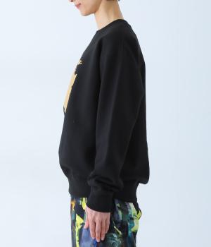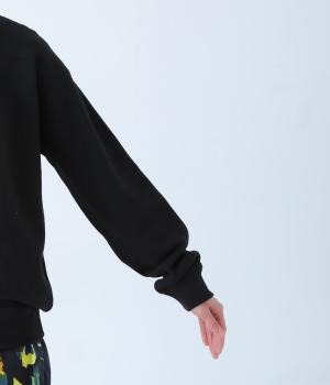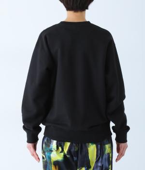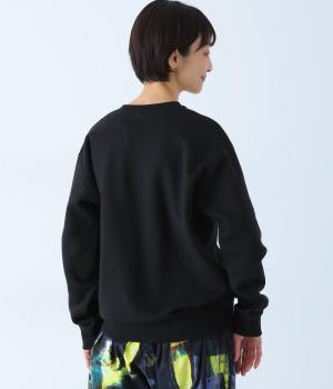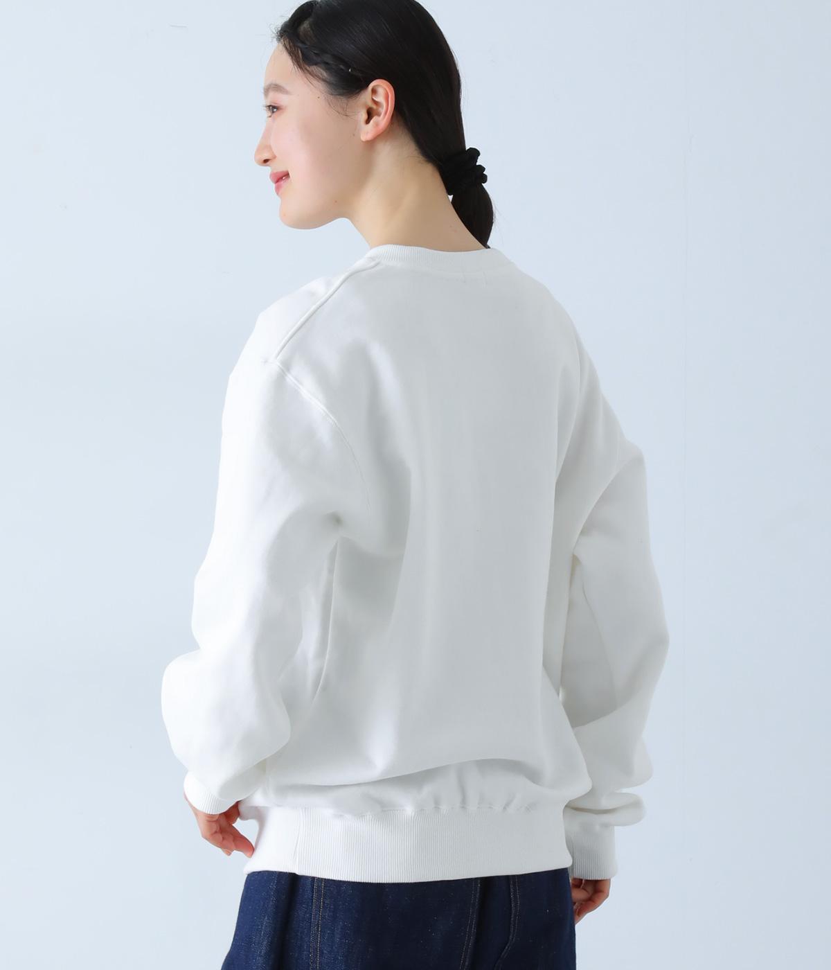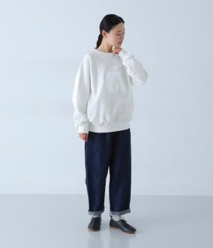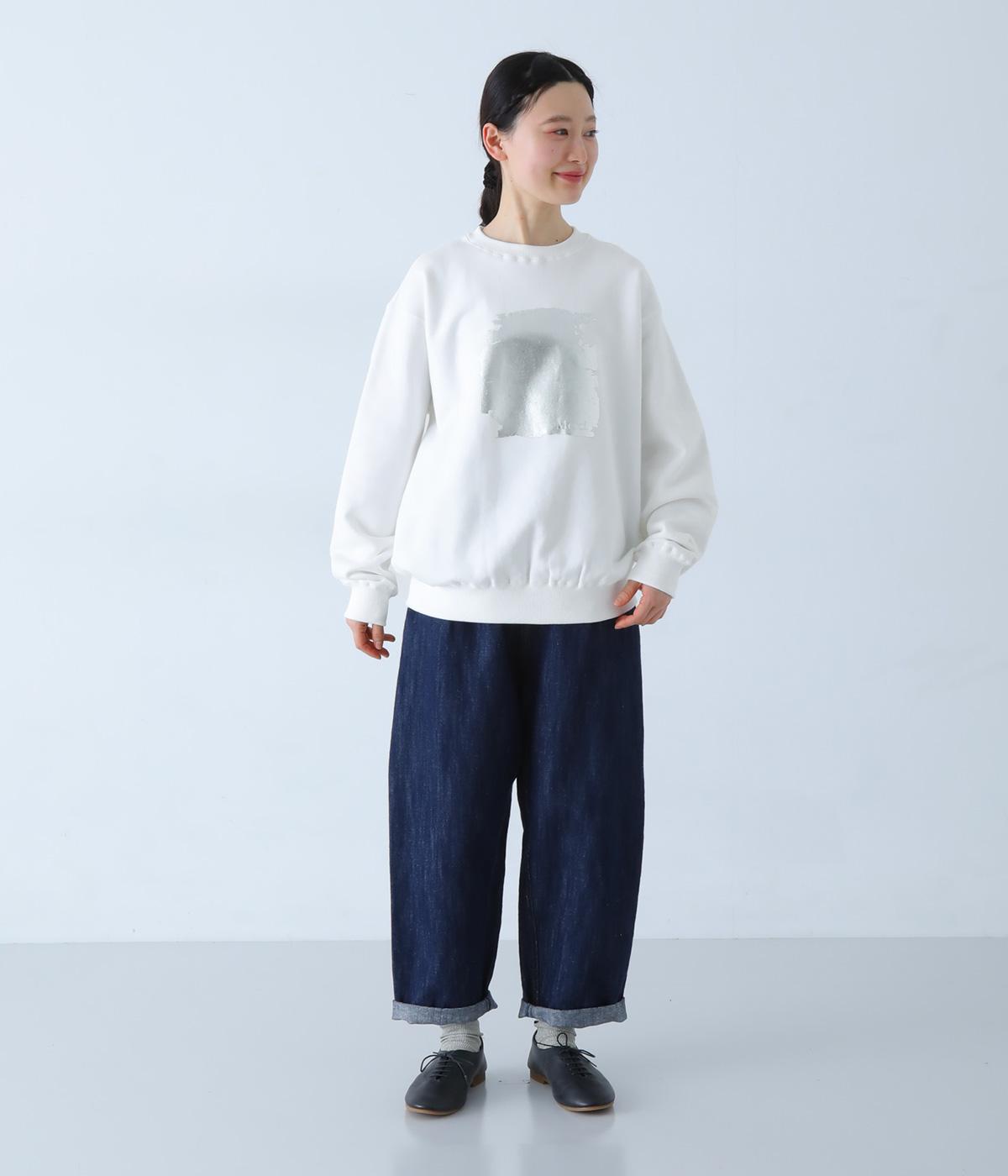 ふっくらと空気を含み、保温性や吸湿性に優れたコットン裏毛生地です。胸元の柄は箔プリントで表現しました。ほどよい厚みでデイリーに取り入れやすい素材感です。